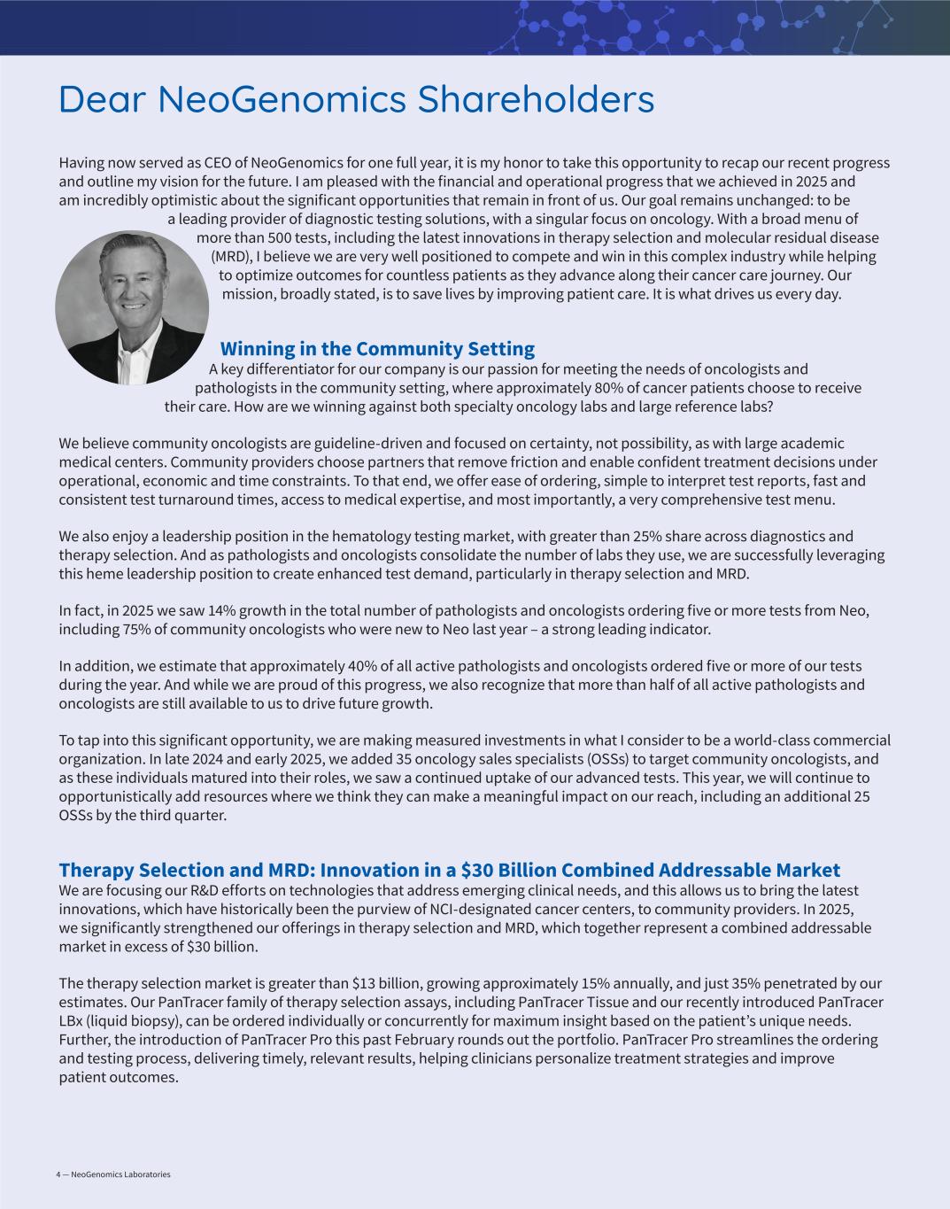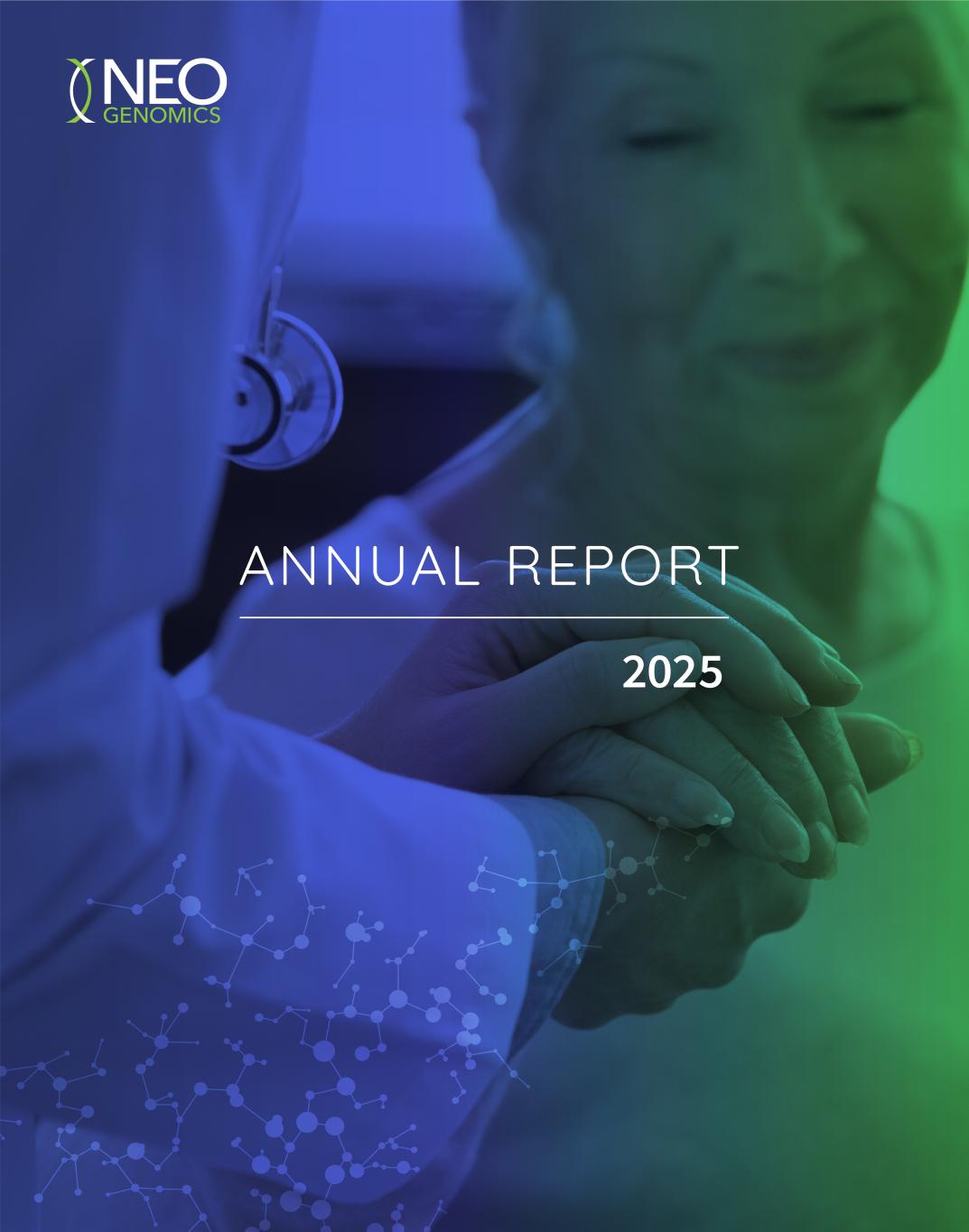 4 — NeoGenomics Laboratories Having now served as CEO of NeoGenomics for one full year, it is my honor to take this opportunity to recap our recent progress and outline my vision for the future. I am pleased with the financial and operational progress that we achieved in 2025 and am incredibly optimistic about the significant opportunities that remain in front of us. Our goal remains unchanged: to be a leading provider of diagnostic testing solutions, with a singular focus on oncology. With a broad menu of more than 500 tests, including the latest innovations in therapy selection and molecular residual disease (MRD), I believe we are very well positioned to compete and win in this complex industry while helping to optimize outcomes for countless patients as they advance along their cancer care journey. Our mission, broadly stated, is to save lives by improving patient care. It is what drives us every day. Winning in the Community Setting A key differentiator for our company is our passion for meeting the needs of oncologists and pathologists in the community setting, where approximately 80% of cancer patients choose to receive their care. How are we winning against both specialty oncology labs and large reference labs? We believe community oncologists are guideline-driven and focused on certainty, not possibility, as with large academic medical centers. Community providers choose partners that remove friction and enable confident treatment decisions under operational, economic and time constraints. To that end, we offer ease of ordering, simple to interpret test reports, fast and consistent test turnaround times, access to medical expertise, and most importantly, a very comprehensive test menu. We also enjoy a leadership position in the hematology testing market, with greater than 25% share across diagnostics and therapy selection. And as pathologists and oncologists consolidate the number of labs they use, we are successfully leveraging this heme leadership position to create enhanced test demand, particularly in therapy selection and MRD. In fact, in 2025 we saw 14% growth in the total number of pathologists and oncologists ordering five or more tests from Neo, including 75% of community oncologists who were new to Neo last year – a strong leading indicator. In addition, we estimate that approximately 40% of all active pathologists and oncologists ordered five or more of our tests during the year. And while we are proud of this progress, we also recognize that more than half of all active pathologists and oncologists are still available to us to drive future growth. To tap into this significant opportunity, we are making measured investments in what I consider to be a world-class commercial organization. In late 2024 and early 2025, we added 35 oncology sales specialists (OSSs) to target community oncologists, and as these individuals matured into their roles, we saw a continued uptake of our advanced tests. This year, we will continue to opportunistically add resources where we think they can make a meaningful impact on our reach, including an additional 25 OSSs by the third quarter. Therapy Selection and MRD: Innovation in a $30 Billion Combined Addressable Market We are focusing our R&D efforts on technologies that address emerging clinical needs, and this allows us to bring the latest innovations, which have historically been the purview of NCI-designated cancer centers, to community providers. In 2025, we significantly strengthened our offerings in therapy selection and MRD, which together represent a combined addressable market in excess of $30 billion. The therapy selection market is greater than $13 billion, growing approximately 15% annually, and just 35% penetrated by our estimates. Our PanTracer family of therapy selection assays, including PanTracer Tissue and our recently introduced PanTracer LBx (liquid biopsy), can be ordered individually or concurrently for maximum insight based on the patient’s unique needs. Further, the introduction of PanTracer Pro this past February rounds out the portfolio. PanTracer Pro streamlines the ordering and testing process, delivering timely, relevant results, helping clinicians personalize treatment strategies and improve patient outcomes. Dear NeoGenomics Shareholders