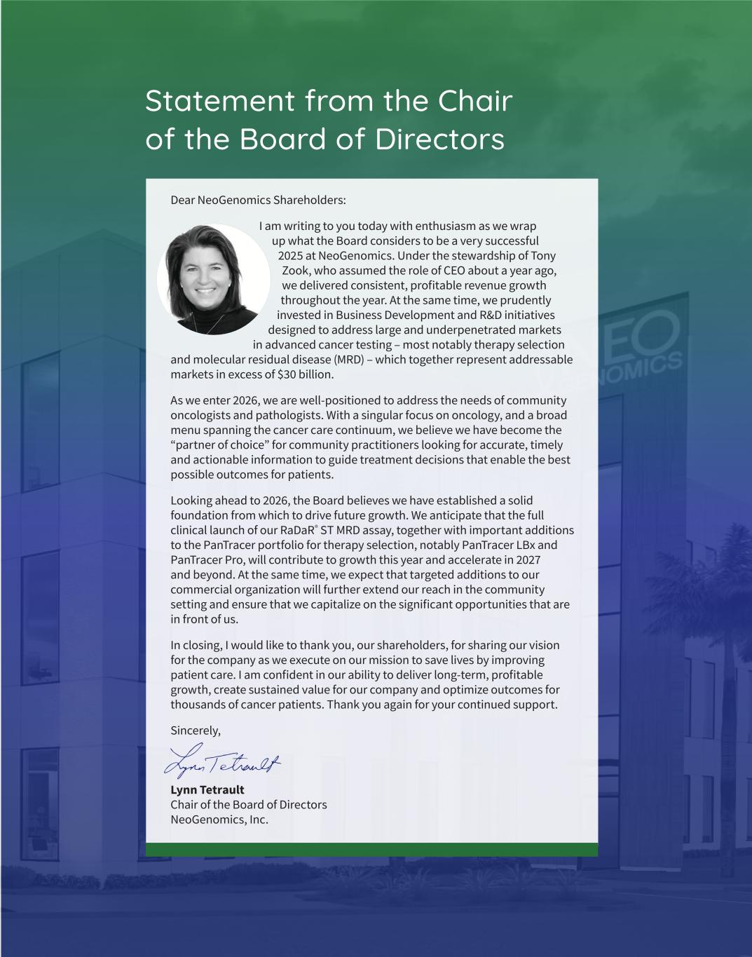 Statement from the Chair of the Board of Directors Dear NeoGenomics Shareholders: I am writing to you today with enthusiasm as we wrap up what the Board considers to be a very successful 2025 at NeoGenomics. Under the stewardship of Tony Zook, who assumed the role of CEO about a year ago, we delivered consistent, profitable revenue growth throughout the year. At the same time, we prudently invested in Business Development and R&D initiatives designed to address large and underpenetrated markets in advanced cancer testing – most notably therapy selection and molecular residual disease (MRD) – which together represent addressable markets in excess of $30 billion. As we enter 2026, we are well-positioned to address the needs of community oncologists and pathologists. With a singular focus on oncology, and a broad menu spanning the cancer care continuum, we believe we have become the “partner of choice” for community practitioners looking for accurate, timely and actionable information to guide treatment decisions that enable the best possible outcomes for patients. Looking ahead to 2026, the Board believes we have established a solid foundation from which to drive future growth. We anticipate that the full clinical launch of our RaDaR® ST MRD assay, together with important additions to the PanTracer portfolio for therapy selection, notably PanTracer LBx and PanTracer Pro, will contribute to growth this year and accelerate in 2027 and beyond. At the same time, we expect that targeted additions to our commercial organization will further extend our reach in the community setting and ensure that we capitalize on the significant opportunities that are in front of us. In closing, I would like to thank you, our shareholders, for sharing our vision for the company as we execute on our mission to save lives by improving patient care. I am confident in our ability to deliver long-term, profitable growth, create sustained value for our company and optimize outcomes for thousands of cancer patients. Thank you again for your continued support. Sincerely, Lynn Tetrault Chair of the Board of Directors NeoGenomics, Inc.