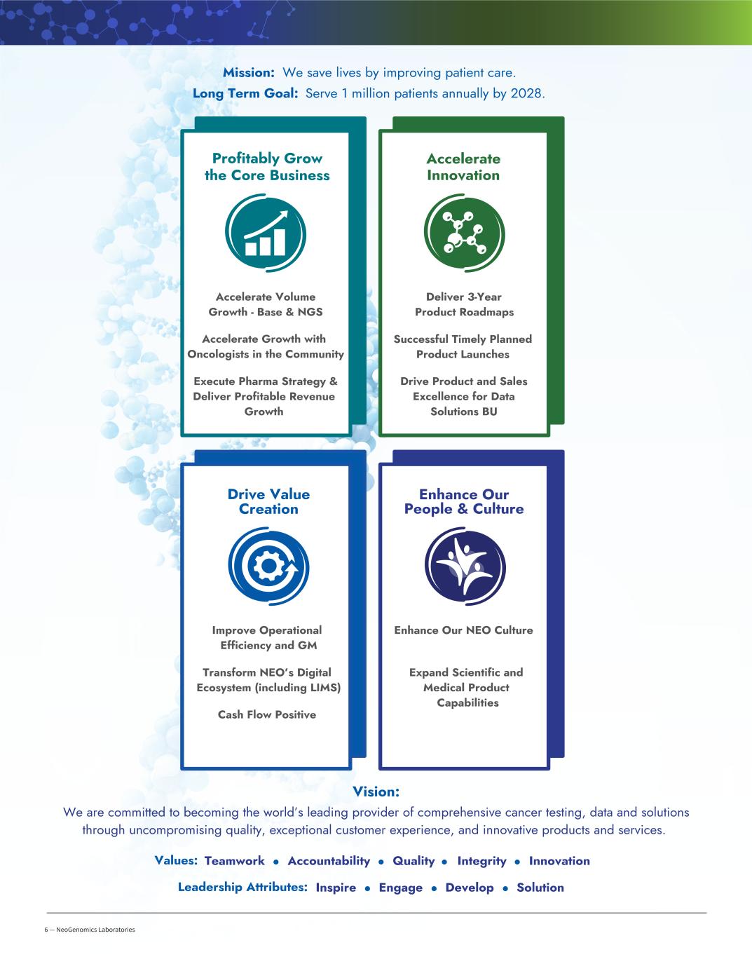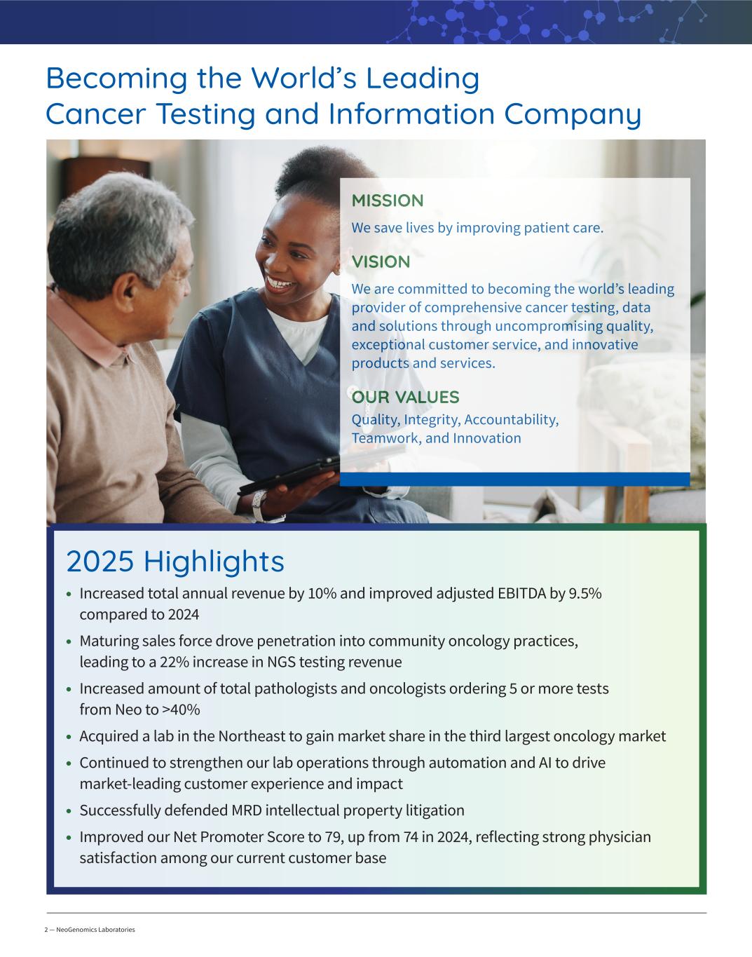2 — NeoGenomics Laboratories Becoming the World’s Leading Cancer Testing and Information Company MISSION We save lives by improving patient care. VISION We are committed to becoming the world’s leading provider of comprehensive cancer testing, data and solutions through uncompromising quality, exceptional customer service, and innovative products and services. OUR VALUES Quality, Integrity, Accountability, Teamwork, and Innovation 2025 Highlights • Increased total annual revenue by 10% and improved adjusted EBITDA by 9.5% compared to 2024 • Maturing sales force drove penetration into community oncology practices, leading to a 22% increase in NGS testing revenue • Increased amount of total pathologists and oncologists ordering 5 or more tests from Neo to >40% • Acquired a lab in the Northeast to gain market share in the third largest oncology market • Continued to strengthen our lab operations through automation and AI to drive market-leading customer experience and impact • Successfully defended MRD intellectual property litigation • Improved our Net Promoter Score to 79, up from 74 in 2024, reflecting strong physician satisfaction among our current customer base