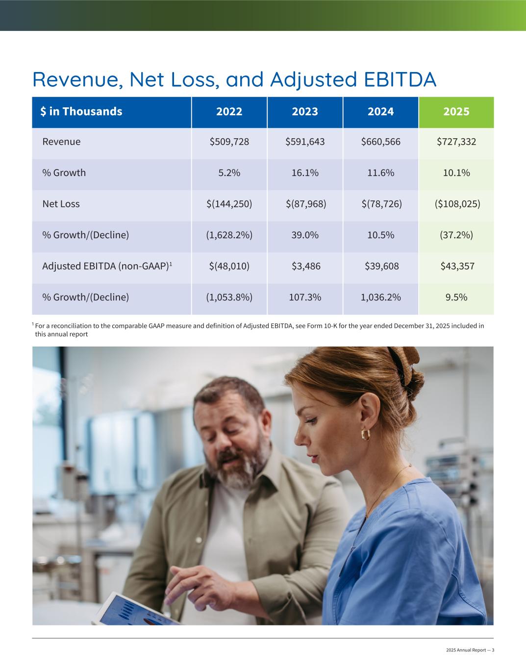 2025 Annual Report — 3 $ in Thousands 2022 2023 2024 2025 Revenue $509,728 $591,643 $660,566 $727,332 % Growth 5.2% 16.1% 11.6% 10.1% Net Loss $(144,250) $(87,968) $(78,726) ($108,025) % Growth/(Decline) (1,628.2%) 39.0% 10.5% (37.2%) Adjusted EBITDA (non-GAAP)1 $(48,010) $3,486 $39,608 $43,357 % Growth/(Decline) (1,053.8%) 107.3% 1,036.2% 9.5% 1 For a reconciliation to the comparable GAAP measure and definition of Adjusted EBITDA, see Form 10-K for the year ended December 31, 2025 included in this annual report Revenue, Net Loss, and Adjusted EBITDA