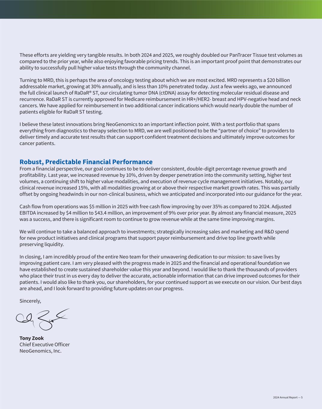 These efforts are yielding very tangible results. In both 2024 and 2025, we roughly doubled our PanTracer Tissue test volumes as compared to the prior year, while also enjoying favorable pricing trends. This is an important proof point that demonstrates our ability to successfully pull higher value tests through the community channel. Turning to MRD, this is perhaps the area of oncology testing about which we are most excited. MRD represents a $20 billion addressable market, growing at 30% annually, and is less than 10% penetrated today. Just a few weeks ago, we announced the full clinical launch of RaDaR® ST, our circulating tumor DNA (ctDNA) assay for detecting molecular residual disease and recurrence. RaDaR ST is currently approved for Medicare reimbursement in HR+/HER2- breast and HPV-negative head and neck cancers. We have applied for reimbursement in two additional cancer indications which would nearly double the number of patients eligible for RaDaR ST testing. I believe these latest innovations bring NeoGenomics to an important inflection point. With a test portfolio that spans everything from diagnostics to therapy selection to MRD, we are well positioned to be the “partner of choice” to providers to deliver timely and accurate test results that can support confident treatment decisions and ultimately improve outcomes for cancer patients. Robust, Predictable Financial Performance From a financial perspective, our goal continues to be to deliver consistent, double-digit percentage revenue growth and profitability. Last year, we increased revenue by 10%, driven by deeper penetration into the community setting, higher test volumes, a continuing shift to higher value modalities, and execution of revenue cycle management initiatives. Notably, our clinical revenue increased 15%, with all modalities growing at or above their respective market growth rates. This was partially offset by ongoing headwinds in our non-clinical business, which we anticipated and incorporated into our guidance for the year. Cash flow from operations was $5 million in 2025 with free cash flow improving by over 35% as compared to 2024. Adjusted EBITDA increased by $4 million to $43.4 million, an improvement of 9% over prior year. By almost any financial measure, 2025 was a success, and there is significant room to continue to grow revenue while at the same time improving margins. We will continue to take a balanced approach to investments; strategically increasing sales and marketing and R&D spend for new product initiatives and clinical programs that support payor reimbursement and drive top line growth while preserving liquidity. In closing, I am incredibly proud of the entire Neo team for their unwavering dedication to our mission: to save lives by improving patient care. I am very pleased with the progress made in 2025 and the financial and operational foundation we have established to create sustained shareholder value this year and beyond. I would like to thank the thousands of providers who place their trust in us every day to deliver the accurate, actionable information that can drive improved outcomes for their patients. I would also like to thank you, our shareholders, for your continued support as we execute on our vision. Our best days are ahead, and I look forward to providing future updates on our progress. Sincerely, Tony Zook Chief Executive Officer NeoGenomics, Inc. 2024 Annual Report — 5