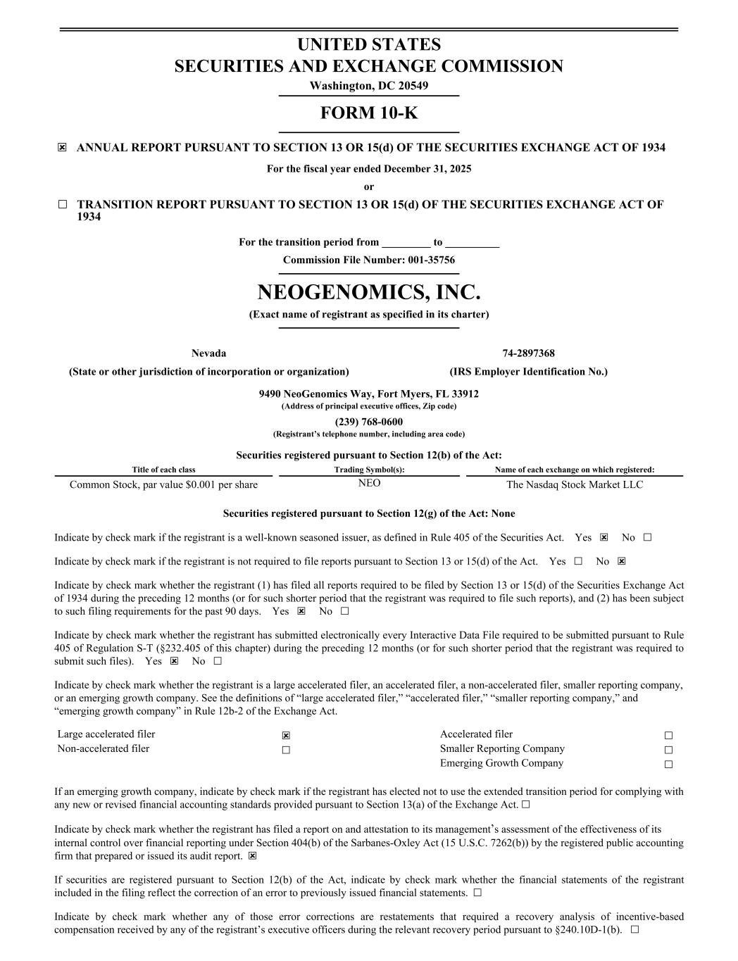 UNITED STATES SECURITIES AND EXCHANGE COMMISSION Washington, DC 20549 FORM 10-K ☒ ANNUAL REPORT PURSUANT TO SECTION 13 OR 15(d) OF THE SECURITIES EXCHANGE ACT OF 1934 For the fiscal year ended December 31, 2025 or ☐ TRANSITION REPORT PURSUANT TO SECTION 13 OR 15(d) OF THE SECURITIES EXCHANGE ACT OF 1934 For the transition period from _________ to __________ Commission File Number: 001-35756 NEOGENOMICS, INC. (Exact name of registrant as specified in its charter) Nevada 74-2897368 (State or other jurisdiction of incorporation or organization) (IRS Employer Identification No.) 9490 NeoGenomics Way, Fort Myers, FL 33912 (Address of principal executive offices, Zip code) (239) 768-0600 (Registrant’s telephone number, including area code) Securities registered pursuant to Section 12(b) of the Act: Title of each class Trading Symbol(s): Name of each exchange on which registered: Common Stock, par value $0.001 per share NEO The Nasdaq Stock Market LLC Securities registered pursuant to Section 12(g) of the Act: None Indicate by check mark if the registrant is a well-known seasoned issuer, as defined in Rule 405 of the Securities Act. Yes ☒ No ☐ Indicate by check mark if the registrant is not required to file reports pursuant to Section 13 or 15(d) of the Act. Yes ☐ No ☒ Indicate by check mark whether the registrant (1) has filed all reports required to be filed by Section 13 or 15(d) of the Securities Exchange Act of 1934 during the preceding 12 months (or for such shorter period that the registrant was required to file such reports), and (2) has been subject to such filing requirements for the past 90 days. Yes ☒ No ☐ Indicate by check mark whether the registrant has submitted electronically every Interactive Data File required to be submitted pursuant to Rule 405 of Regulation S-T (§232.405 of this chapter) during the preceding 12 months (or for such shorter period that the registrant was required to submit such files). Yes ☒ No ☐ Indicate by check mark whether the registrant is a large accelerated filer, an accelerated filer, a non-accelerated filer, smaller reporting company, or an emerging growth company. See the definitions of “large accelerated filer,” “accelerated filer,” “smaller reporting company,” and “emerging growth company” in Rule 12b-2 of the Exchange Act. Large accelerated filer ☒ Accelerated filer ☐ Non-accelerated filer ☐ Smaller Reporting Company ☐ Emerging Growth Company ☐ If an emerging growth company, indicate by check mark if the registrant has elected not to use the extended transition period for complying with any new or revised financial accounting standards provided pursuant to Section 13(a) of the Exchange Act. ☐ Indicate by check mark whether the registrant has filed a report on and attestation to its management’s assessment of the effectiveness of its internal control over financial reporting under Section 404(b) of the Sarbanes-Oxley Act (15 U.S.C. 7262(b)) by the registered public accounting firm that prepared or issued its audit report. ☒ If securities are registered pursuant to Section 12(b) of the Act, indicate by check mark whether the financial statements of the registrant included in the filing reflect the correction of an error to previously issued financial statements. ☐ Indicate by check mark whether any of those error corrections are restatements that required a recovery analysis of incentive-based compensation received by any of the registrant’s executive officers during the relevant recovery period pursuant to §240.10D-1(b). ☐