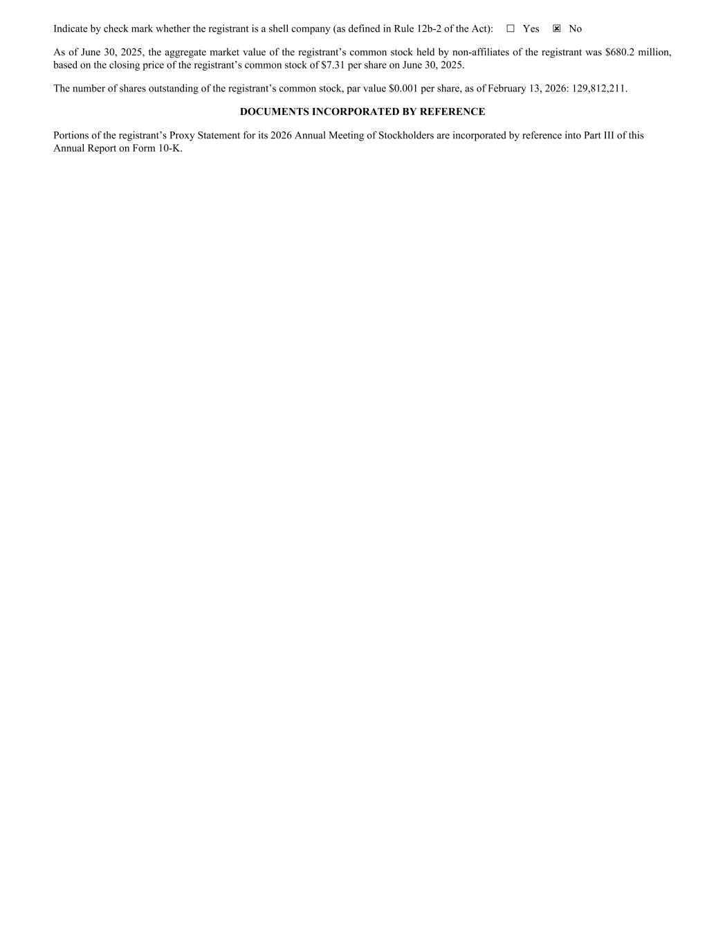Indicate by check mark whether the registrant is a shell company (as defined in Rule 12b-2 of the Act): ☐ Yes ☒ No As of June 30, 2025, the aggregate market value of the registrant’s common stock held by non-affiliates of the registrant was $680.2 million, based on the closing price of the registrant’s common stock of $7.31 per share on June 30, 2025. The number of shares outstanding of the registrant’s common stock, par value $0.001 per share, as of February 13, 2026: 129,812,211. DOCUMENTS INCORPORATED BY REFERENCE Portions of the registrant’s Proxy Statement for its 2026 Annual Meeting of Stockholders are incorporated by reference into Part III of this Annual Report on Form 10-K.