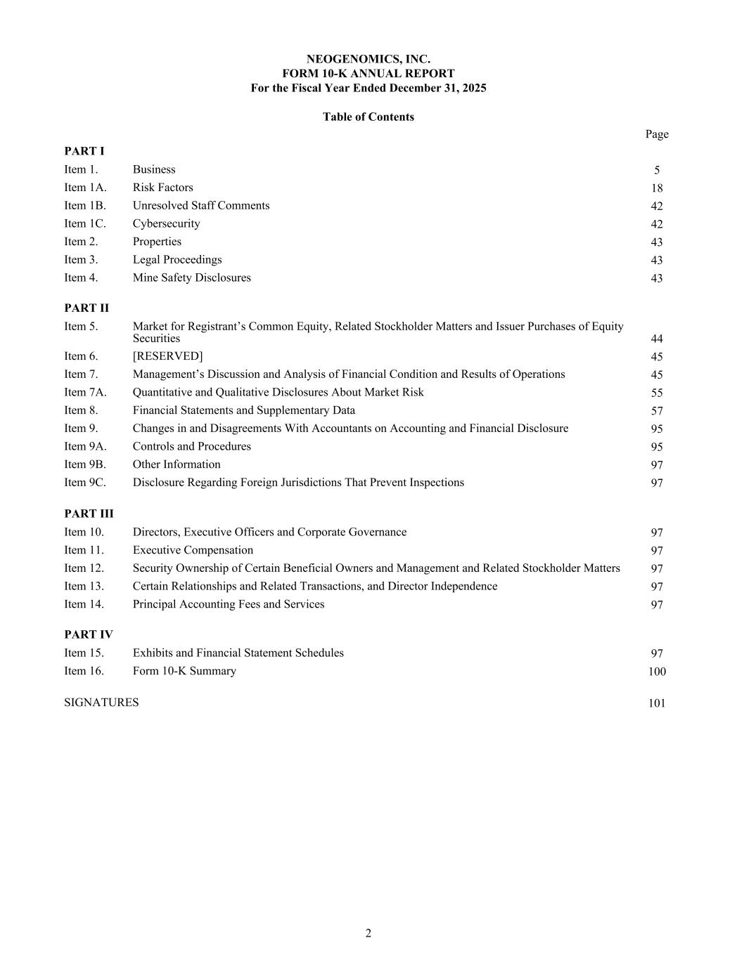 NEOGENOMICS, INC. FORM 10-K ANNUAL REPORT For the Fiscal Year Ended December 31, 2025 Table of Contents Page PART I Item 1. Business 5 Item 1A. Risk Factors 18 Item 1B. Unresolved Staff Comments 42 Item 1C. Cybersecurity 42 Item 2. Properties 43 Item 3. Legal Proceedings 43 Item 4. Mine Safety Disclosures 43 PART II Item 5. Market for Registrant’s Common Equity, Related Stockholder Matters and Issuer Purchases of Equity Securities 44 Item 6. [RESERVED] 45 Item 7. Management’s Discussion and Analysis of Financial Condition and Results of Operations 45 Item 7A. Quantitative and Qualitative Disclosures About Market Risk 55 Item 8. Financial Statements and Supplementary Data 57 Item 9. Changes in and Disagreements With Accountants on Accounting and Financial Disclosure 95 Item 9A. Controls and Procedures 95 Item 9B. Other Information 97 Item 9C. Disclosure Regarding Foreign Jurisdictions That Prevent Inspections 97 PART III Item 10. Directors, Executive Officers and Corporate Governance 97 Item 11. Executive Compensation 97 Item 12. Security Ownership of Certain Beneficial Owners and Management and Related Stockholder Matters 97 Item 13. Certain Relationships and Related Transactions, and Director Independence 97 Item 14. Principal Accounting Fees and Services 97 PART IV Item 15. Exhibits and Financial Statement Schedules 97 Item 16. Form 10-K Summary 100 SIGNATURES 101 2