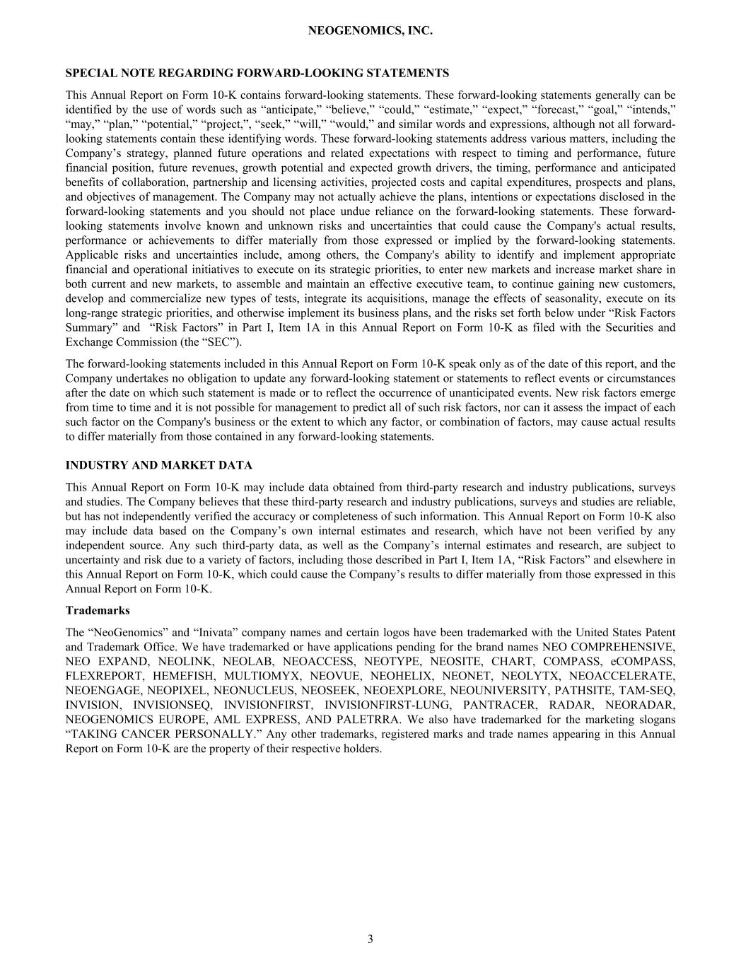 SPECIAL NOTE REGARDING FORWARD-LOOKING STATEMENTS This Annual Report on Form 10-K contains forward-looking statements. These forward-looking statements generally can be identified by the use of words such as “anticipate,” “believe,” “could,” “estimate,” “expect,” “forecast,” “goal,” “intends,” “may,” “plan,” “potential,” “project,”, “seek,” “will,” “would,” and similar words and expressions, although not all forward- looking statements contain these identifying words. These forward-looking statements address various matters, including the Company’s strategy, planned future operations and related expectations with respect to timing and performance, future financial position, future revenues, growth potential and expected growth drivers, the timing, performance and anticipated benefits of collaboration, partnership and licensing activities, projected costs and capital expenditures, prospects and plans, and objectives of management. The Company may not actually achieve the plans, intentions or expectations disclosed in the forward-looking statements and you should not place undue reliance on the forward-looking statements. These forward- looking statements involve known and unknown risks and uncertainties that could cause the Company's actual results, performance or achievements to differ materially from those expressed or implied by the forward-looking statements. Applicable risks and uncertainties include, among others, the Company's ability to identify and implement appropriate financial and operational initiatives to execute on its strategic priorities, to enter new markets and increase market share in both current and new markets, to assemble and maintain an effective executive team, to continue gaining new customers, develop and commercialize new types of tests, integrate its acquisitions, manage the effects of seasonality, execute on its long-range strategic priorities, and otherwise implement its business plans, and the risks set forth below under “Risk Factors Summary” and “Risk Factors” in Part I, Item 1A in this Annual Report on Form 10-K as filed with the Securities and Exchange Commission (the “SEC”). The forward-looking statements included in this Annual Report on Form 10-K speak only as of the date of this report, and the Company undertakes no obligation to update any forward-looking statement or statements to reflect events or circumstances after the date on which such statement is made or to reflect the occurrence of unanticipated events. New risk factors emerge from time to time and it is not possible for management to predict all of such risk factors, nor can it assess the impact of each such factor on the Company's business or the extent to which any factor, or combination of factors, may cause actual results to differ materially from those contained in any forward-looking statements. INDUSTRY AND MARKET DATA This Annual Report on Form 10-K may include data obtained from third-party research and industry publications, surveys and studies. The Company believes that these third-party research and industry publications, surveys and studies are reliable, but has not independently verified the accuracy or completeness of such information. This Annual Report on Form 10-K also may include data based on the Company’s own internal estimates and research, which have not been verified by any independent source. Any such third-party data, as well as the Company’s internal estimates and research, are subject to uncertainty and risk due to a variety of factors, including those described in Part I, Item 1A, “Risk Factors” and elsewhere in this Annual Report on Form 10-K, which could cause the Company’s results to differ materially from those expressed in this Annual Report on Form 10-K. Trademarks The “NeoGenomics” and “Inivata” company names and certain logos have been trademarked with the United States Patent and Trademark Office. We have trademarked or have applications pending for the brand names NEO COMPREHENSIVE, NEO EXPAND, NEOLINK, NEOLAB, NEOACCESS, NEOTYPE, NEOSITE, CHART, COMPASS, eCOMPASS, FLEXREPORT, HEMEFISH, MULTIOMYX, NEOVUE, NEOHELIX, NEONET, NEOLYTX, NEOACCELERATE, NEOENGAGE, NEOPIXEL, NEONUCLEUS, NEOSEEK, NEOEXPLORE, NEOUNIVERSITY, PATHSITE, TAM-SEQ, INVISION, INVISIONSEQ, INVISIONFIRST, INVISIONFIRST-LUNG, PANTRACER, RADAR, NEORADAR, NEOGENOMICS EUROPE, AML EXPRESS, AND PALETRRA. We also have trademarked for the marketing slogans “TAKING CANCER PERSONALLY.” Any other trademarks, registered marks and trade names appearing in this Annual Report on Form 10-K are the property of their respective holders. NEOGENOMICS, INC. 3
