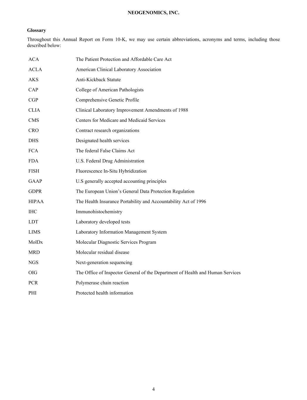 Glossary Throughout this Annual Report on Form 10-K, we may use certain abbreviations, acronyms and terms, including those described below: ACA The Patient Protection and Affordable Care Act ACLA American Clinical Laboratory Association AKS Anti-Kickback Statute CAP College of American Pathologists CGP Comprehensive Genetic Profile CLIA Clinical Laboratory Improvement Amendments of 1988 CMS Centers for Medicare and Medicaid Services CRO Contract research organizations DHS Designated health services FCA The federal False Claims Act FDA U.S. Federal Drug Administration FISH Fluorescence In-Situ Hybridization GAAP U.S generally accepted accounting principles GDPR The European Union’s General Data Protection Regulation HIPAA The Health Insurance Portability and Accountability Act of 1996 IHC Immunohistochemistry LDT Laboratory developed tests LIMS Laboratory Information Management System MolDx Molecular Diagnostic Services Program MRD Molecular residual disease NGS Next-generation sequencing OIG The Office of Inspector General of the Department of Health and Human Services PCR Polymerase chain reaction PHI Protected health information NEOGENOMICS, INC. 4