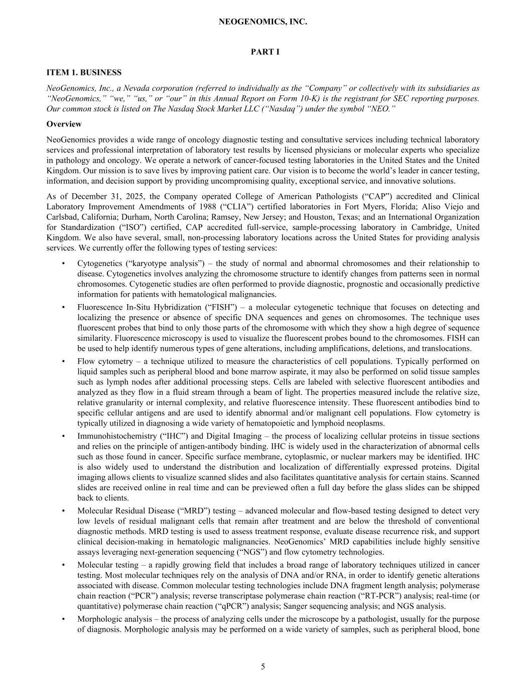 PART I ITEM 1. BUSINESS NeoGenomics, Inc., a Nevada corporation (referred to individually as the “Company” or collectively with its subsidiaries as “NeoGenomics,” “we,” “us,” or “our” in this Annual Report on Form 10-K) is the registrant for SEC reporting purposes. Our common stock is listed on The Nasdaq Stock Market LLC (“Nasdaq”) under the symbol “NEO.” Overview NeoGenomics provides a wide range of oncology diagnostic testing and consultative services including technical laboratory services and professional interpretation of laboratory test results by licensed physicians or molecular experts who specialize in pathology and oncology. We operate a network of cancer-focused testing laboratories in the United States and the United Kingdom. Our mission is to save lives by improving patient care. Our vision is to become the world’s leader in cancer testing, information, and decision support by providing uncompromising quality, exceptional service, and innovative solutions. As of December 31, 2025, the Company operated College of American Pathologists (“CAP”) accredited and Clinical Laboratory Improvement Amendments of 1988 (“CLIA”) certified laboratories in Fort Myers, Florida; Aliso Viejo and Carlsbad, California; Durham, North Carolina; Ramsey, New Jersey; and Houston, Texas; and an International Organization for Standardization (“ISO”) certified, CAP accredited full-service, sample-processing laboratory in Cambridge, United Kingdom. We also have several, small, non-processing laboratory locations across the United States for providing analysis services. We currently offer the following types of testing services: • Cytogenetics (“karyotype analysis”) – the study of normal and abnormal chromosomes and their relationship to disease. Cytogenetics involves analyzing the chromosome structure to identify changes from patterns seen in normal chromosomes. Cytogenetic studies are often performed to provide diagnostic, prognostic and occasionally predictive information for patients with hematological malignancies. • Fluorescence In-Situ Hybridization (“FISH”) – a molecular cytogenetic technique that focuses on detecting and localizing the presence or absence of specific DNA sequences and genes on chromosomes. The technique uses fluorescent probes that bind to only those parts of the chromosome with which they show a high degree of sequence similarity. Fluorescence microscopy is used to visualize the fluorescent probes bound to the chromosomes. FISH can be used to help identify numerous types of gene alterations, including amplifications, deletions, and translocations. • Flow cytometry – a technique utilized to measure the characteristics of cell populations. Typically performed on liquid samples such as peripheral blood and bone marrow aspirate, it may also be performed on solid tissue samples such as lymph nodes after additional processing steps. Cells are labeled with selective fluorescent antibodies and analyzed as they flow in a fluid stream through a beam of light. The properties measured include the relative size, relative granularity or internal complexity, and relative fluorescence intensity. These fluorescent antibodies bind to specific cellular antigens and are used to identify abnormal and/or malignant cell populations. Flow cytometry is typically utilized in diagnosing a wide variety of hematopoietic and lymphoid neoplasms. • Immunohistochemistry (“IHC”) and Digital Imaging – the process of localizing cellular proteins in tissue sections and relies on the principle of antigen-antibody binding. IHC is widely used in the characterization of abnormal cells such as those found in cancer. Specific surface membrane, cytoplasmic, or nuclear markers may be identified. IHC is also widely used to understand the distribution and localization of differentially expressed proteins. Digital imaging allows clients to visualize scanned slides and also facilitates quantitative analysis for certain stains. Scanned slides are received online in real time and can be previewed often a full day before the glass slides can be shipped back to clients. • Molecular Residual Disease (“MRD”) testing – advanced molecular and flow-based testing designed to detect very low levels of residual malignant cells that remain after treatment and are below the threshold of conventional diagnostic methods. MRD testing is used to assess treatment response, evaluate disease recurrence risk, and support clinical decision-making in hematologic malignancies. NeoGenomics’ MRD capabilities include highly sensitive assays leveraging next-generation sequencing (“NGS”) and flow cytometry technologies. • Molecular testing – a rapidly growing field that includes a broad range of laboratory techniques utilized in cancer testing. Most molecular techniques rely on the analysis of DNA and/or RNA, in order to identify genetic alterations associated with disease. Common molecular testing technologies include DNA fragment length analysis; polymerase chain reaction (“PCR”) analysis; reverse transcriptase polymerase chain reaction (“RT-PCR”) analysis; real-time (or quantitative) polymerase chain reaction (“qPCR”) analysis; Sanger sequencing analysis; and NGS analysis. • Morphologic analysis – the process of analyzing cells under the microscope by a pathologist, usually for the purpose of diagnosis. Morphologic analysis may be performed on a wide variety of samples, such as peripheral blood, bone NEOGENOMICS, INC. 5