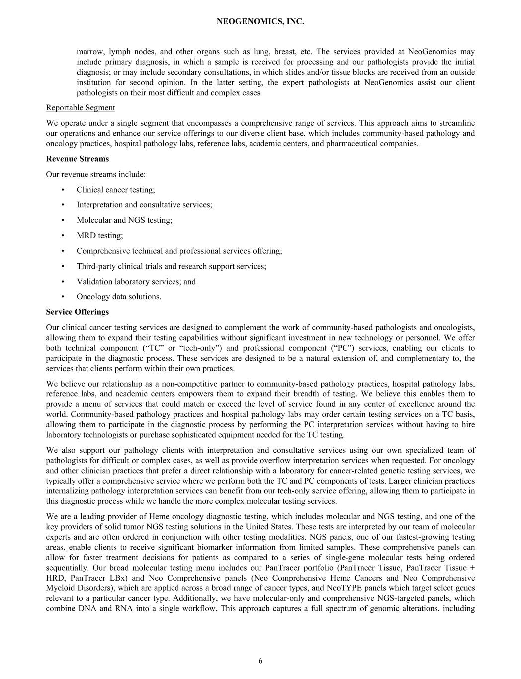 marrow, lymph nodes, and other organs such as lung, breast, etc. The services provided at NeoGenomics may include primary diagnosis, in which a sample is received for processing and our pathologists provide the initial diagnosis; or may include secondary consultations, in which slides and/or tissue blocks are received from an outside institution for second opinion. In the latter setting, the expert pathologists at NeoGenomics assist our client pathologists on their most difficult and complex cases. Reportable Segment We operate under a single segment that encompasses a comprehensive range of services. This approach aims to streamline our operations and enhance our service offerings to our diverse client base, which includes community-based pathology and oncology practices, hospital pathology labs, reference labs, academic centers, and pharmaceutical companies. Revenue Streams Our revenue streams include: • Clinical cancer testing; • Interpretation and consultative services; • Molecular and NGS testing; • MRD testing; • Comprehensive technical and professional services offering; • Third-party clinical trials and research support services; • Validation laboratory services; and • Oncology data solutions. Service Offerings Our clinical cancer testing services are designed to complement the work of community-based pathologists and oncologists, allowing them to expand their testing capabilities without significant investment in new technology or personnel. We offer both technical component (“TC” or “tech-only”) and professional component (“PC”) services, enabling our clients to participate in the diagnostic process. These services are designed to be a natural extension of, and complementary to, the services that clients perform within their own practices. We believe our relationship as a non-competitive partner to community-based pathology practices, hospital pathology labs, reference labs, and academic centers empowers them to expand their breadth of testing. We believe this enables them to provide a menu of services that could match or exceed the level of service found in any center of excellence around the world. Community-based pathology practices and hospital pathology labs may order certain testing services on a TC basis, allowing them to participate in the diagnostic process by performing the PC interpretation services without having to hire laboratory technologists or purchase sophisticated equipment needed for the TC testing. We also support our pathology clients with interpretation and consultative services using our own specialized team of pathologists for difficult or complex cases, as well as provide overflow interpretation services when requested. For oncology and other clinician practices that prefer a direct relationship with a laboratory for cancer-related genetic testing services, we typically offer a comprehensive service where we perform both the TC and PC components of tests. Larger clinician practices internalizing pathology interpretation services can benefit from our tech-only service offering, allowing them to participate in this diagnostic process while we handle the more complex molecular testing services. We are a leading provider of Heme oncology diagnostic testing, which includes molecular and NGS testing, and one of the key providers of solid tumor NGS testing solutions in the United States. These tests are interpreted by our team of molecular experts and are often ordered in conjunction with other testing modalities. NGS panels, one of our fastest-growing testing areas, enable clients to receive significant biomarker information from limited samples. These comprehensive panels can allow for faster treatment decisions for patients as compared to a series of single-gene molecular tests being ordered sequentially. Our broad molecular testing menu includes our PanTracer portfolio (PanTracer Tissue, PanTracer Tissue + HRD, PanTracer LBx) and Neo Comprehensive panels (Neo Comprehensive Heme Cancers and Neo Comprehensive Myeloid Disorders), which are applied across a broad range of cancer types, and NeoTYPE panels which target select genes relevant to a particular cancer type. Additionally, we have molecular-only and comprehensive NGS-targeted panels, which combine DNA and RNA into a single workflow. This approach captures a full spectrum of genomic alterations, including NEOGENOMICS, INC. 6