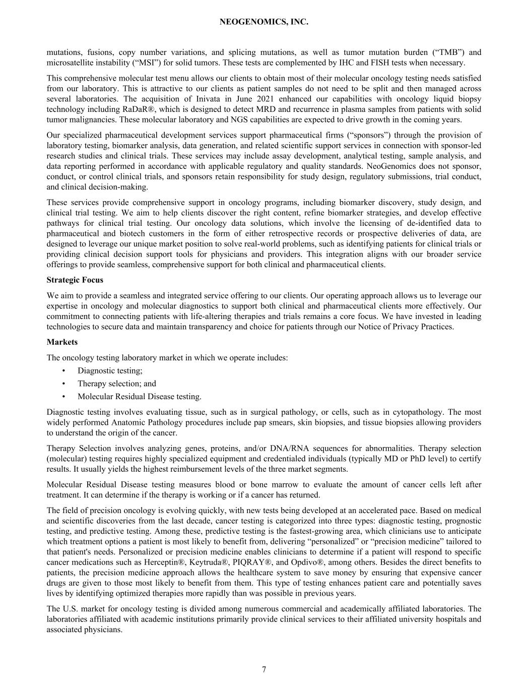 mutations, fusions, copy number variations, and splicing mutations, as well as tumor mutation burden (“TMB”) and microsatellite instability (“MSI”) for solid tumors. These tests are complemented by IHC and FISH tests when necessary. This comprehensive molecular test menu allows our clients to obtain most of their molecular oncology testing needs satisfied from our laboratory. This is attractive to our clients as patient samples do not need to be split and then managed across several laboratories. The acquisition of Inivata in June 2021 enhanced our capabilities with oncology liquid biopsy technology including RaDaR®, which is designed to detect MRD and recurrence in plasma samples from patients with solid tumor malignancies. These molecular laboratory and NGS capabilities are expected to drive growth in the coming years. Our specialized pharmaceutical development services support pharmaceutical firms (“sponsors”) through the provision of laboratory testing, biomarker analysis, data generation, and related scientific support services in connection with sponsor-led research studies and clinical trials. These services may include assay development, analytical testing, sample analysis, and data reporting performed in accordance with applicable regulatory and quality standards. NeoGenomics does not sponsor, conduct, or control clinical trials, and sponsors retain responsibility for study design, regulatory submissions, trial conduct, and clinical decision-making. These services provide comprehensive support in oncology programs, including biomarker discovery, study design, and clinical trial testing. We aim to help clients discover the right content, refine biomarker strategies, and develop effective pathways for clinical trial testing. Our oncology data solutions, which involve the licensing of de-identified data to pharmaceutical and biotech customers in the form of either retrospective records or prospective deliveries of data, are designed to leverage our unique market position to solve real-world problems, such as identifying patients for clinical trials or providing clinical decision support tools for physicians and providers. This integration aligns with our broader service offerings to provide seamless, comprehensive support for both clinical and pharmaceutical clients. Strategic Focus We aim to provide a seamless and integrated service offering to our clients. Our operating approach allows us to leverage our expertise in oncology and molecular diagnostics to support both clinical and pharmaceutical clients more effectively. Our commitment to connecting patients with life-altering therapies and trials remains a core focus. We have invested in leading technologies to secure data and maintain transparency and choice for patients through our Notice of Privacy Practices. Markets The oncology testing laboratory market in which we operate includes: • Diagnostic testing; • Therapy selection; and • Molecular Residual Disease testing. Diagnostic testing involves evaluating tissue, such as in surgical pathology, or cells, such as in cytopathology. The most widely performed Anatomic Pathology procedures include pap smears, skin biopsies, and tissue biopsies allowing providers to understand the origin of the cancer. Therapy Selection involves analyzing genes, proteins, and/or DNA/RNA sequences for abnormalities. Therapy selection (molecular) testing requires highly specialized equipment and credentialed individuals (typically MD or PhD level) to certify results. It usually yields the highest reimbursement levels of the three market segments. Molecular Residual Disease testing measures blood or bone marrow to evaluate the amount of cancer cells left after treatment. It can determine if the therapy is working or if a cancer has returned. The field of precision oncology is evolving quickly, with new tests being developed at an accelerated pace. Based on medical and scientific discoveries from the last decade, cancer testing is categorized into three types: diagnostic testing, prognostic testing, and predictive testing. Among these, predictive testing is the fastest-growing area, which clinicians use to anticipate which treatment options a patient is most likely to benefit from, delivering “personalized” or “precision medicine” tailored to that patient's needs. Personalized or precision medicine enables clinicians to determine if a patient will respond to specific cancer medications such as Herceptin®, Keytruda®, PIQRAY®, and Opdivo®, among others. Besides the direct benefits to patients, the precision medicine approach allows the healthcare system to save money by ensuring that expensive cancer drugs are given to those most likely to benefit from them. This type of testing enhances patient care and potentially saves lives by identifying optimized therapies more rapidly than was possible in previous years. The U.S. market for oncology testing is divided among numerous commercial and academically affiliated laboratories. The laboratories affiliated with academic institutions primarily provide clinical services to their affiliated university hospitals and associated physicians. NEOGENOMICS, INC. 7