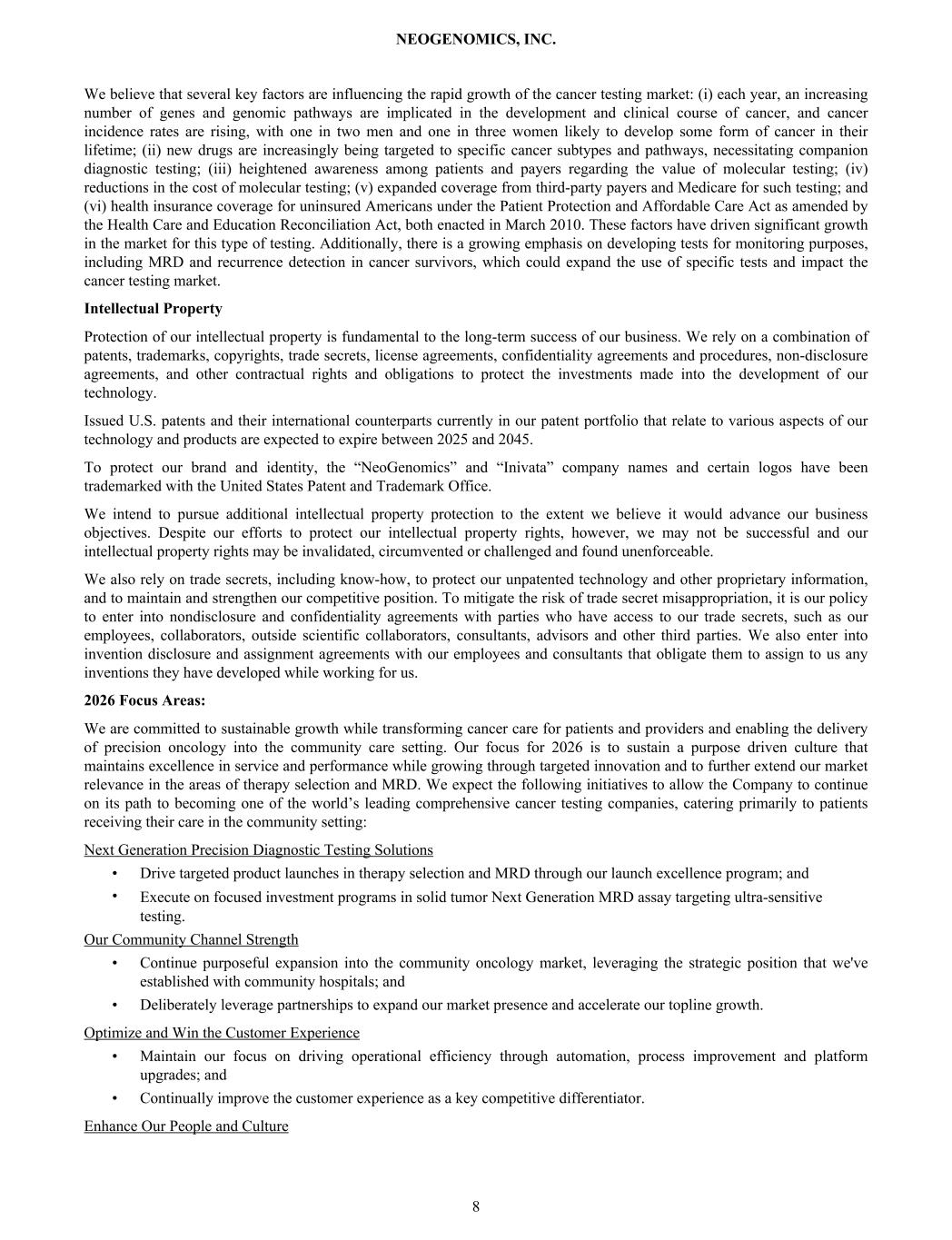 We believe that several key factors are influencing the rapid growth of the cancer testing market: (i) each year, an increasing number of genes and genomic pathways are implicated in the development and clinical course of cancer, and cancer incidence rates are rising, with one in two men and one in three women likely to develop some form of cancer in their lifetime; (ii) new drugs are increasingly being targeted to specific cancer subtypes and pathways, necessitating companion diagnostic testing; (iii) heightened awareness among patients and payers regarding the value of molecular testing; (iv) reductions in the cost of molecular testing; (v) expanded coverage from third-party payers and Medicare for such testing; and (vi) health insurance coverage for uninsured Americans under the Patient Protection and Affordable Care Act as amended by the Health Care and Education Reconciliation Act, both enacted in March 2010. These factors have driven significant growth in the market for this type of testing. Additionally, there is a growing emphasis on developing tests for monitoring purposes, including MRD and recurrence detection in cancer survivors, which could expand the use of specific tests and impact the cancer testing market. Intellectual Property Protection of our intellectual property is fundamental to the long-term success of our business. We rely on a combination of patents, trademarks, copyrights, trade secrets, license agreements, confidentiality agreements and procedures, non-disclosure agreements, and other contractual rights and obligations to protect the investments made into the development of our technology. Issued U.S. patents and their international counterparts currently in our patent portfolio that relate to various aspects of our technology and products are expected to expire between 2025 and 2045. To protect our brand and identity, the “NeoGenomics” and “Inivata” company names and certain logos have been trademarked with the United States Patent and Trademark Office. We intend to pursue additional intellectual property protection to the extent we believe it would advance our business objectives. Despite our efforts to protect our intellectual property rights, however, we may not be successful and our intellectual property rights may be invalidated, circumvented or challenged and found unenforceable. We also rely on trade secrets, including know-how, to protect our unpatented technology and other proprietary information, and to maintain and strengthen our competitive position. To mitigate the risk of trade secret misappropriation, it is our policy to enter into nondisclosure and confidentiality agreements with parties who have access to our trade secrets, such as our employees, collaborators, outside scientific collaborators, consultants, advisors and other third parties. We also enter into invention disclosure and assignment agreements with our employees and consultants that obligate them to assign to us any inventions they have developed while working for us. 2026 Focus Areas: We are committed to sustainable growth while transforming cancer care for patients and providers and enabling the delivery of precision oncology into the community care setting. Our focus for 2026 is to sustain a purpose driven culture that maintains excellence in service and performance while growing through targeted innovation and to further extend our market relevance in the areas of therapy selection and MRD. We expect the following initiatives to allow the Company to continue on its path to becoming one of the world’s leading comprehensive cancer testing companies, catering primarily to patients receiving their care in the community setting: Next Generation Precision Diagnostic Testing Solutions • Drive targeted product launches in therapy selection and MRD through our launch excellence program; and Execute on focused investment programs in solid tumor Next Generation MRD assay targeting ultra-sensitive testing. Our Community Channel Strength • Continue purposeful expansion into the community oncology market, leveraging the strategic position that we've established with community hospitals; and • Deliberately leverage partnerships to expand our market presence and accelerate our topline growth. Optimize and Win the Customer Experience • Maintain our focus on driving operational efficiency through automation, process improvement and platform upgrades; and • Continually improve the customer experience as a key competitive differentiator. Enhance Our People and Culture NEOGENOMICS, INC. 8 •