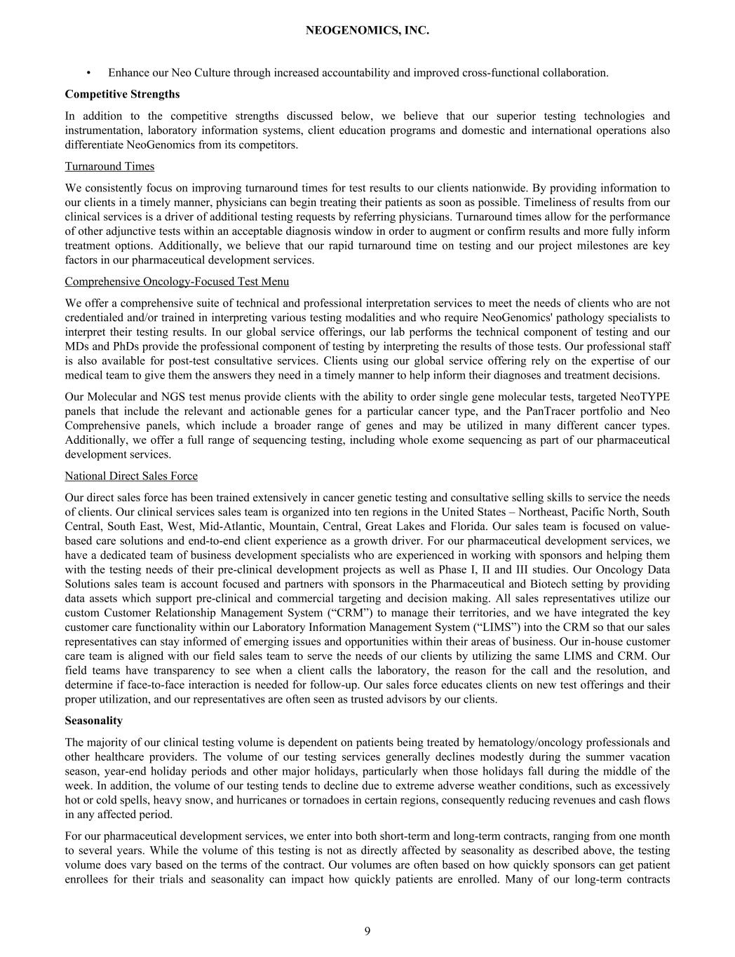 • Enhance our Neo Culture through increased accountability and improved cross-functional collaboration. Competitive Strengths In addition to the competitive strengths discussed below, we believe that our superior testing technologies and instrumentation, laboratory information systems, client education programs and domestic and international operations also differentiate NeoGenomics from its competitors. Turnaround Times We consistently focus on improving turnaround times for test results to our clients nationwide. By providing information to our clients in a timely manner, physicians can begin treating their patients as soon as possible. Timeliness of results from our clinical services is a driver of additional testing requests by referring physicians. Turnaround times allow for the performance of other adjunctive tests within an acceptable diagnosis window in order to augment or confirm results and more fully inform treatment options. Additionally, we believe that our rapid turnaround time on testing and our project milestones are key factors in our pharmaceutical development services. Comprehensive Oncology-Focused Test Menu We offer a comprehensive suite of technical and professional interpretation services to meet the needs of clients who are not credentialed and/or trained in interpreting various testing modalities and who require NeoGenomics' pathology specialists to interpret their testing results. In our global service offerings, our lab performs the technical component of testing and our MDs and PhDs provide the professional component of testing by interpreting the results of those tests. Our professional staff is also available for post-test consultative services. Clients using our global service offering rely on the expertise of our medical team to give them the answers they need in a timely manner to help inform their diagnoses and treatment decisions. Our Molecular and NGS test menus provide clients with the ability to order single gene molecular tests, targeted NeoTYPE panels that include the relevant and actionable genes for a particular cancer type, and the PanTracer portfolio and Neo Comprehensive panels, which include a broader range of genes and may be utilized in many different cancer types. Additionally, we offer a full range of sequencing testing, including whole exome sequencing as part of our pharmaceutical development services. National Direct Sales Force Our direct sales force has been trained extensively in cancer genetic testing and consultative selling skills to service the needs of clients. Our clinical services sales team is organized into ten regions in the United States – Northeast, Pacific North, South Central, South East, West, Mid-Atlantic, Mountain, Central, Great Lakes and Florida. Our sales team is focused on value- based care solutions and end-to-end client experience as a growth driver. For our pharmaceutical development services, we have a dedicated team of business development specialists who are experienced in working with sponsors and helping them with the testing needs of their pre-clinical development projects as well as Phase I, II and III studies. Our Oncology Data Solutions sales team is account focused and partners with sponsors in the Pharmaceutical and Biotech setting by providing data assets which support pre-clinical and commercial targeting and decision making. All sales representatives utilize our custom Customer Relationship Management System (“CRM”) to manage their territories, and we have integrated the key customer care functionality within our Laboratory Information Management System (“LIMS”) into the CRM so that our sales representatives can stay informed of emerging issues and opportunities within their areas of business. Our in-house customer care team is aligned with our field sales team to serve the needs of our clients by utilizing the same LIMS and CRM. Our field teams have transparency to see when a client calls the laboratory, the reason for the call and the resolution, and determine if face-to-face interaction is needed for follow-up. Our sales force educates clients on new test offerings and their proper utilization, and our representatives are often seen as trusted advisors by our clients. Seasonality The majority of our clinical testing volume is dependent on patients being treated by hematology/oncology professionals and other healthcare providers. The volume of our testing services generally declines modestly during the summer vacation season, year-end holiday periods and other major holidays, particularly when those holidays fall during the middle of the week. In addition, the volume of our testing tends to decline due to extreme adverse weather conditions, such as excessively hot or cold spells, heavy snow, and hurricanes or tornadoes in certain regions, consequently reducing revenues and cash flows in any affected period. For our pharmaceutical development services, we enter into both short-term and long-term contracts, ranging from one month to several years. While the volume of this testing is not as directly affected by seasonality as described above, the testing volume does vary based on the terms of the contract. Our volumes are often based on how quickly sponsors can get patient enrollees for their trials and seasonality can impact how quickly patients are enrolled. Many of our long-term contracts NEOGENOMICS, INC. 9