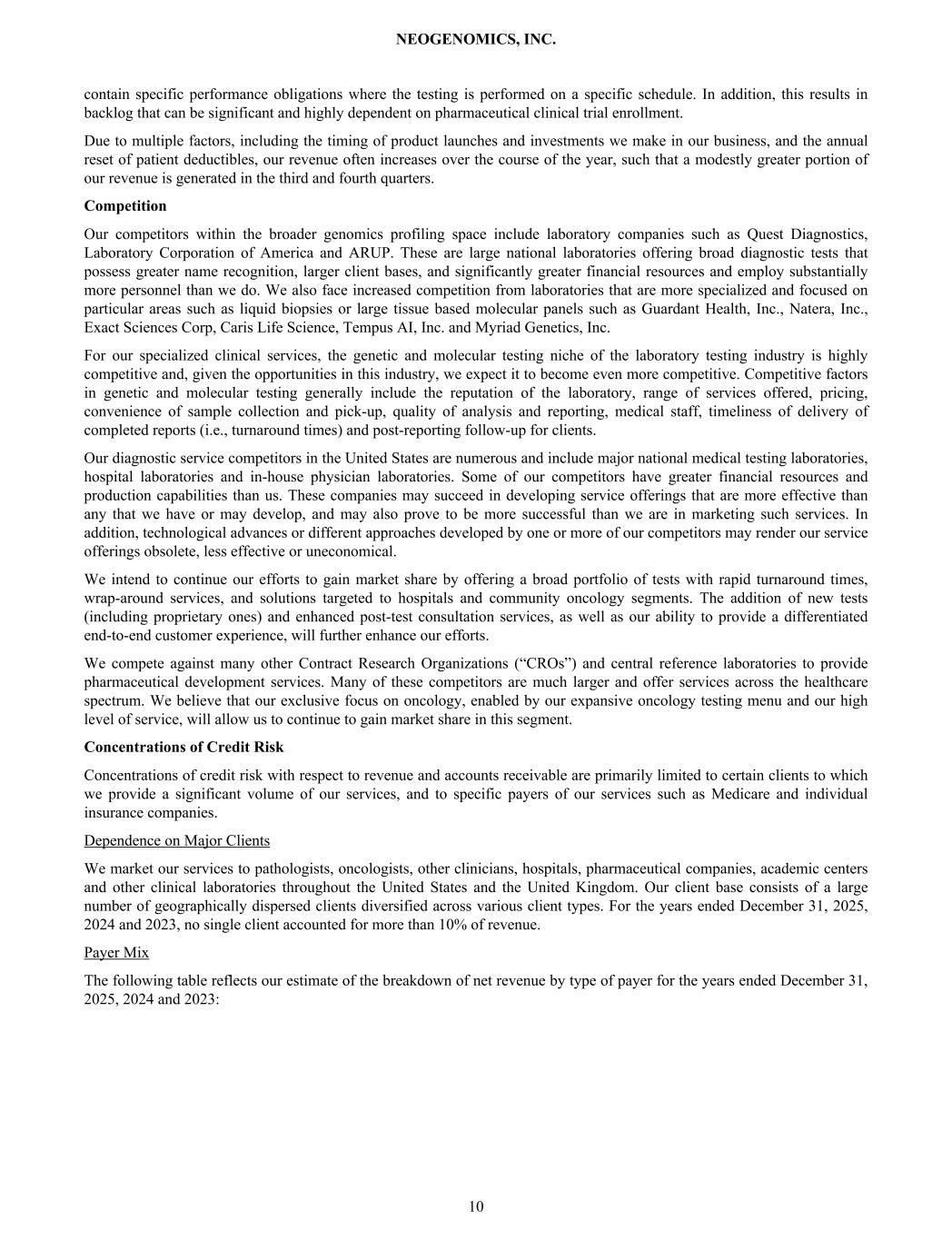 contain specific performance obligations where the testing is performed on a specific schedule. In addition, this results in backlog that can be significant and highly dependent on pharmaceutical clinical trial enrollment. Due to multiple factors, including the timing of product launches and investments we make in our business, and the annual reset of patient deductibles, our revenue often increases over the course of the year, such that a modestly greater portion of our revenue is generated in the third and fourth quarters. Competition Our competitors within the broader genomics profiling space include laboratory companies such as Quest Diagnostics, Laboratory Corporation of America and ARUP. These are large national laboratories offering broad diagnostic tests that possess greater name recognition, larger client bases, and significantly greater financial resources and employ substantially more personnel than we do. We also face increased competition from laboratories that are more specialized and focused on particular areas such as liquid biopsies or large tissue based molecular panels such as Guardant Health, Inc., Natera, Inc., Exact Sciences Corp, Caris Life Science, Tempus AI, Inc. and Myriad Genetics, Inc. For our specialized clinical services, the genetic and molecular testing niche of the laboratory testing industry is highly competitive and, given the opportunities in this industry, we expect it to become even more competitive. Competitive factors in genetic and molecular testing generally include the reputation of the laboratory, range of services offered, pricing, convenience of sample collection and pick-up, quality of analysis and reporting, medical staff, timeliness of delivery of completed reports (i.e., turnaround times) and post-reporting follow-up for clients. Our diagnostic service competitors in the United States are numerous and include major national medical testing laboratories, hospital laboratories and in-house physician laboratories. Some of our competitors have greater financial resources and production capabilities than us. These companies may succeed in developing service offerings that are more effective than any that we have or may develop, and may also prove to be more successful than we are in marketing such services. In addition, technological advances or different approaches developed by one or more of our competitors may render our service offerings obsolete, less effective or uneconomical. We intend to continue our efforts to gain market share by offering a broad portfolio of tests with rapid turnaround times, wrap-around services, and solutions targeted to hospitals and community oncology segments. The addition of new tests (including proprietary ones) and enhanced post-test consultation services, as well as our ability to provide a differentiated end-to-end customer experience, will further enhance our efforts. We compete against many other Contract Research Organizations (“CROs”) and central reference laboratories to provide pharmaceutical development services. Many of these competitors are much larger and offer services across the healthcare spectrum. We believe that our exclusive focus on oncology, enabled by our expansive oncology testing menu and our high level of service, will allow us to continue to gain market share in this segment. Concentrations of Credit Risk Concentrations of credit risk with respect to revenue and accounts receivable are primarily limited to certain clients to which we provide a significant volume of our services, and to specific payers of our services such as Medicare and individual insurance companies. Dependence on Major Clients We market our services to pathologists, oncologists, other clinicians, hospitals, pharmaceutical companies, academic centers and other clinical laboratories throughout the United States and the United Kingdom. Our client base consists of a large number of geographically dispersed clients diversified across various client types. For the years ended December 31, 2025, 2024 and 2023, no single client accounted for more than 10% of revenue. Payer Mix The following table reflects our estimate of the breakdown of net revenue by type of payer for the years ended December 31, 2025, 2024 and 2023: NEOGENOMICS, INC. 10