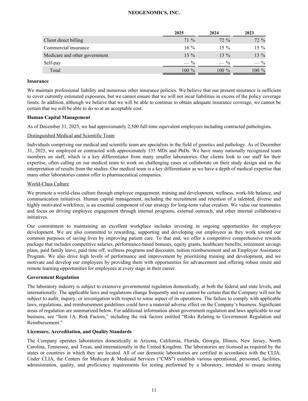 2025 2024 2023 Client direct billing 71 % 72 % 72 % Commercial insurance 16 % 15 % 15 % Medicare and other government 13 % 13 % 13 % Self-pay — % — % — % Total 100 % 100 % 100 % Insurance We maintain professional liability and numerous other insurance policies. We believe that our present insurance is sufficient to cover currently estimated exposures, but we cannot ensure that we will not incur liabilities in excess of the policy coverage limits. In addition, although we believe that we will be able to continue to obtain adequate insurance coverage, we cannot be certain that we will be able to do so at an acceptable cost. Human Capital Management As of December 31, 2025, we had approximately 2,500 full-time equivalent employees including contracted pathologists. Distinguished Medical and Scientific Team Individuals comprising our medical and scientific team are specialists in the field of genetics and pathology. As of December 31, 2025, we employed or contracted with approximately 135 MDs and PhDs. We have many nationally recognized team members on staff, which is a key differentiator from many smaller laboratories. Our clients look to our staff for their expertise, often calling on our medical team to work on challenging cases or collaborate on their study design and on the interpretation of results from the studies. Our medical team is a key differentiator as we have a depth of medical expertise that many other laboratories cannot offer to pharmaceutical companies. World-Class Culture We promote a world-class culture through employee engagement, training and development, wellness, work-life balance, and communication initiatives. Human capital management, including the recruitment and retention of a talented, diverse and highly motivated workforce, is an essential component of our strategy for long-term value creation. We value our teammates and focus on driving employee engagement through internal programs, external outreach, and other internal collaborative initiatives. Our commitment to maintaining an excellent workplace includes investing in ongoing opportunities for employee development. We are also committed to rewarding, supporting and developing our employees as they work toward our common purposes of saving lives by improving patient care. To that end, we offer a competitive comprehensive rewards package that includes competitive salaries, performance-based bonuses, equity grants, healthcare benefits, retirement savings plans, paid family leave, paid time off, wellness programs and discounts, tuition reimbursement and an Employee Assistance Program. We also drive high levels of performance and improvement by prioritizing training and development, and we motivate and develop our employees by providing them with opportunities for advancement and offering robust onsite and remote learning opportunities for employees at every stage in their career. Government Regulation The laboratory industry is subject to extensive governmental regulation domestically, at both the federal and state levels, and internationally. The applicable laws and regulations change frequently and we cannot be certain that the Company will not be subject to audit, inquiry, or investigation with respect to some aspect of its operations. The failure to comply with applicable laws, regulations, and reimbursement guidelines could have a material adverse effect on the Company’s business. Significant areas of regulation are summarized below. For additional information about government regulation and laws applicable to our business, see “Item 1A. Risk Factors,” including the risk factors entitled “Risks Relating to Government Regulation and Reimbursement.” Licensure, Accreditation, and Quality Standards The Company operates laboratories domestically in Arizona, California, Florida, Georgia, Illinois, New Jersey, North Carolina, Tennessee, and Texas, and internationally in the United Kingdom. The laboratories are licensed as required by the states or countries in which they are located. All of our domestic laboratories are certified in accordance with the CLIA. Under CLIA, the Centers for Medicare & Medicaid Services (“CMS”) establish various operational, personnel, facilities, administration, quality, and proficiency requirements for testing performed by a laboratory, intended to ensure testing NEOGENOMICS, INC. 11