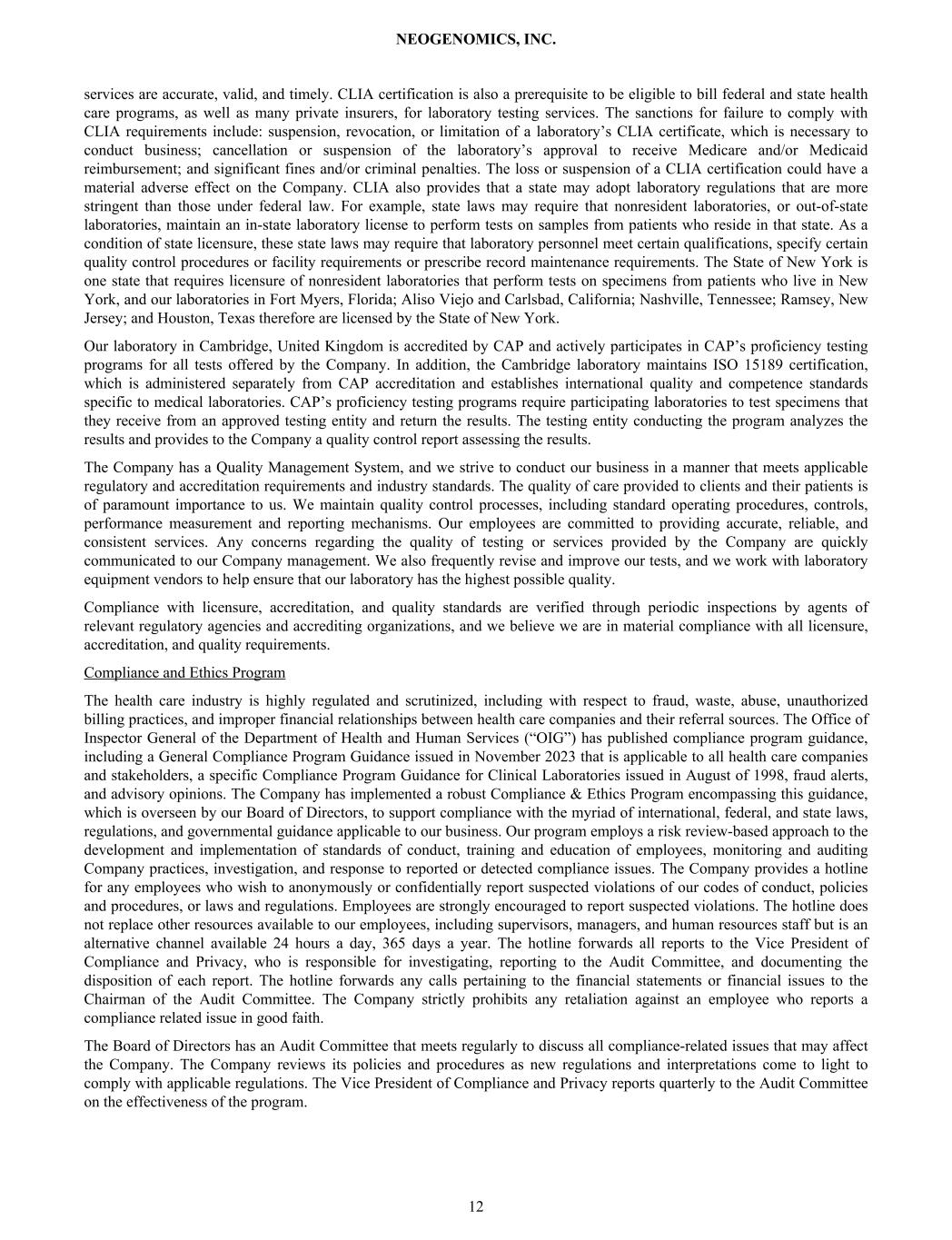 services are accurate, valid, and timely. CLIA certification is also a prerequisite to be eligible to bill federal and state health care programs, as well as many private insurers, for laboratory testing services. The sanctions for failure to comply with CLIA requirements include: suspension, revocation, or limitation of a laboratory’s CLIA certificate, which is necessary to conduct business; cancellation or suspension of the laboratory’s approval to receive Medicare and/or Medicaid reimbursement; and significant fines and/or criminal penalties. The loss or suspension of a CLIA certification could have a material adverse effect on the Company. CLIA also provides that a state may adopt laboratory regulations that are more stringent than those under federal law. For example, state laws may require that nonresident laboratories, or out-of-state laboratories, maintain an in-state laboratory license to perform tests on samples from patients who reside in that state. As a condition of state licensure, these state laws may require that laboratory personnel meet certain qualifications, specify certain quality control procedures or facility requirements or prescribe record maintenance requirements. The State of New York is one state that requires licensure of nonresident laboratories that perform tests on specimens from patients who live in New York, and our laboratories in Fort Myers, Florida; Aliso Viejo and Carlsbad, California; Nashville, Tennessee; Ramsey, New Jersey; and Houston, Texas therefore are licensed by the State of New York. Our laboratory in Cambridge, United Kingdom is accredited by CAP and actively participates in CAP’s proficiency testing programs for all tests offered by the Company. In addition, the Cambridge laboratory maintains ISO 15189 certification, which is administered separately from CAP accreditation and establishes international quality and competence standards specific to medical laboratories. CAP’s proficiency testing programs require participating laboratories to test specimens that they receive from an approved testing entity and return the results. The testing entity conducting the program analyzes the results and provides to the Company a quality control report assessing the results. The Company has a Quality Management System, and we strive to conduct our business in a manner that meets applicable regulatory and accreditation requirements and industry standards. The quality of care provided to clients and their patients is of paramount importance to us. We maintain quality control processes, including standard operating procedures, controls, performance measurement and reporting mechanisms. Our employees are committed to providing accurate, reliable, and consistent services. Any concerns regarding the quality of testing or services provided by the Company are quickly communicated to our Company management. We also frequently revise and improve our tests, and we work with laboratory equipment vendors to help ensure that our laboratory has the highest possible quality. Compliance with licensure, accreditation, and quality standards are verified through periodic inspections by agents of relevant regulatory agencies and accrediting organizations, and we believe we are in material compliance with all licensure, accreditation, and quality requirements. Compliance and Ethics Program The health care industry is highly regulated and scrutinized, including with respect to fraud, waste, abuse, unauthorized billing practices, and improper financial relationships between health care companies and their referral sources. The Office of Inspector General of the Department of Health and Human Services (“OIG”) has published compliance program guidance, including a General Compliance Program Guidance issued in November 2023 that is applicable to all health care companies and stakeholders, a specific Compliance Program Guidance for Clinical Laboratories issued in August of 1998, fraud alerts, and advisory opinions. The Company has implemented a robust Compliance & Ethics Program encompassing this guidance, which is overseen by our Board of Directors, to support compliance with the myriad of international, federal, and state laws, regulations, and governmental guidance applicable to our business. Our program employs a risk review-based approach to the development and implementation of standards of conduct, training and education of employees, monitoring and auditing Company practices, investigation, and response to reported or detected compliance issues. The Company provides a hotline for any employees who wish to anonymously or confidentially report suspected violations of our codes of conduct, policies and procedures, or laws and regulations. Employees are strongly encouraged to report suspected violations. The hotline does not replace other resources available to our employees, including supervisors, managers, and human resources staff but is an alternative channel available 24 hours a day, 365 days a year. The hotline forwards all reports to the Vice President of Compliance and Privacy, who is responsible for investigating, reporting to the Audit Committee, and documenting the disposition of each report. The hotline forwards any calls pertaining to the financial statements or financial issues to the Chairman of the Audit Committee. The Company strictly prohibits any retaliation against an employee who reports a compliance related issue in good faith. The Board of Directors has an Audit Committee that meets regularly to discuss all compliance-related issues that may affect the Company. The Company reviews its policies and procedures as new regulations and interpretations come to light to comply with applicable regulations. The Vice President of Compliance and Privacy reports quarterly to the Audit Committee on the effectiveness of the program. NEOGENOMICS, INC. 12