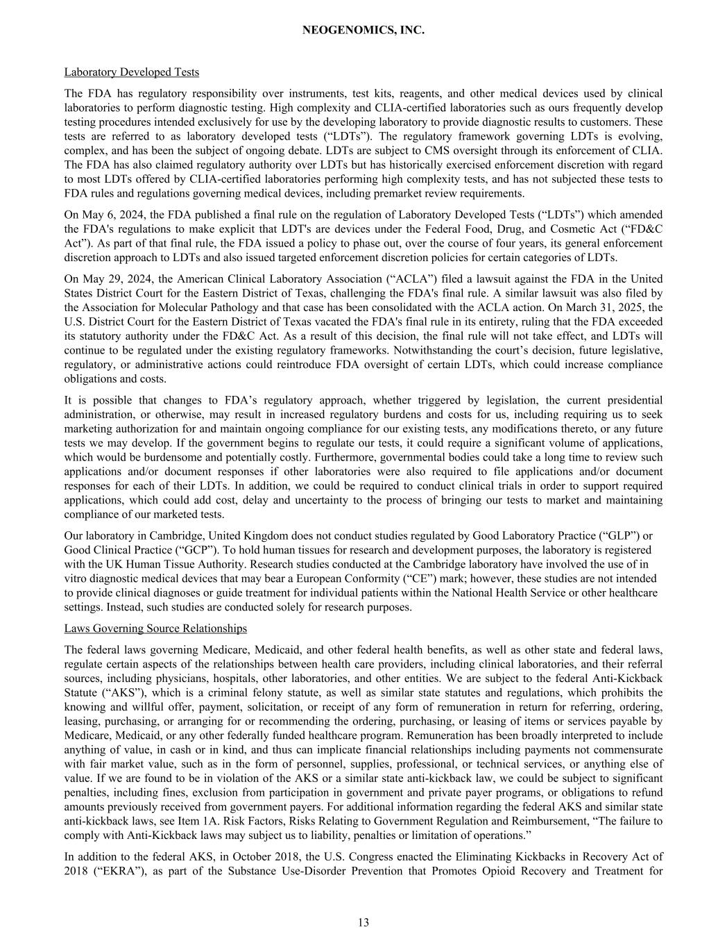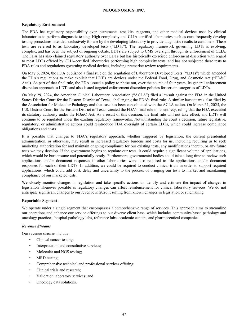 Regulatory Environment The FDA has regulatory responsibility over instruments, test kits, reagents, and other medical devices used by clinical laboratories to perform diagnostic testing. High complexity and CLIA-certified laboratories such as ours frequently develop testing procedures intended exclusively for use by the developing laboratory to provide diagnostic results to customers. These tests are referred to as laboratory developed tests (“LDTs”). The regulatory framework governing LDTs is evolving, complex, and has been the subject of ongoing debate. LDTs are subject to CMS oversight through its enforcement of CLIA. The FDA has also claimed regulatory authority over LDTs but has historically exercised enforcement discretion with regard to most LDTs offered by CLIA-certified laboratories performing high complexity tests, and has not subjected these tests to FDA rules and regulations governing medical devices, including premarket review requirements. On May 6, 2024, the FDA published a final rule on the regulation of Laboratory Developed Tests (“LDTs”) which amended the FDA's regulations to make explicit that LDT's are devices under the Federal Food, Drug, and Cosmetic Act (“FD&C Act”). As part of that final rule, the FDA issued a policy to phase out, over the course of four years, its general enforcement discretion approach to LDTs and also issued targeted enforcement discretion policies for certain categories of LDTs. On May 29, 2024, the American Clinical Laboratory Association (“ACLA”) filed a lawsuit against the FDA in the United States District Court for the Eastern District of Texas, challenging the FDA's final rule. A similar lawsuit was also filed by the Association for Molecular Pathology and that case has been consolidated with the ACLA action. On March 31, 2025, the U.S. District Court for the Eastern District of Texas vacated the FDA's final rule in its entirety, ruling that the FDA exceeded its statutory authority under the FD&C Act. As a result of this decision, the final rule will not take effect, and LDTs will continue to be regulated under the existing regulatory frameworks. Notwithstanding the court’s decision, future legislative, regulatory, or administrative actions could reintroduce FDA oversight of certain LDTs, which could increase compliance obligations and costs. It is possible that changes to FDA’s regulatory approach, whether triggered by legislation, the current presidential administration, or otherwise, may result in increased regulatory burdens and costs for us, including requiring us to seek marketing authorization for and maintain ongoing compliance for our existing tests, any modifications thereto, or any future tests we may develop. If the government begins to regulate our tests, it could require a significant volume of applications, which would be burdensome and potentially costly. Furthermore, governmental bodies could take a long time to review such applications and/or document responses if other laboratories were also required to file applications and/or document responses for each of their LDTs. In addition, we could be required to conduct clinical trials in order to support required applications, which could add cost, delay and uncertainty to the process of bringing our tests to market and maintaining compliance of our marketed tests. We closely monitor changes in legislation and take specific actions to identify and estimate the impact of changes in legislation whenever possible as regulatory changes can affect reimbursement for clinical laboratory services. We do not anticipate significant changes to our revenue in 2026 resulting from known changes in legislation or rulemaking. Reportable Segment We operate under a single segment that encompasses a comprehensive range of services. This approach aims to streamline our operations and enhance our service offerings to our diverse client base, which includes community-based pathology and oncology practices, hospital pathology labs, reference labs, academic centers, and pharmaceutical companies. Revenue Streams Our revenue streams include: • Clinical cancer testing; • Interpretation and consultative services; • Molecular and NGS testing; • MRD testing; • Comprehensive technical and professional services offering; • Clinical trials and research; • Validation laboratory services; and • Oncology data solutions. NEOGENOMICS, INC. 47