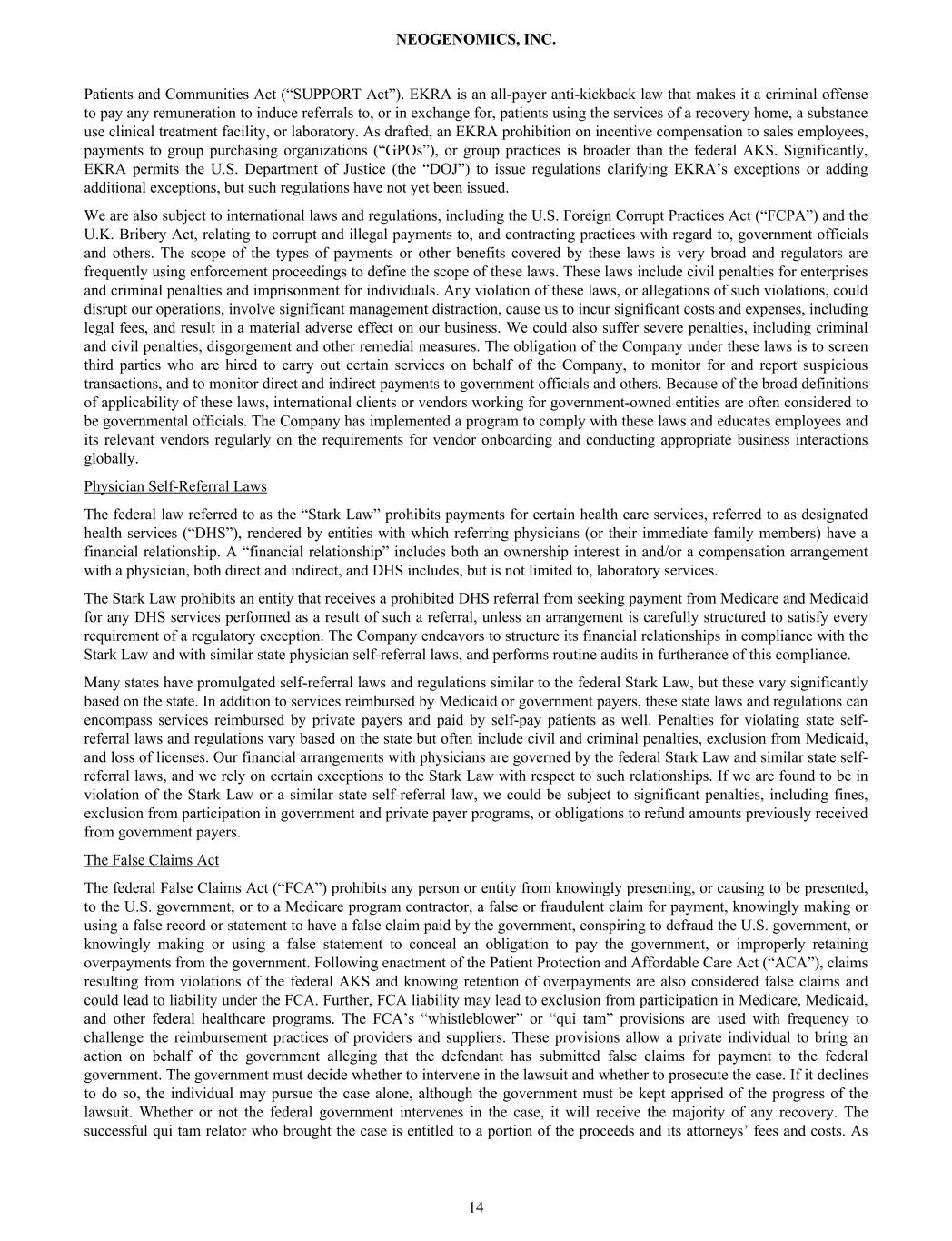 Patients and Communities Act (“SUPPORT Act”). EKRA is an all-payer anti-kickback law that makes it a criminal offense to pay any remuneration to induce referrals to, or in exchange for, patients using the services of a recovery home, a substance use clinical treatment facility, or laboratory. As drafted, an EKRA prohibition on incentive compensation to sales employees, payments to group purchasing organizations (“GPOs”), or group practices is broader than the federal AKS. Significantly, EKRA permits the U.S. Department of Justice (the “DOJ”) to issue regulations clarifying EKRA’s exceptions or adding additional exceptions, but such regulations have not yet been issued. We are also subject to international laws and regulations, including the U.S. Foreign Corrupt Practices Act (“FCPA”) and the U.K. Bribery Act, relating to corrupt and illegal payments to, and contracting practices with regard to, government officials and others. The scope of the types of payments or other benefits covered by these laws is very broad and regulators are frequently using enforcement proceedings to define the scope of these laws. These laws include civil penalties for enterprises and criminal penalties and imprisonment for individuals. Any violation of these laws, or allegations of such violations, could disrupt our operations, involve significant management distraction, cause us to incur significant costs and expenses, including legal fees, and result in a material adverse effect on our business. We could also suffer severe penalties, including criminal and civil penalties, disgorgement and other remedial measures. The obligation of the Company under these laws is to screen third parties who are hired to carry out certain services on behalf of the Company, to monitor for and report suspicious transactions, and to monitor direct and indirect payments to government officials and others. Because of the broad definitions of applicability of these laws, international clients or vendors working for government-owned entities are often considered to be governmental officials. The Company has implemented a program to comply with these laws and educates employees and its relevant vendors regularly on the requirements for vendor onboarding and conducting appropriate business interactions globally. Physician Self-Referral Laws The federal law referred to as the “Stark Law” prohibits payments for certain health care services, referred to as designated health services (“DHS”), rendered by entities with which referring physicians (or their immediate family members) have a financial relationship. A “financial relationship” includes both an ownership interest in and/or a compensation arrangement with a physician, both direct and indirect, and DHS includes, but is not limited to, laboratory services. The Stark Law prohibits an entity that receives a prohibited DHS referral from seeking payment from Medicare and Medicaid for any DHS services performed as a result of such a referral, unless an arrangement is carefully structured to satisfy every requirement of a regulatory exception. The Company endeavors to structure its financial relationships in compliance with the Stark Law and with similar state physician self-referral laws, and performs routine audits in furtherance of this compliance. Many states have promulgated self-referral laws and regulations similar to the federal Stark Law, but these vary significantly based on the state. In addition to services reimbursed by Medicaid or government payers, these state laws and regulations can encompass services reimbursed by private payers and paid by self-pay patients as well. Penalties for violating state self- referral laws and regulations vary based on the state but often include civil and criminal penalties, exclusion from Medicaid, and loss of licenses. Our financial arrangements with physicians are governed by the federal Stark Law and similar state self- referral laws, and we rely on certain exceptions to the Stark Law with respect to such relationships. If we are found to be in violation of the Stark Law or a similar state self-referral law, we could be subject to significant penalties, including fines, exclusion from participation in government and private payer programs, or obligations to refund amounts previously received from government payers. The False Claims Act The federal False Claims Act (“FCA”) prohibits any person or entity from knowingly presenting, or causing to be presented, to the U.S. government, or to a Medicare program contractor, a false or fraudulent claim for payment, knowingly making or using a false record or statement to have a false claim paid by the government, conspiring to defraud the U.S. government, or knowingly making or using a false statement to conceal an obligation to pay the government, or improperly retaining overpayments from the government. Following enactment of the Patient Protection and Affordable Care Act (“ACA”), claims resulting from violations of the federal AKS and knowing retention of overpayments are also considered false claims and could lead to liability under the FCA. Further, FCA liability may lead to exclusion from participation in Medicare, Medicaid, and other federal healthcare programs. The FCA’s “whistleblower” or “qui tam” provisions are used with frequency to challenge the reimbursement practices of providers and suppliers. These provisions allow a private individual to bring an action on behalf of the government alleging that the defendant has submitted false claims for payment to the federal government. The government must decide whether to intervene in the lawsuit and whether to prosecute the case. If it declines to do so, the individual may pursue the case alone, although the government must be kept apprised of the progress of the lawsuit. Whether or not the federal government intervenes in the case, it will receive the majority of any recovery. The successful q