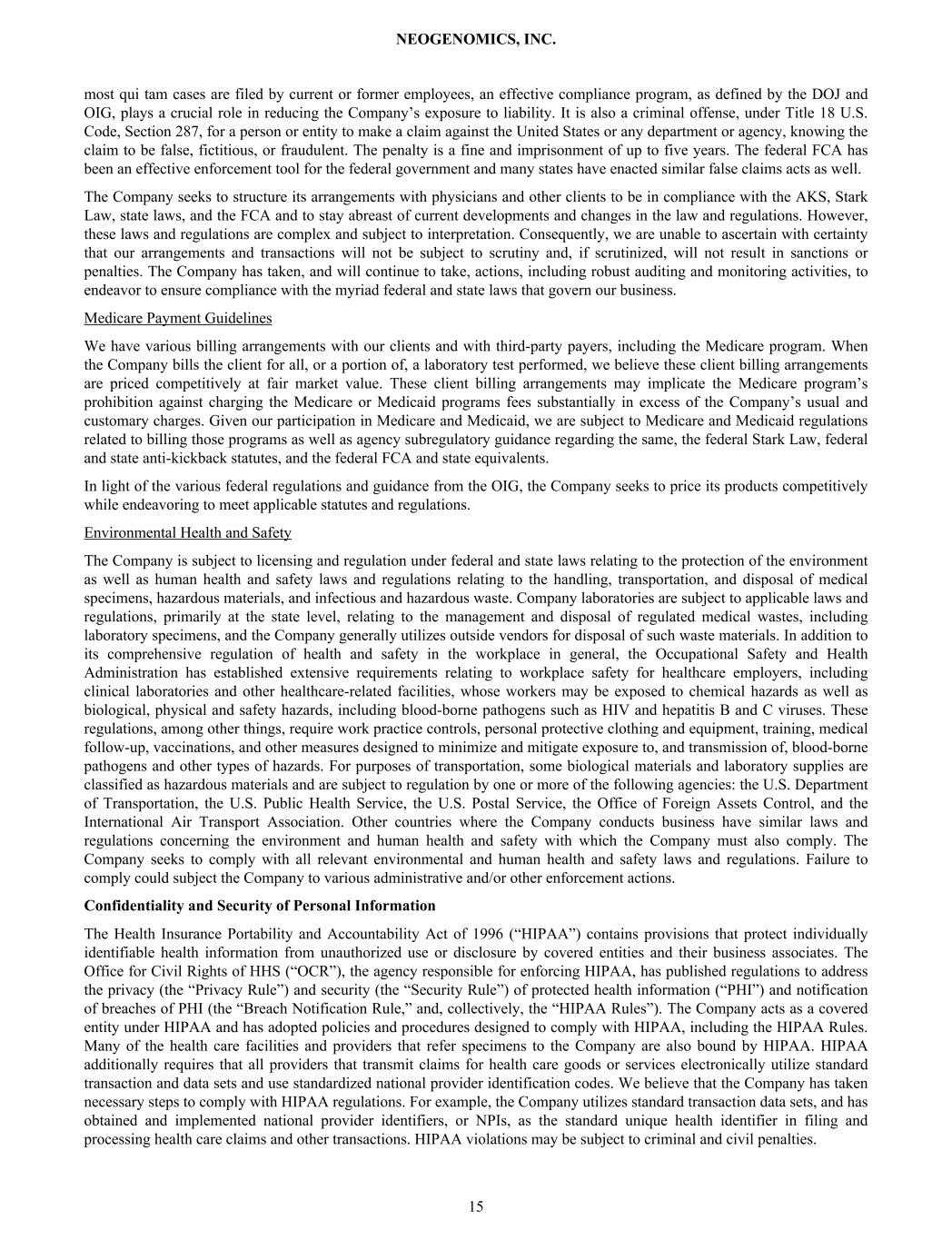 most qui tam cases are filed by current or former employees, an effective compliance program, as defined by the DOJ and OIG, plays a crucial role in reducing the Company’s exposure to liability. It is also a criminal offense, under Title 18 U.S. Code, Section 287, for a person or entity to make a claim against the United States or any department or agency, knowing the claim to be false, fictitious, or fraudulent. The penalty is a fine and imprisonment of up to five years. The federal FCA has been an effective enforcement tool for the federal government and many states have enacted similar false claims acts as well. The Company seeks to structure its arrangements with physicians and other clients to be in compliance with the AKS, Stark Law, state laws, and the FCA and to stay abreast of current developments and changes in the law and regulations. However, these laws and regulations are complex and subject to interpretation. Consequently, we are unable to ascertain with certainty that our arrangements and transactions will not be subject to scrutiny and, if scrutinized, will not result in sanctions or penalties. The Company has taken, and will continue to take, actions, including robust auditing and monitoring activities, to endeavor to ensure compliance with the myriad federal and state laws that govern our business. Medicare Payment Guidelines We have various billing arrangements with our clients and with third-party payers, including the Medicare program. When the Company bills the client for all, or a portion of, a laboratory test performed, we believe these client billing arrangements are priced competitively at fair market value. These client billing arrangements may implicate the Medicare program’s prohibition against charging the Medicare or Medicaid programs fees substantially in excess of the Company’s usual and customary charges. Given our participation in Medicare and Medicaid, we are subject to Medicare and Medicaid regulations related to billing those programs as well as agency subregulatory guidance regarding the same, the federal Stark Law, federal and state anti-kickback statutes, and the federal FCA and state equivalents. In light of the various federal regulations and guidance from the OIG, the Company seeks to price its products competitively while endeavoring to meet applicable statutes and regulations. Environmental Health and Safety The Company is subject to licensing and regulation under federal and state laws relating to the protection of the environment as well as human health and safety laws and regulations relating to the handling, transportation, and disposal of medical specimens, hazardous materials, and infectious and hazardous waste. Company laboratories are subject to applicable laws and regulations, primarily at the state level, relating to the management and disposal of regulated medical wastes, including laboratory specimens, and the Company generally utilizes outside vendors for disposal of such waste materials. In addition to its comprehensive regulation of health and safety in the workplace in general, the Occupational Safety and Health Administration has established extensive requirements relating to workplace safety for healthcare employers, including clinical laboratories and other healthcare-related facilities, whose workers may be exposed to chemical hazards as well as biological, physical and safety hazards, including blood-borne pathogens such as HIV and hepatitis B and C viruses. These regulations, among other things, require work practice controls, personal protective clothing and equipment, training, medical follow-up, vaccinations, and other measures designed to minimize and mitigate exposure to, and transmission of, blood-borne pathogens and other types of hazards. For purposes of transportation, some biological materials and laboratory supplies are classified as hazardous materials and are subject to regulation by one or more of the following agencies: the U.S. Department of Transportation, the U.S. Public Health Service, the U.S. Postal Service, the Office of Foreign Assets Control, and the International Air Transport Association. Other countries where the Company conducts business have similar laws and regulations concerning the environment and human health and safety with which the Company must also comply. The Company seeks to comply with all relevant environmental and human health and safety laws and regulations. Failure to comply could subject the Company to various administrative and/or other enforcement actions. Confidentiality and Security of Personal Information The Health Insurance Portability and Accountability Act of 1996 (“HIPAA”) contains provisions that protect individually identifiable health information from unauthorized use or disclosure by covered entities and their business associates. The Office for Civil Rights of HHS (“OCR”), the agency responsible for enforcing HIPAA, has published regulations to address the privacy (the “Privacy Rule”) and security (the “Security Rule”) of protected health information (“PHI”) and notification of breaches of PHI (the “Breach Notification Rule,” and, collectively, the “HIPAA Rules”). The Company acts as a covered entity under HIPAA and has adopted policies and procedures designed to comply with HIPAA, including the HIPAA Rules. Many of the health care facilities and providers that refer specimens to the Company are also bound by HIPAA. HIPAA additionally requires that all providers that transmit claims for health care goods or services electronically utilize standard transaction and data sets and use standardized national provider identification codes. We believe that the Company has taken necessary steps to comply with HIPAA regulations. For example, the Company utilizes standard transaction data sets, and has obtained and implemented national provider identifiers, or NPIs, as the standard unique health identifier in filing and processing health c