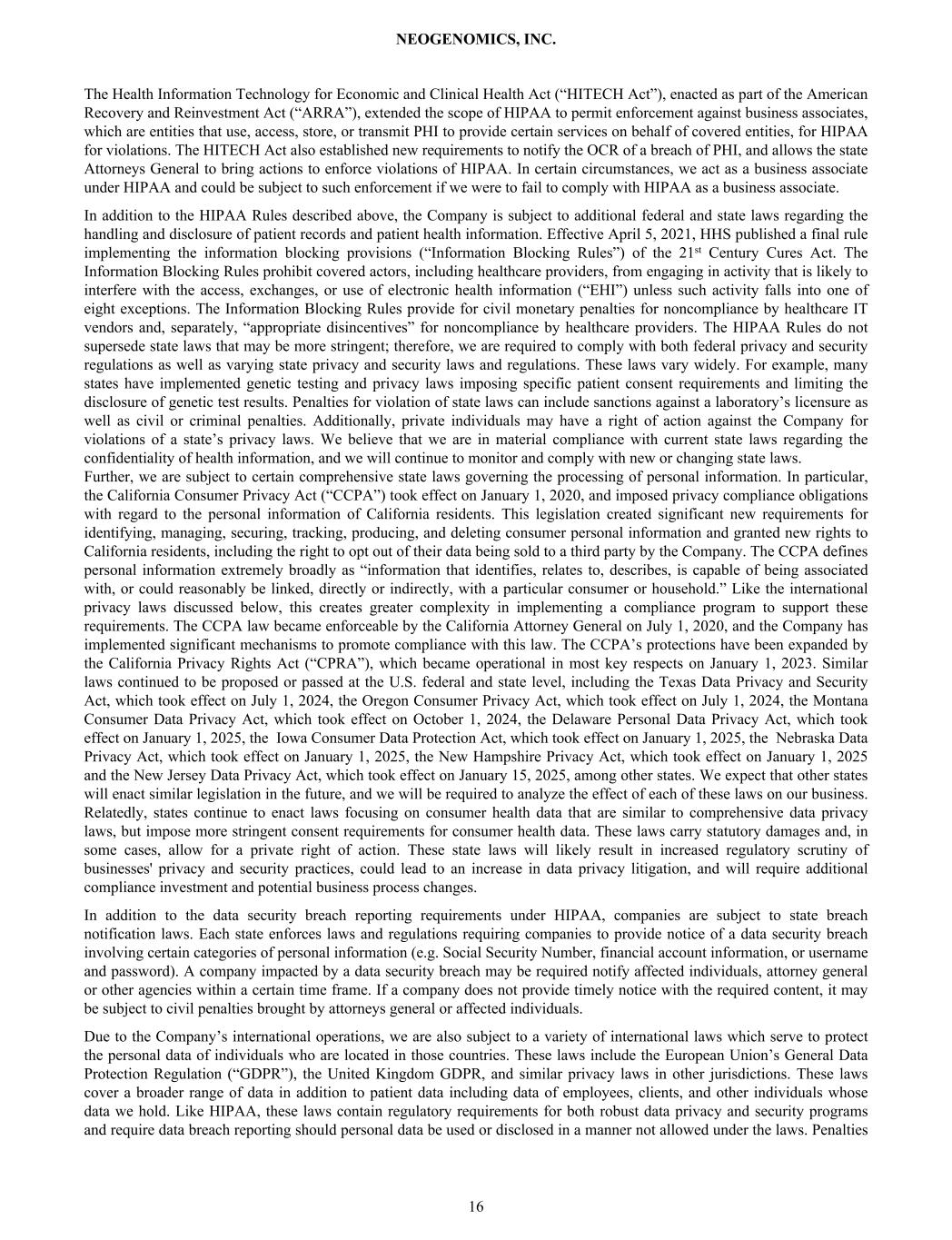 The Health Information Technology for Economic and Clinical Health Act (“HITECH Act”), enacted as part of the American Recovery and Reinvestment Act (“ARRA”), extended the scope of HIPAA to permit enforcement against business associates, which are entities that use, access, store, or transmit PHI to provide certain services on behalf of covered entities, for HIPAA for violations. The HITECH Act also established new requirements to notify the OCR of a breach of PHI, and allows the state Attorneys General to bring actions to enforce violations of HIPAA. In certain circumstances, we act as a business associate under HIPAA and could be subject to such enforcement if we were to fail to comply with HIPAA as a business associate. In addition to the HIPAA Rules described above, the Company is subject to additional federal and state laws regarding the handling and disclosure of patient records and patient health information. Effective April 5, 2021, HHS published a final rule implementing the information blocking provisions (“Information Blocking Rules”) of the 21st Century Cures Act. The Information Blocking Rules prohibit covered actors, including healthcare providers, from engaging in activity that is likely to interfere with the access, exchanges, or use of electronic health information (“EHI”) unless such activity falls into one of eight exceptions. The Information Blocking Rules provide for civil monetary penalties for noncompliance by healthcare IT vendors and, separately, “appropriate disincentives” for noncompliance by healthcare providers. The HIPAA Rules do not supersede state laws that may be more stringent; therefore, we are required to comply with both federal privacy and security regulations as well as varying state privacy and security laws and regulations. These laws vary widely. For example, many states have implemented genetic testing and privacy laws imposing specific patient consent requirements and limiting the disclosure of genetic test results. Penalties for violation of state laws can include sanctions against a laboratory’s licensure as well as civil or criminal penalties. Additionally, private individuals may have a right of action against the Company for violations of a state’s privacy laws. We believe that we are in material compliance with current state laws regarding the confidentiality of health information, and we will continue to monitor and comply with new or changing state laws. Further, we are subject to certain comprehensive state laws governing the processing of personal information. In particular, the California Consumer Privacy Act (“CCPA”) took effect on January 1, 2020, and imposed privacy compliance obligations with regard to the personal information of California residents. This legislation created significant new requirements for identifying, managing, securing, tracking, producing, and deleting consumer personal information and granted new rights to California residents, including the right to opt out of their data being sold to a third party by the Company. The CCPA defines personal information extremely broadly as “information that identifies, relates to, describes, is capable of being associated with, or could reasonably be linked, directly or indirectly, with a particular consumer or household.” Like the international privacy laws discussed below, this creates greater complexity in implementing a compliance program to support these requirements. The CCPA law became enforceable by the California Attorney General on July 1, 2020, and the Company has implemented significant mechanisms to promote compliance with this law. The CCPA’s protections have been expanded by the California Privacy Rights Act (“CPRA”), which became operational in most key respects on January 1, 2023. Similar laws continued to be proposed or passed at the U.S. federal and state level, including the Texas Data Privacy and Security Act, which took effect on July 1, 2024, the Oregon Consumer Privacy Act, which took effect on July 1, 2024, the Montana Consumer Data Privacy Act, which took effect on October 1, 2024, the Delaware Personal Data Privacy Act, which took effect on January 1, 2025, the Iowa Consumer Data Protection Act, which took effect on January 1, 2025, the Nebraska Data Privacy Act, which took effect on January 1, 2025, the New Hampshire Privacy Act, which took effect on January 1, 2025 and the New Jersey Data Privacy Act, which took effect on January 15, 2025, among other states. We expect that other states will enact similar legislation in the future, and we will be required to analyze the effect of each of these laws on our business. Relatedly, states continue to enact laws focusing on consumer health data that are similar to comprehensive data privacy laws, but impose more stringent consent requirements for consumer health data. These laws carry statutory damages and, in some cases, allow for a private right of action. These state laws will likely result in increased regulatory scrutiny of businesses' privacy and security practices, could lead to an increase in data privacy litigation, and will require additional compliance investment and potential business process changes. In addition to the data security breach reporting requirements under HIPAA, companies are subject to state breach notification laws. Each state enforces laws and regulations requiring companies to provide notice of a data security breach involving certain categories of personal information (e.g. Social Security Number, financial account information, or username and password). A company impacted by a data security breach may be required notify affected individuals, attorney general or other agencies within a certain time frame. If a company does not provide timely notice with the required content, it may be subject to civil penalties brought by attorneys general or affected individuals. Due to the Company’s international operations, we are also subject to