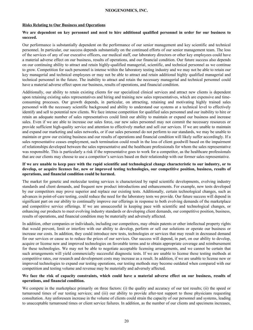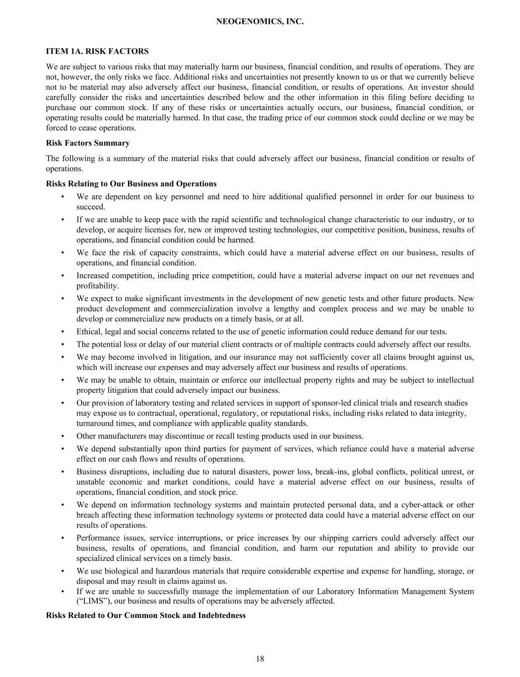 ITEM 1A. RISK FACTORS We are subject to various risks that may materially harm our business, financial condition, and results of operations. They are not, however, the only risks we face. Additional risks and uncertainties not presently known to us or that we currently believe not to be material may also adversely affect our business, financial condition, or results of operations. An investor should carefully consider the risks and uncertainties described below and the other information in this filing before deciding to purchase our common stock. If any of these risks or uncertainties actually occurs, our business, financial condition, or operating results could be materially harmed. In that case, the trading price of our common stock could decline or we may be forced to cease operations. Risk Factors Summary The following is a summary of the material risks that could adversely affect our business, financial condition or results of operations. Risks Relating to Our Business and Operations • We are dependent on key personnel and need to hire additional qualified personnel in order for our business to succeed. • If we are unable to keep pace with the rapid scientific and technological change characteristic to our industry, or to develop, or acquire licenses for, new or improved testing technologies, our competitive position, business, results of operations, and financial condition could be harmed. • We face the risk of capacity constraints, which could have a material adverse effect on our business, results of operations, and financial condition. • Increased competition, including price competition, could have a material adverse impact on our net revenues and profitability. • We expect to make significant investments in the development of new genetic tests and other future products. New product development and commercialization involve a lengthy and complex process and we may be unable to develop or commercialize new products on a timely basis, or at all. • Ethical, legal and social concerns related to the use of genetic information could reduce demand for our tests. • The potential loss or delay of our material client contracts or of multiple contracts could adversely affect our results. • We may become involved in litigation, and our insurance may not sufficiently cover all claims brought against us, which will increase our expenses and may adversely affect our business and results of operations. • We may be unable to obtain, maintain or enforce our intellectual property rights and may be subject to intellectual property litigation that could adversely impact our business. • Our provision of laboratory testing and related services in support of sponsor-led clinical trials and research studies may expose us to contractual, operational, regulatory, or reputational risks, including risks related to data integrity, turnaround times, and compliance with applicable quality standards. • Other manufacturers may discontinue or recall testing products used in our business. • We depend substantially upon third parties for payment of services, which reliance could have a material adverse effect on our cash flows and results of operations. • Business disruptions, including due to natural disasters, power loss, break-ins, global conflicts, political unrest, or unstable economic and market conditions, could have a material adverse effect on our business, results of operations, financial condition, and stock price. • We depend on information technology systems and maintain protected personal data, and a cyber-attack or other breach affecting these information technology systems or protected data could have a material adverse effect on our results of operations. • Performance issues, service interruptions, or price increases by our shipping carriers could adversely affect our business, results of operations, and financial condition, and harm our reputation and ability to provide our specialized clinical services on a timely basis. • We use biological and hazardous materials that require considerable expertise and expense for handling, storage, or disposal and may result in claims against us. • If we are unable to successfully manage the implementation of our Laboratory Information Management System (“LIMS”), our business and results of operations may be adversely affected. Risks Related to Our Common Stock and Indebtedness NEOGENOMICS, INC. 18