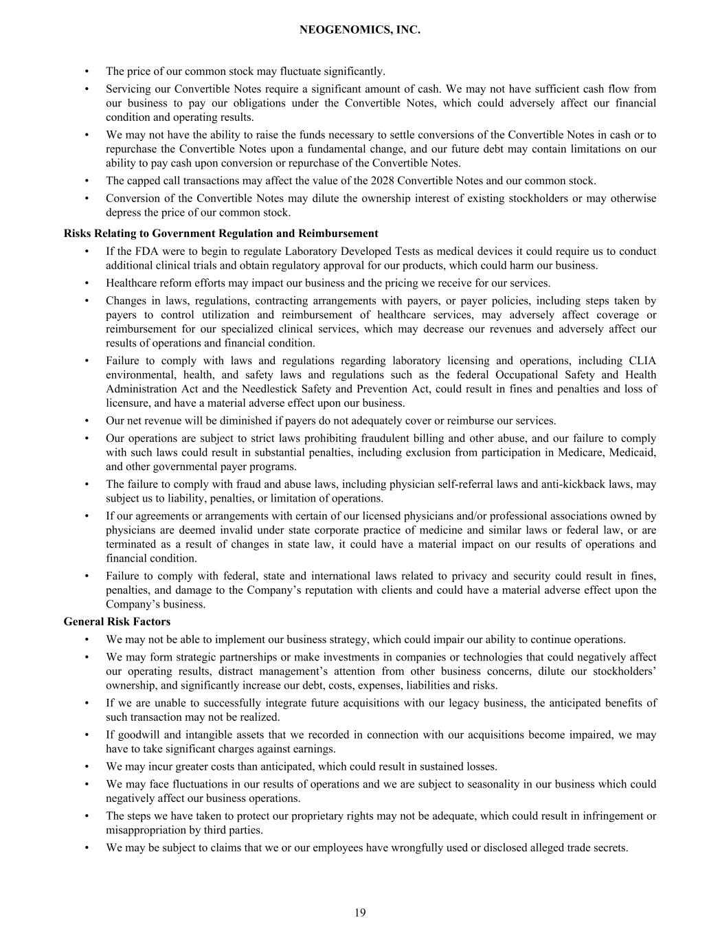 • The price of our common stock may fluctuate significantly. • Servicing our Convertible Notes require a significant amount of cash. We may not have sufficient cash flow from our business to pay our obligations under the Convertible Notes, which could adversely affect our financial condition and operating results. • We may not have the ability to raise the funds necessary to settle conversions of the Convertible Notes in cash or to repurchase the Convertible Notes upon a fundamental change, and our future debt may contain limitations on our ability to pay cash upon conversion or repurchase of the Convertible Notes. • The capped call transactions may affect the value of the 2028 Convertible Notes and our common stock. • Conversion of the Convertible Notes may dilute the ownership interest of existing stockholders or may otherwise depress the price of our common stock. Risks Relating to Government Regulation and Reimbursement • If the FDA were to begin to regulate Laboratory Developed Tests as medical devices it could require us to conduct additional clinical trials and obtain regulatory approval for our products, which could harm our business. • Healthcare reform efforts may impact our business and the pricing we receive for our services. • Changes in laws, regulations, contracting arrangements with payers, or payer policies, including steps taken by payers to control utilization and reimbursement of healthcare services, may adversely affect coverage or reimbursement for our specialized clinical services, which may decrease our revenues and adversely affect our results of operations and financial condition. • Failure to comply with laws and regulations regarding laboratory licensing and operations, including CLIA environmental, health, and safety laws and regulations such as the federal Occupational Safety and Health Administration Act and the Needlestick Safety and Prevention Act, could result in fines and penalties and loss of licensure, and have a material adverse effect upon our business. • Our net revenue will be diminished if payers do not adequately cover or reimburse our services. • Our operations are subject to strict laws prohibiting fraudulent billing and other abuse, and our failure to comply with such laws could result in substantial penalties, including exclusion from participation in Medicare, Medicaid, and other governmental payer programs. • The failure to comply with fraud and abuse laws, including physician self-referral laws and anti-kickback laws, may subject us to liability, penalties, or limitation of operations. • If our agreements or arrangements with certain of our licensed physicians and/or professional associations owned by physicians are deemed invalid under state corporate practice of medicine and similar laws or federal law, or are terminated as a result of changes in state law, it could have a material impact on our results of operations and financial condition. • Failure to comply with federal, state and international laws related to privacy and security could result in fines, penalties, and damage to the Company’s reputation with clients and could have a material adverse effect upon the Company’s business. General Risk Factors • We may not be able to implement our business strategy, which could impair our ability to continue operations. • We may form strategic partnerships or make investments in companies or technologies that could negatively affect our operating results, distract management’s attention from other business concerns, dilute our stockholders’ ownership, and significantly increase our debt, costs, expenses, liabilities and risks. • If we are unable to successfully integrate future acquisitions with our legacy business, the anticipated benefits of such transaction may not be realized. • If goodwill and intangible assets that we recorded in connection with our acquisitions become impaired, we may have to take significant charges against earnings. • We may incur greater costs than anticipated, which could result in sustained losses. • We may face fluctuations in our results of operations and we are subject to seasonality in our business which could negatively affect our business operations. • The steps we have taken to protect our proprietary rights may not be adequate, which could result in infringement or misappropriation by third parties. • We may be subject to claims that we or our employees have wrongfully used or disclosed alleged trade secrets. NEOGENOMICS, INC. 19