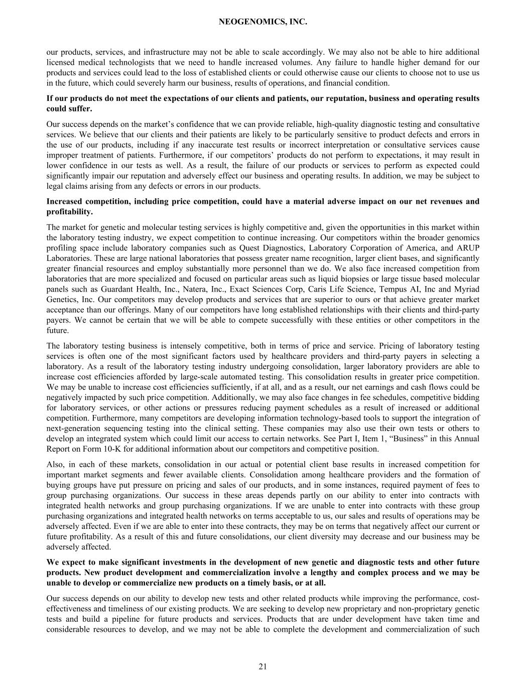 our products, services, and infrastructure may not be able to scale accordingly. We may also not be able to hire additional licensed medical technologists that we need to handle increased volumes. Any failure to handle higher demand for our products and services could lead to the loss of established clients or could otherwise cause our clients to choose not to use us in the future, which could severely harm our business, results of operations, and financial condition. If our products do not meet the expectations of our clients and patients, our reputation, business and operating results could suffer. Our success depends on the market’s confidence that we can provide reliable, high-quality diagnostic testing and consultative services. We believe that our clients and their patients are likely to be particularly sensitive to product defects and errors in the use of our products, including if any inaccurate test results or incorrect interpretation or consultative services cause improper treatment of patients. Furthermore, if our competitors’ products do not perform to expectations, it may result in lower confidence in our tests as well. As a result, the failure of our products or services to perform as expected could significantly impair our reputation and adversely effect our business and operating results. In addition, we may be subject to legal claims arising from any defects or errors in our products. Increased competition, including price competition, could have a material adverse impact on our net revenues and profitability. The market for genetic and molecular testing services is highly competitive and, given the opportunities in this market within the laboratory testing industry, we expect competition to continue increasing. Our competitors within the broader genomics profiling space include laboratory companies such as Quest Diagnostics, Laboratory Corporation of America, and ARUP Laboratories. These are large national laboratories that possess greater name recognition, larger client bases, and significantly greater financial resources and employ substantially more personnel than we do. We also face increased competition from laboratories that are more specialized and focused on particular areas such as liquid biopsies or large tissue based molecular panels such as Guardant Health, Inc., Natera, Inc., Exact Sciences Corp, Caris Life Science, Tempus AI, Inc and Myriad Genetics, Inc. Our competitors may develop products and services that are superior to ours or that achieve greater market acceptance than our offerings. Many of our competitors have long established relationships with their clients and third-party payers. We cannot be certain that we will be able to compete successfully with these entities or other competitors in the future. The laboratory testing business is intensely competitive, both in terms of price and service. Pricing of laboratory testing services is often one of the most significant factors used by healthcare providers and third-party payers in selecting a laboratory. As a result of the laboratory testing industry undergoing consolidation, larger laboratory providers are able to increase cost efficiencies afforded by large-scale automated testing. This consolidation results in greater price competition. We may be unable to increase cost efficiencies sufficiently, if at all, and as a result, our net earnings and cash flows could be negatively impacted by such price competition. Additionally, we may also face changes in fee schedules, competitive bidding for laboratory services, or other actions or pressures reducing payment schedules as a result of increased or additional competition. Furthermore, many competitors are developing information technology-based tools to support the integration of next-generation sequencing testing into the clinical setting. These companies may also use their own tests or others to develop an integrated system which could limit our access to certain networks. See Part I, Item 1, “Business” in this Annual Report on Form 10-K for additional information about our competitors and competitive position. Also, in each of these markets, consolidation in our actual or potential client base results in increased competition for important market segments and fewer available clients. Consolidation among healthcare providers and the formation of buying groups have put pressure on pricing and sales of our products, and in some instances, required payment of fees to group purchasing organizations. Our success in these areas depends partly on our ability to enter into contracts with integrated health networks and group purchasing organizations. If we are unable to enter into contracts with these group purchasing organizations and integrated health networks on terms acceptable to us, our sales and results of operations may be adversely affected. Even if we are able to enter into these contracts, they may be on terms that negatively affect our current or future profitability. As a result of this and future consolidations, our client diversity may decrease and our business may be adversely affected. We expect to make significant investments in the development of new genetic and diagnostic tests and other future products. New product development and commercialization involve a lengthy and complex process and we may be unable to develop or commercialize new products on a timely basis, or at all. Our success depends on our ability to develop new tests and other related products while improving the performance, cost- effectiveness and timeliness of our existing products. We are seeking to develop new proprietary and non-proprietary genetic tests and build a pipeline for future products and services. Products that are under development have taken time and considerable resources to develop, and we may not be able to complete the development and commercialization of such NEOGENOMICS, INC. 21