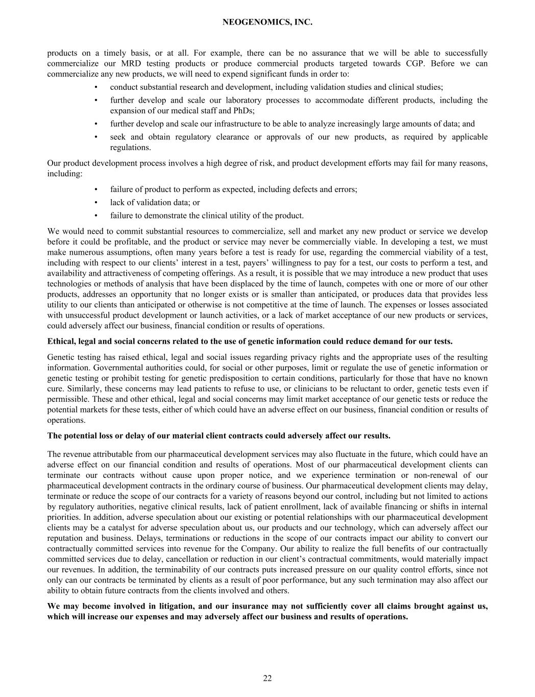 products on a timely basis, or at all. For example, there can be no assurance that we will be able to successfully commercialize our MRD testing products or produce commercial products targeted towards CGP. Before we can commercialize any new products, we will need to expend significant funds in order to: • conduct substantial research and development, including validation studies and clinical studies; • further develop and scale our laboratory processes to accommodate different products, including the expansion of our medical staff and PhDs; • further develop and scale our infrastructure to be able to analyze increasingly large amounts of data; and • seek and obtain regulatory clearance or approvals of our new products, as required by applicable regulations. Our product development process involves a high degree of risk, and product development efforts may fail for many reasons, including: • failure of product to perform as expected, including defects and errors; • lack of validation data; or • failure to demonstrate the clinical utility of the product. We would need to commit substantial resources to commercialize, sell and market any new product or service we develop before it could be profitable, and the product or service may never be commercially viable. In developing a test, we must make numerous assumptions, often many years before a test is ready for use, regarding the commercial viability of a test, including with respect to our clients’ interest in a test, payers’ willingness to pay for a test, our costs to perform a test, and availability and attractiveness of competing offerings. As a result, it is possible that we may introduce a new product that uses technologies or methods of analysis that have been displaced by the time of launch, competes with one or more of our other products, addresses an opportunity that no longer exists or is smaller than anticipated, or produces data that provides less utility to our clients than anticipated or otherwise is not competitive at the time of launch. The expenses or losses associated with unsuccessful product development or launch activities, or a lack of market acceptance of our new products or services, could adversely affect our business, financial condition or results of operations. Ethical, legal and social concerns related to the use of genetic information could reduce demand for our tests. Genetic testing has raised ethical, legal and social issues regarding privacy rights and the appropriate uses of the resulting information. Governmental authorities could, for social or other purposes, limit or regulate the use of genetic information or genetic testing or prohibit testing for genetic predisposition to certain conditions, particularly for those that have no known cure. Similarly, these concerns may lead patients to refuse to use, or clinicians to be reluctant to order, genetic tests even if permissible. These and other ethical, legal and social concerns may limit market acceptance of our genetic tests or reduce the potential markets for these tests, either of which could have an adverse effect on our business, financial condition or results of operations. The potential loss or delay of our material client contracts could adversely affect our results. The revenue attributable from our pharmaceutical development services may also fluctuate in the future, which could have an adverse effect on our financial condition and results of operations. Most of our pharmaceutical development clients can terminate our contracts without cause upon proper notice, and we experience termination or non-renewal of our pharmaceutical development contracts in the ordinary course of business. Our pharmaceutical development clients may delay, terminate or reduce the scope of our contracts for a variety of reasons beyond our control, including but not limited to actions by regulatory authorities, negative clinical results, lack of patient enrollment, lack of available financing or shifts in internal priorities. In addition, adverse speculation about our existing or potential relationships with our pharmaceutical development clients may be a catalyst for adverse speculation about us, our products and our technology, which can adversely affect our reputation and business. Delays, terminations or reductions in the scope of our contracts impact our ability to convert our contractually committed services into revenue for the Company. Our ability to realize the full benefits of our contractually committed services due to delay, cancellation or reduction in our client’s contractual commitments, would materially impact our revenues. In addition, the terminability of our contracts puts increased pressure on our quality control efforts, since not only can our contracts be terminated by clients as a result of poor performance, but any such termination may also affect our ability to obtain future contracts from the clients involved and others. We may become involved in litigation, and our insurance may not sufficiently cover all claims brought against us, which will increase our expenses and may adversely affect our business and results of operations. NEOGENOMICS, INC. 22