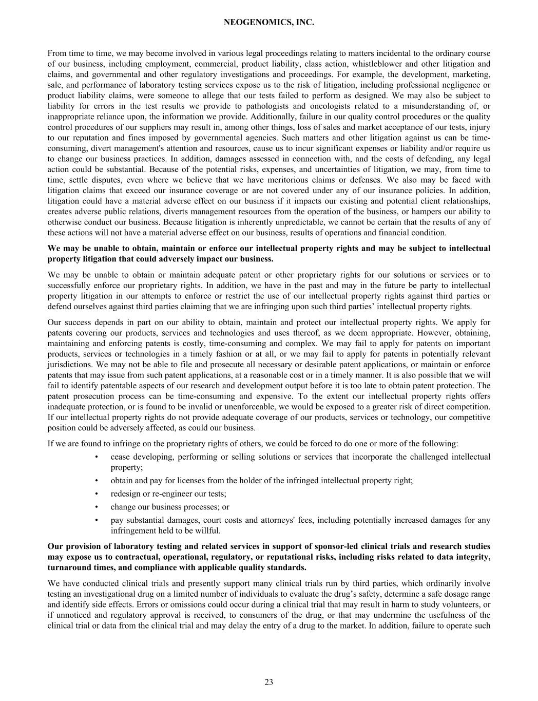 From time to time, we may become involved in various legal proceedings relating to matters incidental to the ordinary course of our business, including employment, commercial, product liability, class action, whistleblower and other litigation and claims, and governmental and other regulatory investigations and proceedings. For example, the development, marketing, sale, and performance of laboratory testing services expose us to the risk of litigation, including professional negligence or product liability claims, were someone to allege that our tests failed to perform as designed. We may also be subject to liability for errors in the test results we provide to pathologists and oncologists related to a misunderstanding of, or inappropriate reliance upon, the information we provide. Additionally, failure in our quality control procedures or the quality control procedures of our suppliers may result in, among other things, loss of sales and market acceptance of our tests, injury to our reputation and fines imposed by governmental agencies. Such matters and other litigation against us can be time- consuming, divert management's attention and resources, cause us to incur significant expenses or liability and/or require us to change our business practices. In addition, damages assessed in connection with, and the costs of defending, any legal action could be substantial. Because of the potential risks, expenses, and uncertainties of litigation, we may, from time to time, settle disputes, even where we believe that we have meritorious claims or defenses. We also may be faced with litigation claims that exceed our insurance coverage or are not covered under any of our insurance policies. In addition, litigation could have a material adverse effect on our business if it impacts our existing and potential client relationships, creates adverse public relations, diverts management resources from the operation of the business, or hampers our ability to otherwise conduct our business. Because litigation is inherently unpredictable, we cannot be certain that the results of any of these actions will not have a material adverse effect on our business, results of operations and financial condition. We may be unable to obtain, maintain or enforce our intellectual property rights and may be subject to intellectual property litigation that could adversely impact our business. We may be unable to obtain or maintain adequate patent or other proprietary rights for our solutions or services or to successfully enforce our proprietary rights. In addition, we have in the past and may in the future be party to intellectual property litigation in our attempts to enforce or restrict the use of our intellectual property rights against third parties or defend ourselves against third parties claiming that we are infringing upon such third parties’ intellectual property rights. Our success depends in part on our ability to obtain, maintain and protect our intellectual property rights. We apply for patents covering our products, services and technologies and uses thereof, as we deem appropriate. However, obtaining, maintaining and enforcing patents is costly, time-consuming and complex. We may fail to apply for patents on important products, services or technologies in a timely fashion or at all, or we may fail to apply for patents in potentially relevant jurisdictions. We may not be able to file and prosecute all necessary or desirable patent applications, or maintain or enforce patents that may issue from such patent applications, at a reasonable cost or in a timely manner. It is also possible that we will fail to identify patentable aspects of our research and development output before it is too late to obtain patent protection. The patent prosecution process can be time-consuming and expensive. To the extent our intellectual property rights offers inadequate protection, or is found to be invalid or unenforceable, we would be exposed to a greater risk of direct competition. If our intellectual property rights do not provide adequate coverage of our products, services or technology, our competitive position could be adversely affected, as could our business. If we are found to infringe on the proprietary rights of others, we could be forced to do one or more of the following: • cease developing, performing or selling solutions or services that incorporate the challenged intellectual property; • obtain and pay for licenses from the holder of the infringed intellectual property right; • redesign or re-engineer our tests; • change our business processes; or • pay substantial damages, court costs and attorneys' fees, including potentially increased damages for any infringement held to be willful. Our provision of laboratory testing and related services in support of sponsor-led clinical trials and research studies may expose us to contractual, operational, regulatory, or reputational risks, including risks related to data integrity, turnaround times, and compliance with applicable quality standards. We have conducted clinical trials and presently support many clinical trials run by third parties, which ordinarily involve testing an investigational drug on a limited number of individuals to evaluate the drug’s safety, determine a safe dosage range and identify side effects. Errors or omissions could occur during a clinical trial that may result in harm to study volunteers, or if unnoticed and regulatory approval is received, to consumers of the drug, or that may undermine the usefulness of the clinical trial or data from the clinical trial and may delay the entry of a drug to the market. In addition, failure to operate such NEOGENOMICS, INC. 23