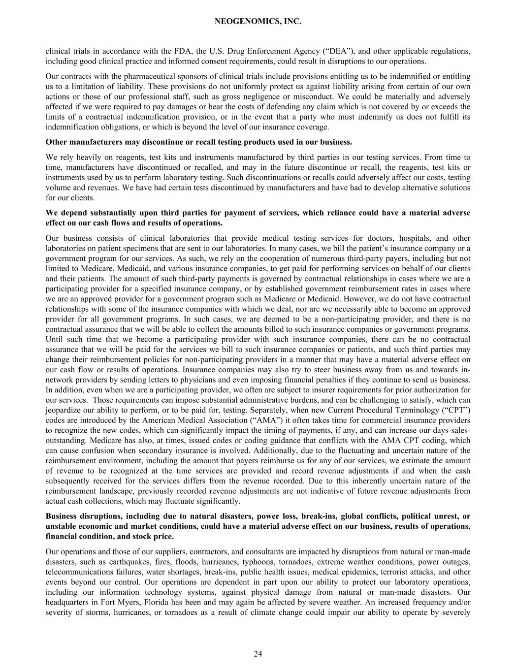 clinical trials in accordance with the FDA, the U.S. Drug Enforcement Agency (“DEA”), and other applicable regulations, including good clinical practice and informed consent requirements, could result in disruptions to our operations. Our contracts with the pharmaceutical sponsors of clinical trials include provisions entitling us to be indemnified or entitling us to a limitation of liability. These provisions do not uniformly protect us against liability arising from certain of our own actions or those of our professional staff, such as gross negligence or misconduct. We could be materially and adversely affected if we were required to pay damages or bear the costs of defending any claim which is not covered by or exceeds the limits of a contractual indemnification provision, or in the event that a party who must indemnify us does not fulfill its indemnification obligations, or which is beyond the level of our insurance coverage. Other manufacturers may discontinue or recall testing products used in our business. We rely heavily on reagents, test kits and instruments manufactured by third parties in our testing services. From time to time, manufacturers have discontinued or recalled, and may in the future discontinue or recall, the reagents, test kits or instruments used by us to perform laboratory testing. Such discontinuations or recalls could adversely affect our costs, testing volume and revenues. We have had certain tests discontinued by manufacturers and have had to develop alternative solutions for our clients. We depend substantially upon third parties for payment of services, which reliance could have a material adverse effect on our cash flows and results of operations. Our business consists of clinical laboratories that provide medical testing services for doctors, hospitals, and other laboratories on patient specimens that are sent to our laboratories. In many cases, we bill the patient’s insurance company or a government program for our services. As such, we rely on the cooperation of numerous third-party payers, including but not limited to Medicare, Medicaid, and various insurance companies, to get paid for performing services on behalf of our clients and their patients. The amount of such third-party payments is governed by contractual relationships in cases where we are a participating provider for a specified insurance company, or by established government reimbursement rates in cases where we are an approved provider for a government program such as Medicare or Medicaid. However, we do not have contractual relationships with some of the insurance companies with which we deal, nor are we necessarily able to become an approved provider for all government programs. In such cases, we are deemed to be a non-participating provider, and there is no contractual assurance that we will be able to collect the amounts billed to such insurance companies or government programs. Until such time that we become a participating provider with such insurance companies, there can be no contractual assurance that we will be paid for the services we bill to such insurance companies or patients, and such third parties may change their reimbursement policies for non-participating providers in a manner that may have a material adverse effect on our cash flow or results of operations. Insurance companies may also try to steer business away from us and towards in- network providers by sending letters to physicians and even imposing financial penalties if they continue to send us business. In addition, even when we are a participating provider, we often are subject to insurer requirements for prior authorization for our services. Those requirements can impose substantial administrative burdens, and can be challenging to satisfy, which can jeopardize our ability to perform, or to be paid for, testing. Separately, when new Current Procedural Terminology (“CPT”) codes are introduced by the American Medical Association (“AMA”) it often takes time for commercial insurance providers to recognize the new codes, which can significantly impact the timing of payments, if any, and can increase our days-sales- outstanding. Medicare has also, at times, issued codes or coding guidance that conflicts with the AMA CPT coding, which can cause confusion when secondary insurance is involved. Additionally, due to the fluctuating and uncertain nature of the reimbursement environment, including the amount that payers reimburse us for any of our services, we estimate the amount of revenue to be recognized at the time services are provided and record revenue adjustments if and when the cash subsequently received for the services differs from the revenue recorded. Due to this inherently uncertain nature of the reimbursement landscape, previously recorded revenue adjustments are not indicative of future revenue adjustments from actual cash collections, which may fluctuate significantly. Business disruptions, including due to natural disasters, power loss, break-ins, global conflicts, political unrest, or unstable economic and market conditions, could have a material adverse effect on our business, results of operations, financial condition, and stock price. Our operations and those of our suppliers, contractors, and consultants are impacted by disruptions from natural or man-made disasters, such as earthquakes, fires, floods, hurricanes, typhoons, tornadoes, extreme weather conditions, power outages, telecommunications failures, water shortages, break-ins, public health issues, medical epidemics, terrorist attacks, and other events beyond our control. Our operations are dependent in part upon our ability to protect our laboratory operations, including our information technology systems, against physical damage from natural or man-made disasters. Our headquarters in Fort Myers, Florida has been and may again be affected by severe weather. An increased frequency and/or severity of storms, hurricanes, or tornad