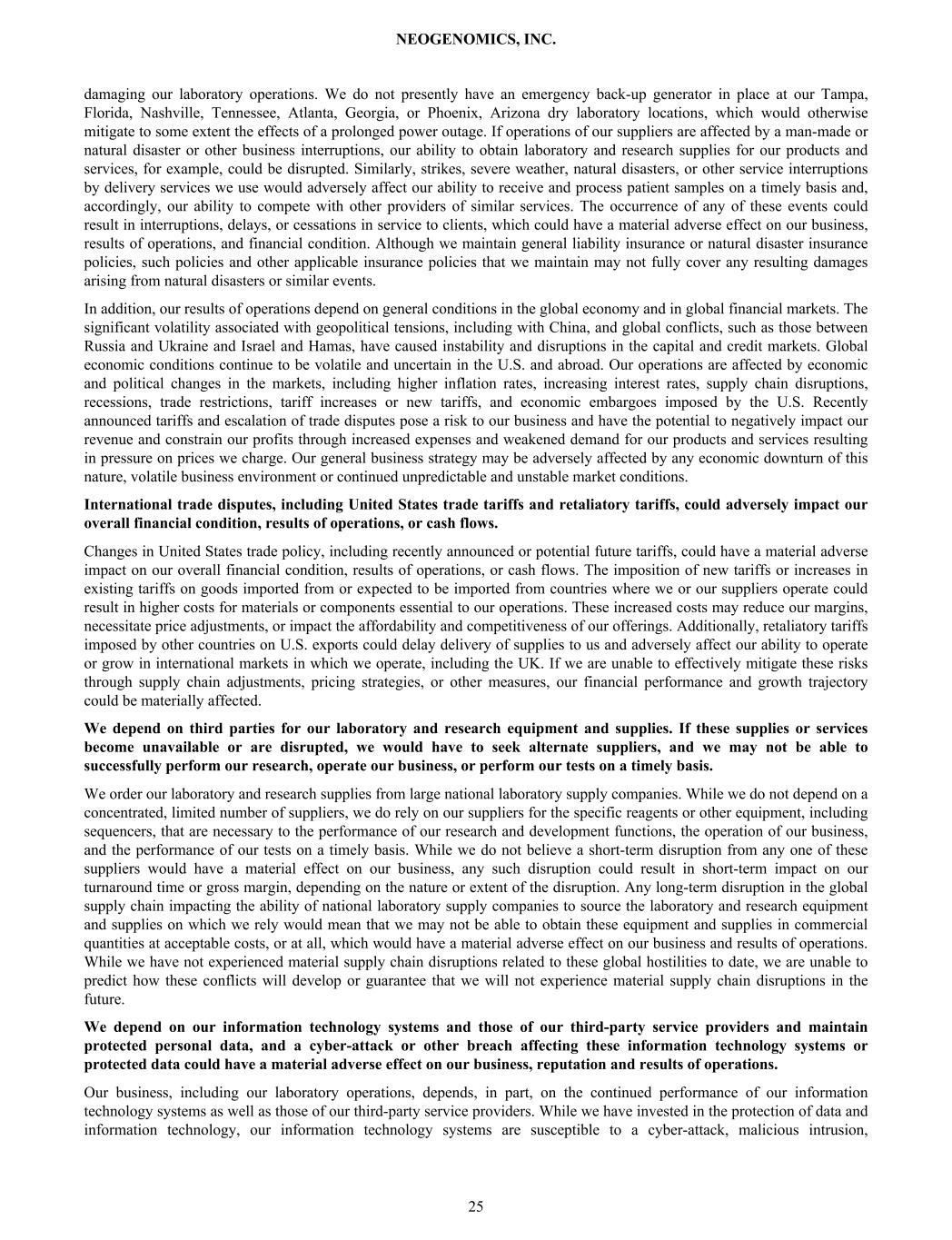 damaging our laboratory operations. We do not presently have an emergency back-up generator in place at our Tampa, Florida, Nashville, Tennessee, Atlanta, Georgia, or Phoenix, Arizona dry laboratory locations, which would otherwise mitigate to some extent the effects of a prolonged power outage. If operations of our suppliers are affected by a man-made or natural disaster or other business interruptions, our ability to obtain laboratory and research supplies for our products and services, for example, could be disrupted. Similarly, strikes, severe weather, natural disasters, or other service interruptions by delivery services we use would adversely affect our ability to receive and process patient samples on a timely basis and, accordingly, our ability to compete with other providers of similar services. The occurrence of any of these events could result in interruptions, delays, or cessations in service to clients, which could have a material adverse effect on our business, results of operations, and financial condition. Although we maintain general liability insurance or natural disaster insurance policies, such policies and other applicable insurance policies that we maintain may not fully cover any resulting damages arising from natural disasters or similar events. In addition, our results of operations depend on general conditions in the global economy and in global financial markets. The significant volatility associated with geopolitical tensions, including with China, and global conflicts, such as those between Russia and Ukraine and Israel and Hamas, have caused instability and disruptions in the capital and credit markets. Global economic conditions continue to be volatile and uncertain in the U.S. and abroad. Our operations are affected by economic and political changes in the markets, including higher inflation rates, increasing interest rates, supply chain disruptions, recessions, trade restrictions, tariff increases or new tariffs, and economic embargoes imposed by the U.S. Recently announced tariffs and escalation of trade disputes pose a risk to our business and have the potential to negatively impact our revenue and constrain our profits through increased expenses and weakened demand for our products and services resulting in pressure on prices we charge. Our general business strategy may be adversely affected by any economic downturn of this nature, volatile business environment or continued unpredictable and unstable market conditions. International trade disputes, including United States trade tariffs and retaliatory tariffs, could adversely impact our overall financial condition, results of operations, or cash flows. Changes in United States trade policy, including recently announced or potential future tariffs, could have a material adverse impact on our overall financial condition, results of operations, or cash flows. The imposition of new tariffs or increases in existing tariffs on goods imported from or expected to be imported from countries where we or our suppliers operate could result in higher costs for materials or components essential to our operations. These increased costs may reduce our margins, necessitate price adjustments, or impact the affordability and competitiveness of our offerings. Additionally, retaliatory tariffs imposed by other countries on U.S. exports could delay delivery of supplies to us and adversely affect our ability to operate or grow in international markets in which we operate, including the UK. If we are unable to effectively mitigate these risks through supply chain adjustments, pricing strategies, or other measures, our financial performance and growth trajectory could be materially affected. We depend on third parties for our laboratory and research equipment and supplies. If these supplies or services become unavailable or are disrupted, we would have to seek alternate suppliers, and we may not be able to successfully perform our research, operate our business, or perform our tests on a timely basis. We order our laboratory and research supplies from large national laboratory supply companies. While we do not depend on a concentrated, limited number of suppliers, we do rely on our suppliers for the specific reagents or other equipment, including sequencers, that are necessary to the performance of our research and development functions, the operation of our business, and the performance of our tests on a timely basis. While we do not believe a short-term disruption from any one of these suppliers would have a material effect on our business, any such disruption could result in short-term impact on our turnaround time or gross margin, depending on the nature or extent of the disruption. Any long-term disruption in the global supply chain impacting the ability of national laboratory supply companies to source the laboratory and research equipment and supplies on which we rely would mean that we may not be able to obtain these equipment and supplies in commercial quantities at acceptable costs, or at all, which would have a material adverse effect on our business and results of operations. While we have not experienced material supply chain disruptions related to these global hostilities to date, we are unable to predict how these conflicts will develop or guarantee that we will not experience material supply chain disruptions in the future. We depend on our information technology systems and those of our third-party service providers and maintain protected personal data, and a cyber-attack or other breach affecting these information technology systems or protected data could have a material adverse effect on our business, reputation and results of operations. Our business, including our laboratory operations, depends, in part, on the continued performance of our information technology systems as well as those of our third-party service providers. While we have invested in the protection of data and information technology, our i