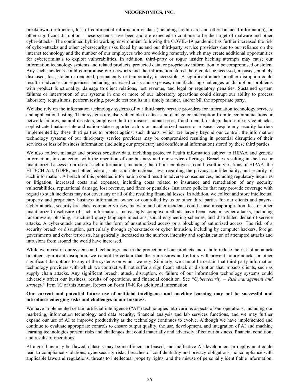 breakdown, destruction, loss of confidential information or data (including credit card and other financial information), or other significant disruption. These systems have been and are expected to continue to be the target of malware and other cyber-attacks. The continued hybrid working environment following the COVID-19 pandemic has further increased the risk of cyber-attacks and other cybersecurity risks faced by us and our third-party service providers due to our reliance on the internet technology and the number of our employees who are working remotely, which may create additional opportunities for cybercriminals to exploit vulnerabilities. In addition, third-party or rogue insider hacking attempts may cause our information technology systems and related products, protected data, or proprietary information to be compromised or stolen. Any such incidents could compromise our networks and the information stored there could be accessed, misused, publicly disclosed, lost, stolen or rendered, permanently or temporarily, inaccessible. A significant attack or other disruption could result in adverse consequences, including increased costs and expenses, manufacturing challenges or disruption, problems with product functionality, damage to client relations, lost revenue, and legal or regulatory penalties. Sustained system failures or interruption of our systems in one or more of our laboratory operations could disrupt our ability to process laboratory requisitions, perform testing, provide test results in a timely manner, and/or bill the appropriate party. We also rely on the information technology systems of our third-party service providers for information technology services and application hosting. Their systems are also vulnerable to attack and damage or interruption from telecommunications or network failures, natural disasters, employee theft or misuse, human error, fraud, denial, or degradation of service attacks, sophisticated nation-state and nation-state supported actors or unauthorized access or misuse. Despite any security barriers implemented by these third parties to protect against such threats, which are largely beyond our control, the information technology systems of our third-party service providers may be compromised resulting in potential disruption of their services or loss of business information (including our proprietary and confidential information) stored by these third parties. We also collect, manage and process sensitive data, including protected health information subject to HIPAA and genetic information, in connection with the operation of our business and our service offerings. Breaches resulting in the loss or unauthorized access to or use of such information, including that of our employees, could result in violations of HIPAA, the HITECH Act, GDPR, and other federal, state, and international laws regarding the privacy, confidentiality, and security of such information. A breach of this protected information could result in adverse consequences, including regulatory inquiries or litigation, increased costs and expenses, including costs related to insurance and remediation of any security vulnerabilities, reputational damage, lost revenue, and fines or penalties. Insurance policies that may provide coverage with regard to such incidents may not cover any or all of the resulting financial losses. In addition, we collect and store intellectual property and proprietary business information owned or controlled by us or other third parties for our clients and payers. Cyber-attacks, security breaches, computer viruses, malware and other incidents could cause misappropriation, loss or other unauthorized disclosure of such information. Increasingly complex methods have been used in cyber-attacks, including ransomware, phishing, structured query language injections, social engineering schemes, and distributed denial-of-service attacks. A cyber-attack can also be in the form of unauthorized access or a blocking of authorized access. The risk of a security breach or disruption, particularly through cyber-attacks or cyber intrusion, including by computer hackers, foreign governments and cyber terrorists, has generally increased as the number, intensity and sophistication of attempted attacks and intrusions from around the world have increased. While we invest in our systems and technology and in the protection of our products and data to reduce the risk of an attack or other significant disruption, we cannot be certain that these measures and efforts will prevent future attacks or other significant disruptions to any of the systems on which we rely. Similarly, we cannot be certain that third-party information technology providers with which we contract will not suffer a significant attack or disruption that impacts clients, such as supply chain attacks. Any significant breach, attack, disruption, or failure of our information technology systems could adversely affect our business, results of operations, and financial condition. See “Cybersecurity – Risk management and strategy,” Item 1C of this Annual Report on Form 10-K for additional information. Our current and potential future use of artificial intelligence and machine learning may not be successful and introduces emerging risks and challenges to our business. We have implemented certain artificial intelligence (“AI”) technologies into various aspects of our operations, including our marketing, information technology and data security, financial analysis and lab services functions, and we may further expand our use of AI to improve productivity as the technology continues to evolve. Although we have implemented and continue to evaluate appropriate controls to ensure output quality, the use, development, and integration of AI and machine learning technologies present risks and challenges that could materially and adversely affect our business, financial condition, and results of operations. AI algorithms