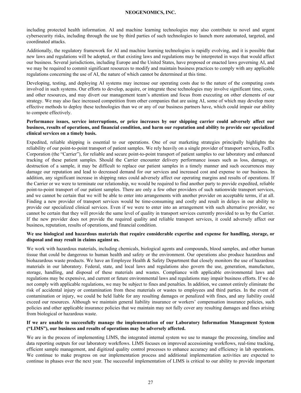 including protected health information. AI and machine learning technologies may also contribute to novel and urgent cybersecurity risks, including through the use by third parties of such technologies to launch more automated, targeted, and coordinated attacks. Additionally, the regulatory framework for AI and machine learning technologies is rapidly evolving, and it is possible that new laws and regulations will be adopted, or that existing laws and regulations may be interpreted in ways that would affect our business. Several jurisdictions, including Europe and the United States, have proposed or enacted laws governing AI, and we may be required to commit significant resources to modify and maintain business practices to comply with any applicable regulations concerning the use of AI, the nature of which cannot be determined at this time. Developing, testing, and deploying AI systems may increase our operating costs due to the nature of the computing costs involved in such systems. Our efforts to develop, acquire, or integrate these technologies may involve significant time, costs, and other resources, and may divert our management team’s attention and focus from executing on other elements of our strategy. We may also face increased competition from other companies that are using AI, some of which may develop more effective methods to deploy these technologies than we or any of our business partners have, which could impair our ability to compete effectively. Performance issues, service interruptions, or price increases by our shipping carrier could adversely affect our business, results of operations, and financial condition, and harm our reputation and ability to provide our specialized clinical services on a timely basis. Expedited, reliable shipping is essential to our operations. One of our marketing strategies principally highlights the reliability of our point-to-point transport of patient samples. We rely heavily on a single provider of transport services, FedEx Corporation (the “Carrier”), for reliable and secure point-to-point transport of patient samples to our laboratory and enhanced tracking of these patient samples. Should the Carrier encounter delivery performance issues such as loss, damage, or destruction of a sample, it may be difficult to replace our patient samples in a timely manner and such occurrences may damage our reputation and lead to decreased demand for our services and increased cost and expense to our business. In addition, any significant increase in shipping rates could adversely affect our operating margins and results of operations. If the Carrier or we were to terminate our relationship, we would be required to find another party to provide expedited, reliable point-to-point transport of our patient samples. There are only a few other providers of such nationwide transport services, and we cannot be certain that we will be able to enter into arrangements with another provider on acceptable terms, if at all. Finding a new provider of transport services would be time-consuming and costly and result in delays in our ability to provide our specialized clinical services. Even if we were to enter into an arrangement with such alternative provider, we cannot be certain that they will provide the same level of quality in transport services currently provided to us by the Carrier. If the new provider does not provide the required quality and reliable transport services, it could adversely affect our business, reputation, results of operations, and financial condition. We use biological and hazardous materials that require considerable expertise and expense for handling, storage, or disposal and may result in claims against us. We work with hazardous materials, including chemicals, biological agents and compounds, blood samples, and other human tissue that could be dangerous to human health and safety or the environment. Our operations also produce hazardous and biohazardous waste products. We have an Employee Health & Safety Department that closely monitors the use of hazardous materials in our laboratory. Federal, state, and local laws and regulations also govern the use, generation, manufacture, storage, handling, and disposal of these materials and wastes. Compliance with applicable environmental laws and regulations may be expensive, and current or future environmental laws and regulations may impair business efforts. If we do not comply with applicable regulations, we may be subject to fines and penalties. In addition, we cannot entirely eliminate the risk of accidental injury or contamination from these materials or wastes to employees and third parties. In the event of contamination or injury, we could be held liable for any resulting damages or penalized with fines, and any liability could exceed our resources. Although we maintain general liability insurance or workers’ compensation insurance policies, such policies and other applicable insurance policies that we maintain may not fully cover any resulting damages and fines arising from biological or hazardous waste. If we are unable to successfully manage the implementation of our Laboratory Information Management System (“LIMS”), our business and results of operations may be adversely affected. We are in the process of implementing LIMS, the integrated internal system we use to manage the processing, timeline and data reporting outputs for our laboratory workflows. LIMS focuses on improved accessioning workflows, real-time tracking, efficient sample management, and digitized quality control processes to enhance accuracy and efficiency in lab operations. We continue to make progress on our implementation process and additional implementation activities are expected to continue in phases over the next year. The successful implementation of LIMS is critical to our ability to provide important NEOGENOMICS, INC. 27