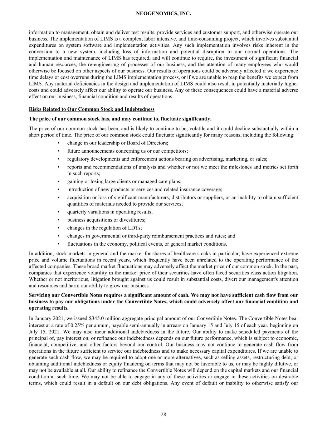 information to management, obtain and deliver test results, provide services and customer support, and otherwise operate our business. The implementation of LIMS is a complex, labor intensive, and time-consuming project, which involves substantial expenditures on system software and implementation activities. Any such implementation involves risks inherent in the conversion to a new system, including loss of information and potential disruption to our normal operations. The implementation and maintenance of LIMS has required, and will continue to require, the investment of significant financial and human resources, the re-engineering of processes of our business, and the attention of many employees who would otherwise be focused on other aspects of our business. Our results of operations could be adversely affected if we experience time delays or cost overruns during the LIMS implementation process, or if we are unable to reap the benefits we expect from LIMS. Any material deficiencies in the design and implementation of LIMS could also result in potentially materially higher costs and could adversely affect our ability to operate our business. Any of these consequences could have a material adverse effect on our business, financial condition and results of operations. Risks Related to Our Common Stock and Indebtedness The price of our common stock has, and may continue to, fluctuate significantly. The price of our common stock has been, and is likely to continue to be, volatile and it could decline substantially within a short period of time. The price of our common stock could fluctuate significantly for many reasons, including the following: • change in our leadership or Board of Directors; • future announcements concerning us or our competitors; • regulatory developments and enforcement actions bearing on advertising, marketing, or sales; • reports and recommendations of analysts and whether or not we meet the milestones and metrics set forth in such reports; • gaining or losing large clients or managed care plans; • introduction of new products or services and related insurance coverage; • acquisition or loss of significant manufacturers, distributors or suppliers, or an inability to obtain sufficient quantities of materials needed to provide our services; • quarterly variations in operating results; • business acquisitions or divestitures; • changes in the regulation of LDTs; • changes in governmental or third-party reimbursement practices and rates; and • fluctuations in the economy, political events, or general market conditions. In addition, stock markets in general and the market for shares of healthcare stocks in particular, have experienced extreme price and volume fluctuations in recent years, which frequently have been unrelated to the operating performance of the affected companies. These broad market fluctuations may adversely affect the market price of our common stock. In the past, companies that experience volatility in the market price of their securities have often faced securities class action litigation. Whether or not meritorious, litigation brought against us could result in substantial costs, divert our management's attention and resources and harm our ability to grow our business. Servicing our Convertible Notes requires a significant amount of cash. We may not have sufficient cash flow from our business to pay our obligations under the Convertible Notes, which could adversely affect our financial condition and operating results. In January 2021, we issued $345.0 million aggregate principal amount of our Convertible Notes. The Convertible Notes bear interest at a rate of 0.25% per annum, payable semi-annually in arrears on January 15 and July 15 of each year, beginning on July 15, 2021. We may also incur additional indebtedness in the future. Our ability to make scheduled payments of the principal of, pay interest on, or refinance our indebtedness depends on our future performance, which is subject to economic, financial, competitive, and other factors beyond our control. Our business may not continue to generate cash flow from operations in the future sufficient to service our indebtedness and to make necessary capital expenditures. If we are unable to generate such cash flow, we may be required to adopt one or more alternatives, such as selling assets, restructuring debt, or obtaining additional indebtedness or equity financing on terms that may not be favorable to us, or may be highly dilutive, or may not be available at all. Our ability to refinance the Convertible Notes will depend on the capital markets and our financial condition at such time. We may not be able to engage in any of these activities or engage in these activities on desirable terms, which could result in a default on our debt obligations. Any event of default or inability to otherwise satisfy our NEOGENOMICS, INC. 28
