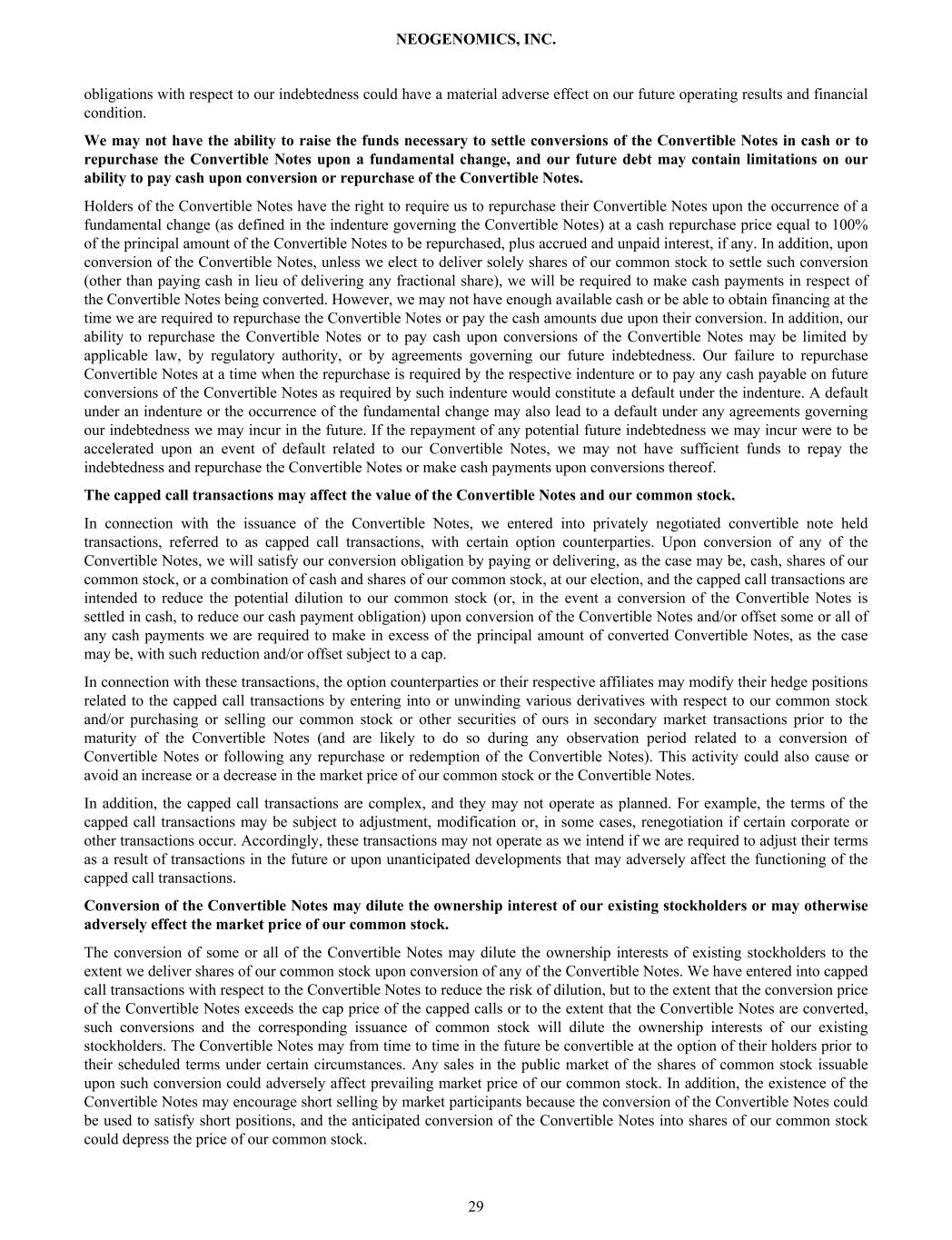 obligations with respect to our indebtedness could have a material adverse effect on our future operating results and financial condition. We may not have the ability to raise the funds necessary to settle conversions of the Convertible Notes in cash or to repurchase the Convertible Notes upon a fundamental change, and our future debt may contain limitations on our ability to pay cash upon conversion or repurchase of the Convertible Notes. Holders of the Convertible Notes have the right to require us to repurchase their Convertible Notes upon the occurrence of a fundamental change (as defined in the indenture governing the Convertible Notes) at a cash repurchase price equal to 100% of the principal amount of the Convertible Notes to be repurchased, plus accrued and unpaid interest, if any. In addition, upon conversion of the Convertible Notes, unless we elect to deliver solely shares of our common stock to settle such conversion (other than paying cash in lieu of delivering any fractional share), we will be required to make cash payments in respect of the Convertible Notes being converted. However, we may not have enough available cash or be able to obtain financing at the time we are required to repurchase the Convertible Notes or pay the cash amounts due upon their conversion. In addition, our ability to repurchase the Convertible Notes or to pay cash upon conversions of the Convertible Notes may be limited by applicable law, by regulatory authority, or by agreements governing our future indebtedness. Our failure to repurchase Convertible Notes at a time when the repurchase is required by the respective indenture or to pay any cash payable on future conversions of the Convertible Notes as required by such indenture would constitute a default under the indenture. A default under an indenture or the occurrence of the fundamental change may also lead to a default under any agreements governing our indebtedness we may incur in the future. If the repayment of any potential future indebtedness we may incur were to be accelerated upon an event of default related to our Convertible Notes, we may not have sufficient funds to repay the indebtedness and repurchase the Convertible Notes or make cash payments upon conversions thereof. The capped call transactions may affect the value of the Convertible Notes and our common stock. In connection with the issuance of the Convertible Notes, we entered into privately negotiated convertible note held transactions, referred to as capped call transactions, with certain option counterparties. Upon conversion of any of the Convertible Notes, we will satisfy our conversion obligation by paying or delivering, as the case may be, cash, shares of our common stock, or a combination of cash and shares of our common stock, at our election, and the capped call transactions are intended to reduce the potential dilution to our common stock (or, in the event a conversion of the Convertible Notes is settled in cash, to reduce our cash payment obligation) upon conversion of the Convertible Notes and/or offset some or all of any cash payments we are required to make in excess of the principal amount of converted Convertible Notes, as the case may be, with such reduction and/or offset subject to a cap. In connection with these transactions, the option counterparties or their respective affiliates may modify their hedge positions related to the capped call transactions by entering into or unwinding various derivatives with respect to our common stock and/or purchasing or selling our common stock or other securities of ours in secondary market transactions prior to the maturity of the Convertible Notes (and are likely to do so during any observation period related to a conversion of Convertible Notes or following any repurchase or redemption of the Convertible Notes). This activity could also cause or avoid an increase or a decrease in the market price of our common stock or the Convertible Notes. In addition, the capped call transactions are complex, and they may not operate as planned. For example, the terms of the capped call transactions may be subject to adjustment, modification or, in some cases, renegotiation if certain corporate or other transactions occur. Accordingly, these transactions may not operate as we intend if we are required to adjust their terms as a result of transactions in the future or upon unanticipated developments that may adversely affect the functioning of the capped call transactions. Conversion of the Convertible Notes may dilute the ownership interest of our existing stockholders or may otherwise adversely effect the market price of our common stock. The conversion of some or all of the Convertible Notes may dilute the ownership interests of existing stockholders to the extent we deliver shares of our common stock upon conversion of any of the Convertible Notes. We have entered into capped call transactions with respect to the Convertible Notes to reduce the risk of dilution, but to the extent that the conversion price of the Convertible Notes exceeds the cap price of the capped calls or to the extent that the Convertible Notes are converted, such conversions and the corresponding issuance of common stock will dilute the ownership interests of our existing stockholders. The Convertible Notes may from time to time in the future be convertible at the option of their holders prior to their scheduled terms under certain circumstances. Any sales in the public market of the shares of common stock issuable upon such conversion could adversely affect prevailing market price of our common stock. In addition, the existence of the Convertible Notes may encourage short selling by market participants because the conversion of the Convertible Notes could be used to satisfy short positions, and the anticipated conversion of the Convertible Notes into shares of our common stock could depress the price of our common stock. NEOGENOMICS, INC. 29
