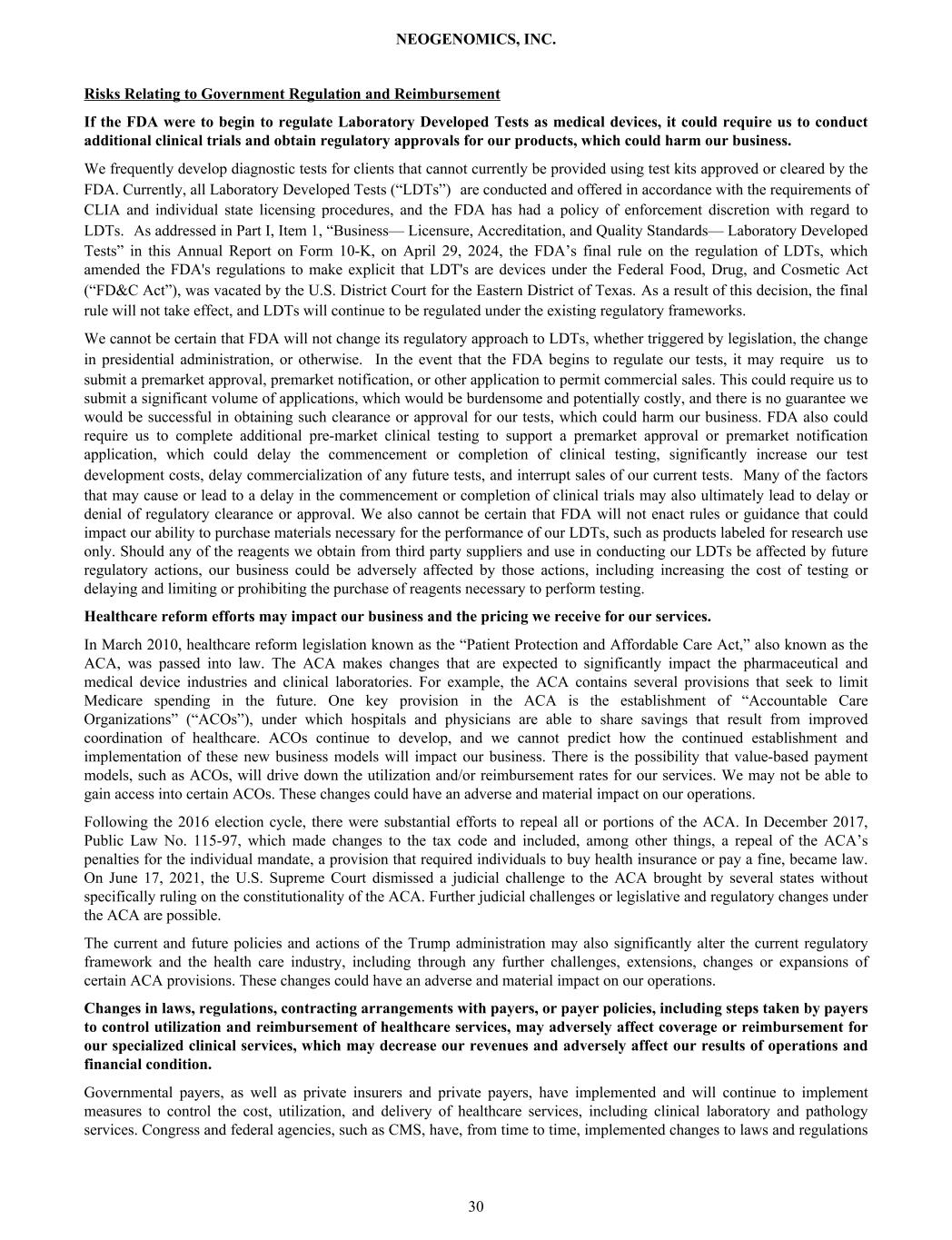 Risks Relating to Government Regulation and Reimbursement If the FDA were to begin to regulate Laboratory Developed Tests as medical devices, it could require us to conduct additional clinical trials and obtain regulatory approvals for our products, which could harm our business. We frequently develop diagnostic tests for clients that cannot currently be provided using test kits approved or cleared by the FDA. Currently, all Laboratory Developed Tests (“LDTs”) are conducted and offered in accordance with the requirements of CLIA and individual state licensing procedures, and the FDA has had a policy of enforcement discretion with regard to LDTs. As addressed in Part I, Item 1, “Business— Licensure, Accreditation, and Quality Standards— Laboratory Developed Tests” in this Annual Report on Form 10-K, on April 29, 2024, the FDA’s final rule on the regulation of LDTs, which amended the FDA's regulations to make explicit that LDT's are devices under the Federal Food, Drug, and Cosmetic Act (“FD&C Act”), was vacated by the U.S. District Court for the Eastern District of Texas. As a result of this decision, the final rule will not take effect, and LDTs will continue to be regulated under the existing regulatory frameworks. We cannot be certain that FDA will not change its regulatory approach to LDTs, whether triggered by legislation, the change in presidential administration, or otherwise. In the event that the FDA begins to regulate our tests, it may require us to submit a premarket approval, premarket notification, or other application to permit commercial sales. This could require us to submit a significant volume of applications, which would be burdensome and potentially costly, and there is no guarantee we would be successful in obtaining such clearance or approval for our tests, which could harm our business. FDA also could require us to complete additional pre-market clinical testing to support a premarket approval or premarket notification application, which could delay the commencement or completion of clinical testing, significantly increase our test development costs, delay commercialization of any future tests, and interrupt sales of our current tests. Many of the factors that may cause or lead to a delay in the commencement or completion of clinical trials may also ultimately lead to delay or denial of regulatory clearance or approval. We also cannot be certain that FDA will not enact rules or guidance that could impact our ability to purchase materials necessary for the performance of our LDTs, such as products labeled for research use only. Should any of the reagents we obtain from third party suppliers and use in conducting our LDTs be affected by future regulatory actions, our business could be adversely affected by those actions, including increasing the cost of testing or delaying and limiting or prohibiting the purchase of reagents necessary to perform testing. Healthcare reform efforts may impact our business and the pricing we receive for our services. In March 2010, healthcare reform legislation known as the “Patient Protection and Affordable Care Act,” also known as the ACA, was passed into law. The ACA makes changes that are expected to significantly impact the pharmaceutical and medical device industries and clinical laboratories. For example, the ACA contains several provisions that seek to limit Medicare spending in the future. One key provision in the ACA is the establishment of “Accountable Care Organizations” (“ACOs”), under which hospitals and physicians are able to share savings that result from improved coordination of healthcare. ACOs continue to develop, and we cannot predict how the continued establishment and implementation of these new business models will impact our business. There is the possibility that value-based payment models, such as ACOs, will drive down the utilization and/or reimbursement rates for our services. We may not be able to gain access into certain ACOs. These changes could have an adverse and material impact on our operations. Following the 2016 election cycle, there were substantial efforts to repeal all or portions of the ACA. In December 2017, Public Law No. 115-97, which made changes to the tax code and included, among other things, a repeal of the ACA’s penalties for the individual mandate, a provision that required individuals to buy health insurance or pay a fine, became law. On June 17, 2021, the U.S. Supreme Court dismissed a judicial challenge to the ACA brought by several states without specifically ruling on the constitutionality of the ACA. Further judicial challenges or legislative and regulatory changes under the ACA are possible. The current and future policies and actions of the Trump administration may also significantly alter the current regulatory framework and the health care industry, including through any further challenges, extensions, changes or expansions of certain ACA provisions. These changes could have an adverse and material impact on our operations. Changes in laws, regulations, contracting arrangements with payers, or payer policies, including steps taken by payers to control utilization and reimbursement of healthcare services, may adversely affect coverage or reimbursement for our specialized clinical services, which may decrease our revenues and adversely affect our results of operations and financial condition. Governmental payers, as well as private insurers and private payers, have implemented and will continue to implement measures to control the cost, utilization, and delivery of healthcare services, including clinical laboratory and pathology services. Congress and federal agencies, such as CMS, have, from time to time, implemented changes to laws and regulations NEOGENOMICS, INC. 30