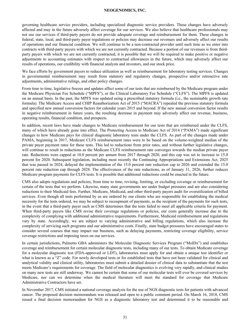 governing healthcare service providers, including specialized diagnostic service providers. These changes have adversely affected and may in the future adversely affect coverage for our services. We also believe that healthcare professionals may not use our services if third-party payers do not provide adequate coverage and reimbursement for them. These changes in federal, state, local, and third-party payer regulations or policies may decrease our revenues and adversely affect our results of operations and our financial condition. We will continue to be a non-contracted provider until such time as we enter into contracts with third-party payers with which we are not currently contracted. Because a portion of our revenues is from third- party payers with which we are not currently contracted, it is possible that we will be required to make positive or negative adjustments to accounting estimates with respect to contractual allowances in the future, which may adversely affect our results of operations, our credibility with financial analysts and investors, and our stock price. We face efforts by government payers to reduce utilization as well as reimbursement for laboratory testing services. Changes in governmental reimbursement may result from statutory and regulatory changes, prospective and/or retroactive rate adjustments, administrative rulings, and other policy changes. From time to time, legislative freezes and updates affect some of our tests that are reimbursed by the Medicare program under the Medicare Physician Fee Schedule (“MPFS”), or the Clinical Laboratory Fee Schedule (“CLFS”). The MPFS is updated on an annual basis. In the past, the MPFS was updated using a prescribed statutory formula (i.e., the sustainable growth rate formula). The Medicare Access and CHIP Reauthorization Act of 2015 (“MACRA”) repealed the previous statutory formula and specified new annual conversion factors for calendar years 2015 and beyond. If the new annual conversion factor results in negative reimbursement in future years, the resulting decrease in payment may adversely affect our revenue, business, operating results, financial condition, and prospects. In addition, recent laws have made changes to Medicare reimbursement for our tests that are reimbursed under the CLFS, many of which have already gone into effect. The Protecting Access to Medicare Act of 2014 (“PAMA”) made significant changes to how Medicare pays for clinical diagnostic laboratory tests under the CLFS. As part of the changes made under PAMA, beginning in 2017, Medicare CLFS reimbursement rates were to be based on the volume-weighted median of the private payer payment rates for these tests. This led to reductions from prior rates, and without further legislative changes, will continue to result in reductions as the Medicare CLFS reimbursement rate converges towards the median private payer rate. Reductions were capped at 10.0 percent per annum from 2017 through 2020, and this cap was set to increase to 15.0 percent for 2020. Subsequent legislation, including most recently the Continuing Appropriations and Extensions Act, 2025 that was passed in 2024, delayed the implementation of the 15.0 percent rate reduction cap to 2026 and extended the 15.0 percent rate reduction cap through 2028. The effectiveness of the rate reductions, as of January 31, 2026, further reduces Medicare program payments for CLFS tests. It is possible that additional reductions could be enacted in the future. CMS also adopts regulations and policies, from time to time, revising, limiting, or excluding coverage or reimbursement for certain of the tests that we perform. Likewise, many state governments are under budget pressures and are also considering reductions to their Medicaid fees. Further, Medicare, Medicaid, and other third-party payers audit for overutilization of billed services. Even though all tests performed by us are ordered by our clients who are responsible for establishing the medical necessity for the tests ordered, we may be subject to recoupment of payments, as the recipient of the payments for such tests, in the event that a third-party payer such as CMS determines that the tests failed to meet all applicable criteria for payment. When third-party payers like CMS revise their coverage regulations or policies, our costs generally increase due to the complexity of complying with additional administrative requirements. Furthermore, Medicaid reimbursement and regulations vary by state. Accordingly, we are subject to varying administrative and billing regulations, which also increase the complexity of servicing such programs and our administrative costs. Finally, state budget pressures have encouraged states to consider several courses that may impact our business, such as delaying payments, restricting coverage eligibility, service coverage restrictions and imposing taxes on our services. In certain jurisdictions, Palmetto GBA administers the Molecular Diagnostic Services Program (“MolDx”) and establishes coverage and reimbursement for certain molecular diagnostic tests, including many of our tests. To obtain Medicare coverage for a molecular diagnostic test (FDA-approved or LDT), laboratories must apply for and obtain a unique test identifier or what is known as a “Z” code. For newly developed tests or for established tests that have not been validated for clinical and analytical validity and clinical utility, laboratories must submit a detailed dossier of clinical data to substantiate that the test meets Medicare’s requirements for coverage. The field of molecular diagnostics is evolving very rapidly, and clinical studies on many new tests are still underway. We cannot be certain that some of our molecular tests will ever be covered services by Medicare, nor can we determine when the medical literature will meet the standard for coverage that Medicare Administrative Contractors have set. In November 2017, CMS initiated