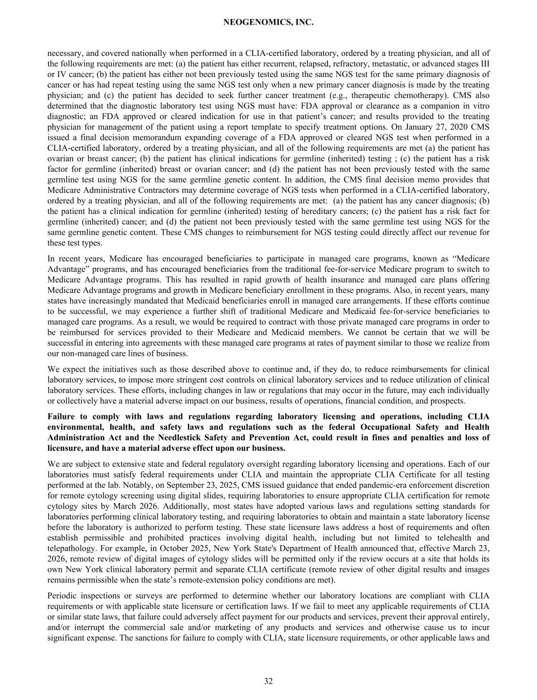 necessary, and covered nationally when performed in a CLIA-certified laboratory, ordered by a treating physician, and all of the following requirements are met: (a) the patient has either recurrent, relapsed, refractory, metastatic, or advanced stages III or IV cancer; (b) the patient has either not been previously tested using the same NGS test for the same primary diagnosis of cancer or has had repeat testing using the same NGS test only when a new primary cancer diagnosis is made by the treating physician; and (c) the patient has decided to seek further cancer treatment (e.g., therapeutic chemotherapy). CMS also determined that the diagnostic laboratory test using NGS must have: FDA approval or clearance as a companion in vitro diagnostic; an FDA approved or cleared indication for use in that patient’s cancer; and results provided to the treating physician for management of the patient using a report template to specify treatment options. On January 27, 2020 CMS issued a final decision memorandum expanding coverage of a FDA approved or cleared NGS test when performed in a CLIA-certified laboratory, ordered by a treating physician, and all of the following requirements are met (a) the patient has ovarian or breast cancer; (b) the patient has clinical indications for germline (inherited) testing ; (c) the patient has a risk factor for germline (inherited) breast or ovarian cancer; and (d) the patient has not been previously tested with the same germline test using NGS for the same germline genetic content. In addition, the CMS final decision memo provides that Medicare Administrative Contractors may determine coverage of NGS tests when performed in a CLIA-certified laboratory, ordered by a treating physician, and all of the following requirements are met: (a) the patient has any cancer diagnosis; (b) the patient has a clinical indication for germline (inherited) testing of hereditary cancers; (c) the patient has a risk fact for germline (inherited) cancer; and (d) the patient not been previously tested with the same germline test using NGS for the same germline genetic content. These CMS changes to reimbursement for NGS testing could directly affect our revenue for these test types. In recent years, Medicare has encouraged beneficiaries to participate in managed care programs, known as “Medicare Advantage” programs, and has encouraged beneficiaries from the traditional fee-for-service Medicare program to switch to Medicare Advantage programs. This has resulted in rapid growth of health insurance and managed care plans offering Medicare Advantage programs and growth in Medicare beneficiary enrollment in these programs. Also, in recent years, many states have increasingly mandated that Medicaid beneficiaries enroll in managed care arrangements. If these efforts continue to be successful, we may experience a further shift of traditional Medicare and Medicaid fee-for-service beneficiaries to managed care programs. As a result, we would be required to contract with those private managed care programs in order to be reimbursed for services provided to their Medicare and Medicaid members. We cannot be certain that we will be successful in entering into agreements with these managed care programs at rates of payment similar to those we realize from our non-managed care lines of business. We expect the initiatives such as those described above to continue and, if they do, to reduce reimbursements for clinical laboratory services, to impose more stringent cost controls on clinical laboratory services and to reduce utilization of clinical laboratory services. These efforts, including changes in law or regulations that may occur in the future, may each individually or collectively have a material adverse impact on our business, results of operations, financial condition, and prospects. Failure to comply with laws and regulations regarding laboratory licensing and operations, including CLIA environmental, health, and safety laws and regulations such as the federal Occupational Safety and Health Administration Act and the Needlestick Safety and Prevention Act, could result in fines and penalties and loss of licensure, and have a material adverse effect upon our business. We are subject to extensive state and federal regulatory oversight regarding laboratory licensing and operations. Each of our laboratories must satisfy federal requirements under CLIA and maintain the appropriate CLIA Certificate for all testing performed at the lab. Notably, on September 23, 2025, CMS issued guidance that ended pandemic-era enforcement discretion for remote cytology screening using digital slides, requiring laboratories to ensure appropriate CLIA certification for remote cytology sites by March 2026. Additionally, most states have adopted various laws and regulations setting standards for laboratories performing clinical laboratory testing, and requiring laboratories to obtain and maintain a state laboratory license before the laboratory is authorized to perform testing. These state licensure laws address a host of requirements and often establish permissible and prohibited practices involving digital health, including but not limited to telehealth and telepathology. For example, in October 2025, New York State's Department of Health announced that, effective March 23, 2026, remote review of digital images of cytology slides will be permitted only if the review occurs at a site that holds its own New York clinical laboratory permit and separate CLIA certificate (remote review of other digital results and images remains permissible when the state’s remote-extension policy conditions are met). Periodic inspections or surveys are performed to determine whether our laboratory locations are compliant with CLIA requirements or with applicable state licensure or certification laws. If we fail to meet any applicable requirements of CLIA or similar state laws, that failure could adversely affect payment for our produ