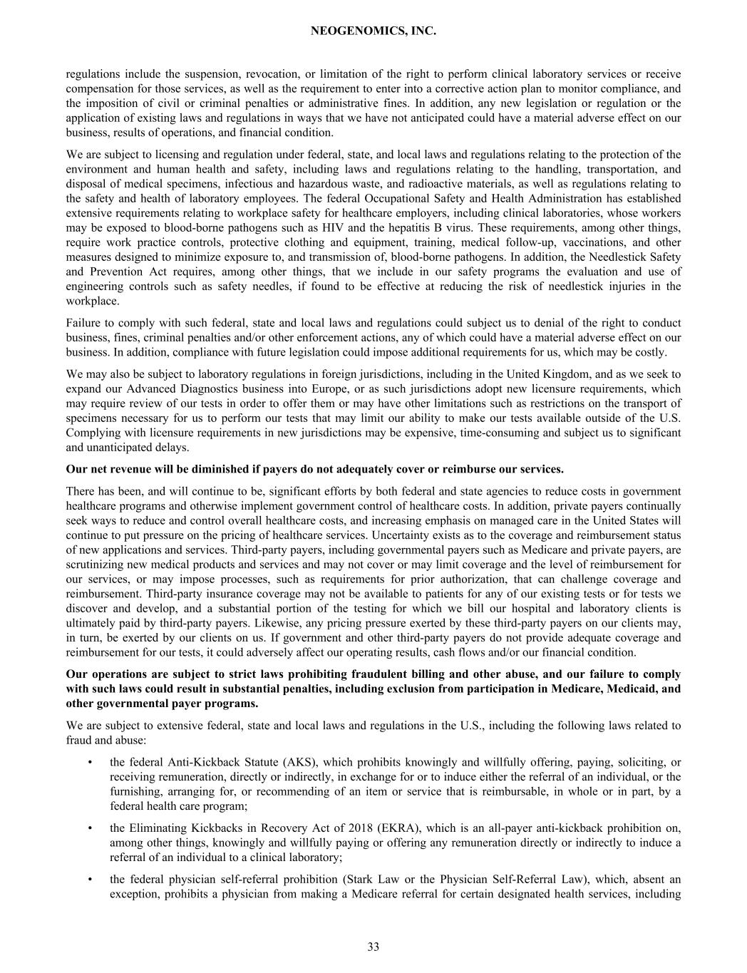 regulations include the suspension, revocation, or limitation of the right to perform clinical laboratory services or receive compensation for those services, as well as the requirement to enter into a corrective action plan to monitor compliance, and the imposition of civil or criminal penalties or administrative fines. In addition, any new legislation or regulation or the application of existing laws and regulations in ways that we have not anticipated could have a material adverse effect on our business, results of operations, and financial condition. We are subject to licensing and regulation under federal, state, and local laws and regulations relating to the protection of the environment and human health and safety, including laws and regulations relating to the handling, transportation, and disposal of medical specimens, infectious and hazardous waste, and radioactive materials, as well as regulations relating to the safety and health of laboratory employees. The federal Occupational Safety and Health Administration has established extensive requirements relating to workplace safety for healthcare employers, including clinical laboratories, whose workers may be exposed to blood-borne pathogens such as HIV and the hepatitis B virus. These requirements, among other things, require work practice controls, protective clothing and equipment, training, medical follow-up, vaccinations, and other measures designed to minimize exposure to, and transmission of, blood-borne pathogens. In addition, the Needlestick Safety and Prevention Act requires, among other things, that we include in our safety programs the evaluation and use of engineering controls such as safety needles, if found to be effective at reducing the risk of needlestick injuries in the workplace. Failure to comply with such federal, state and local laws and regulations could subject us to denial of the right to conduct business, fines, criminal penalties and/or other enforcement actions, any of which could have a material adverse effect on our business. In addition, compliance with future legislation could impose additional requirements for us, which may be costly. We may also be subject to laboratory regulations in foreign jurisdictions, including in the United Kingdom, and as we seek to expand our Advanced Diagnostics business into Europe, or as such jurisdictions adopt new licensure requirements, which may require review of our tests in order to offer them or may have other limitations such as restrictions on the transport of specimens necessary for us to perform our tests that may limit our ability to make our tests available outside of the U.S. Complying with licensure requirements in new jurisdictions may be expensive, time-consuming and subject us to significant and unanticipated delays. Our net revenue will be diminished if payers do not adequately cover or reimburse our services. There has been, and will continue to be, significant efforts by both federal and state agencies to reduce costs in government healthcare programs and otherwise implement government control of healthcare costs. In addition, private payers continually seek ways to reduce and control overall healthcare costs, and increasing emphasis on managed care in the United States will continue to put pressure on the pricing of healthcare services. Uncertainty exists as to the coverage and reimbursement status of new applications and services. Third-party payers, including governmental payers such as Medicare and private payers, are scrutinizing new medical products and services and may not cover or may limit coverage and the level of reimbursement for our services, or may impose processes, such as requirements for prior authorization, that can challenge coverage and reimbursement. Third-party insurance coverage may not be available to patients for any of our existing tests or for tests we discover and develop, and a substantial portion of the testing for which we bill our hospital and laboratory clients is ultimately paid by third-party payers. Likewise, any pricing pressure exerted by these third-party payers on our clients may, in turn, be exerted by our clients on us. If government and other third-party payers do not provide adequate coverage and reimbursement for our tests, it could adversely affect our operating results, cash flows and/or our financial condition. Our operations are subject to strict laws prohibiting fraudulent billing and other abuse, and our failure to comply with such laws could result in substantial penalties, including exclusion from participation in Medicare, Medicaid, and other governmental payer programs. We are subject to extensive federal, state and local laws and regulations in the U.S., including the following laws related to fraud and abuse: • the federal Anti-Kickback Statute (AKS), which prohibits knowingly and willfully offering, paying, soliciting, or receiving remuneration, directly or indirectly, in exchange for or to induce either the referral of an individual, or the furnishing, arranging for, or recommending of an item or service that is reimbursable, in whole or in part, by a federal health care program; • the Eliminating Kickbacks in Recovery Act of 2018 (EKRA), which is an all-payer anti-kickback prohibition on, among other things, knowingly and willfully paying or offering any remuneration directly or indirectly to induce a referral of an individual to a clinical laboratory; • the federal physician self-referral prohibition (Stark Law or the Physician Self-Referral Law), which, absent an exception, prohibits a physician from making a Medicare referral for certain designated health services, including NEOGENOMICS, INC. 33