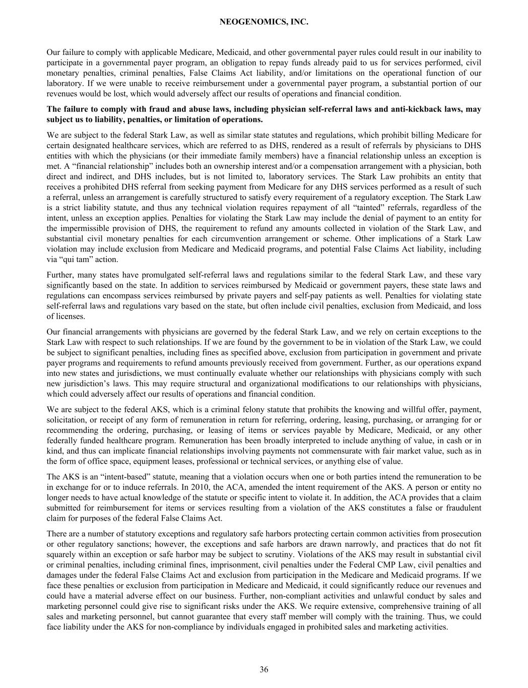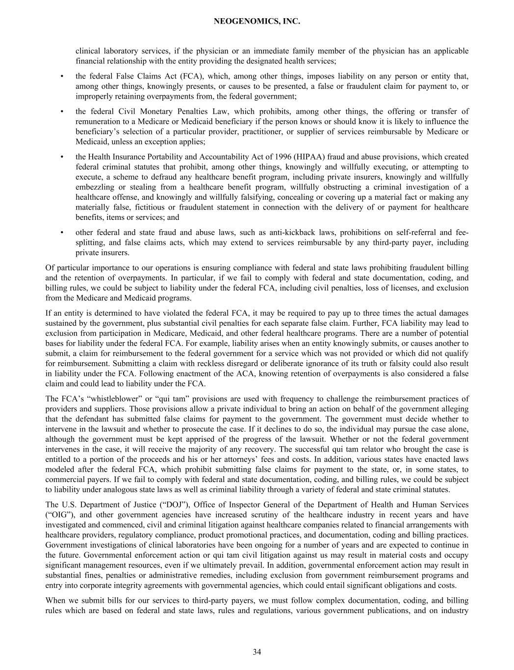 clinical laboratory services, if the physician or an immediate family member of the physician has an applicable financial relationship with the entity providing the designated health services; • the federal False Claims Act (FCA), which, among other things, imposes liability on any person or entity that, among other things, knowingly presents, or causes to be presented, a false or fraudulent claim for payment to, or improperly retaining overpayments from, the federal government; • the federal Civil Monetary Penalties Law, which prohibits, among other things, the offering or transfer of remuneration to a Medicare or Medicaid beneficiary if the person knows or should know it is likely to influence the beneficiary’s selection of a particular provider, practitioner, or supplier of services reimbursable by Medicare or Medicaid, unless an exception applies; • the Health Insurance Portability and Accountability Act of 1996 (HIPAA) fraud and abuse provisions, which created federal criminal statutes that prohibit, among other things, knowingly and willfully executing, or attempting to execute, a scheme to defraud any healthcare benefit program, including private insurers, knowingly and willfully embezzling or stealing from a healthcare benefit program, willfully obstructing a criminal investigation of a healthcare offense, and knowingly and willfully falsifying, concealing or covering up a material fact or making any materially false, fictitious or fraudulent statement in connection with the delivery of or payment for healthcare benefits, items or services; and • other federal and state fraud and abuse laws, such as anti-kickback laws, prohibitions on self-referral and fee- splitting, and false claims acts, which may extend to services reimbursable by any third-party payer, including private insurers. Of particular importance to our operations is ensuring compliance with federal and state laws prohibiting fraudulent billing and the retention of overpayments. In particular, if we fail to comply with federal and state documentation, coding, and billing rules, we could be subject to liability under the federal FCA, including civil penalties, loss of licenses, and exclusion from the Medicare and Medicaid programs. If an entity is determined to have violated the federal FCA, it may be required to pay up to three times the actual damages sustained by the government, plus substantial civil penalties for each separate false claim. Further, FCA liability may lead to exclusion from participation in Medicare, Medicaid, and other federal healthcare programs. There are a number of potential bases for liability under the federal FCA. For example, liability arises when an entity knowingly submits, or causes another to submit, a claim for reimbursement to the federal government for a service which was not provided or which did not qualify for reimbursement. Submitting a claim with reckless disregard or deliberate ignorance of its truth or falsity could also result in liability under the FCA. Following enactment of the ACA, knowing retention of overpayments is also considered a false claim and could lead to liability under the FCA. The FCA’s “whistleblower” or “qui tam” provisions are used with frequency to challenge the reimbursement practices of providers and suppliers. Those provisions allow a private individual to bring an action on behalf of the government alleging that the defendant has submitted false claims for payment to the government. The government must decide whether to intervene in the lawsuit and whether to prosecute the case. If it declines to do so, the individual may pursue the case alone, although the government must be kept apprised of the progress of the lawsuit. Whether or not the federal government intervenes in the case, it will receive the majority of any recovery. The successful qui tam relator who brought the case is entitled to a portion of the proceeds and his or her attorneys’ fees and costs. In addition, various states have enacted laws modeled after the federal FCA, which prohibit submitting false claims for payment to the state, or, in some states, to commercial payers. If we fail to comply with federal and state documentation, coding, and billing rules, we could be subject to liability under analogous state laws as well as criminal liability through a variety of federal and state criminal statutes. The U.S. Department of Justice (“DOJ”), Office of Inspector General of the Department of Health and Human Services (“OIG”), and other government agencies have increased scrutiny of the healthcare industry in recent years and have investigated and commenced, civil and criminal litigation against healthcare companies related to financial arrangements with healthcare providers, regulatory compliance, product promotional practices, and documentation, coding and billing practices. Government investigations of clinical laboratories have been ongoing for a number of years and are expected to continue in the future. Governmental enforcement action or qui tam civil litigation against us may result in material costs and occupy significant management resources, even if we ultimately prevail. In addition, governmental enforcement action may result in substantial fines, penalties or administrative remedies, including exclusion from government reimbursement programs and entry into corporate integrity agreements with governmental agencies, which could entail significant obligations and costs. When we submit bills for our services to third-party payers, we must follow complex documentation, coding, and billing rules which are based on federal and state laws, rules and regulations, various government publications, and on industry NEOGENOMICS, INC. 34