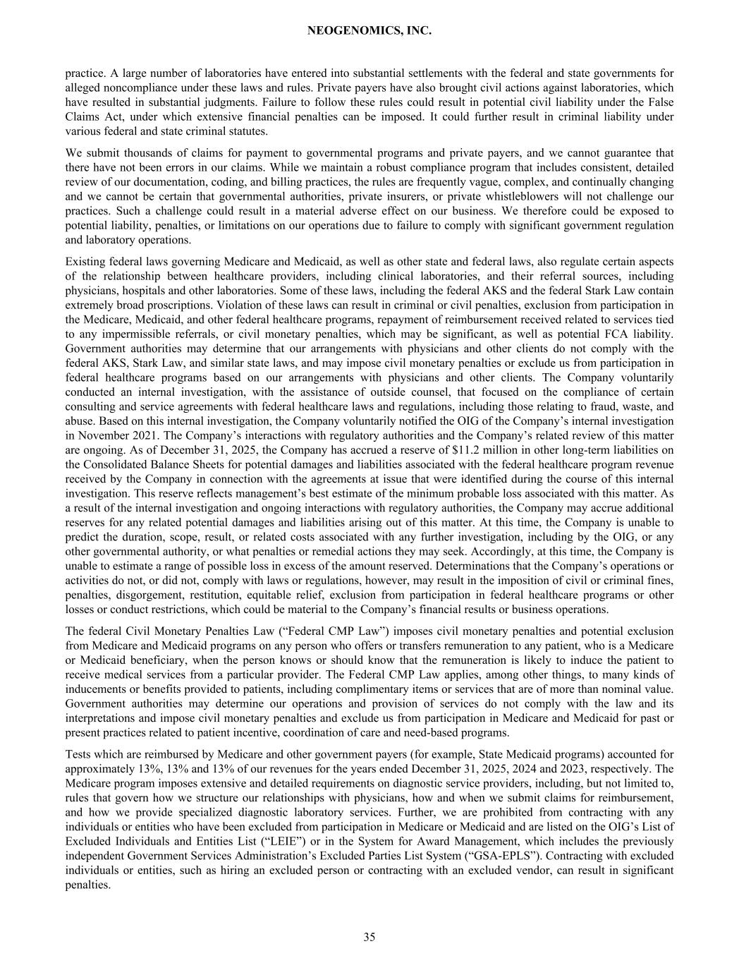 practice. A large number of laboratories have entered into substantial settlements with the federal and state governments for alleged noncompliance under these laws and rules. Private payers have also brought civil actions against laboratories, which have resulted in substantial judgments. Failure to follow these rules could result in potential civil liability under the False Claims Act, under which extensive financial penalties can be imposed. It could further result in criminal liability under various federal and state criminal statutes. We submit thousands of claims for payment to governmental programs and private payers, and we cannot guarantee that there have not been errors in our claims. While we maintain a robust compliance program that includes consistent, detailed review of our documentation, coding, and billing practices, the rules are frequently vague, complex, and continually changing and we cannot be certain that governmental authorities, private insurers, or private whistleblowers will not challenge our practices. Such a challenge could result in a material adverse effect on our business. We therefore could be exposed to potential liability, penalties, or limitations on our operations due to failure to comply with significant government regulation and laboratory operations. Existing federal laws governing Medicare and Medicaid, as well as other state and federal laws, also regulate certain aspects of the relationship between healthcare providers, including clinical laboratories, and their referral sources, including physicians, hospitals and other laboratories. Some of these laws, including the federal AKS and the federal Stark Law contain extremely broad proscriptions. Violation of these laws can result in criminal or civil penalties, exclusion from participation in the Medicare, Medicaid, and other federal healthcare programs, repayment of reimbursement received related to services tied to any impermissible referrals, or civil monetary penalties, which may be significant, as well as potential FCA liability. Government authorities may determine that our arrangements with physicians and other clients do not comply with the federal AKS, Stark Law, and similar state laws, and may impose civil monetary penalties or exclude us from participation in federal healthcare programs based on our arrangements with physicians and other clients. The Company voluntarily conducted an internal investigation, with the assistance of outside counsel, that focused on the compliance of certain consulting and service agreements with federal healthcare laws and regulations, including those relating to fraud, waste, and abuse. Based on this internal investigation, the Company voluntarily notified the OIG of the Company’s internal investigation in November 2021. The Company’s interactions with regulatory authorities and the Company’s related review of this matter are ongoing. As of December 31, 2025, the Company has accrued a reserve of $11.2 million in other long-term liabilities on the Consolidated Balance Sheets for potential damages and liabilities associated with the federal healthcare program revenue received by the Company in connection with the agreements at issue that were identified during the course of this internal investigation. This reserve reflects management’s best estimate of the minimum probable loss associated with this matter. As a result of the internal investigation and ongoing interactions with regulatory authorities, the Company may accrue additional reserves for any related potential damages and liabilities arising out of this matter. At this time, the Company is unable to predict the duration, scope, result, or related costs associated with any further investigation, including by the OIG, or any other governmental authority, or what penalties or remedial actions they may seek. Accordingly, at this time, the Company is unable to estimate a range of possible loss in excess of the amount reserved. Determinations that the Company’s operations or activities do not, or did not, comply with laws or regulations, however, may result in the imposition of civil or criminal fines, penalties, disgorgement, restitution, equitable relief, exclusion from participation in federal healthcare programs or other losses or conduct restrictions, which could be material to the Company’s financial results or business operations. The federal Civil Monetary Penalties Law (“Federal CMP Law”) imposes civil monetary penalties and potential exclusion from Medicare and Medicaid programs on any person who offers or transfers remuneration to any patient, who is a Medicare or Medicaid beneficiary, when the person knows or should know that the remuneration is likely to induce the patient to receive medical services from a particular provider. The Federal CMP Law applies, among other things, to many kinds of inducements or benefits provided to patients, including complimentary items or services that are of more than nominal value. Government authorities may determine our operations and provision of services do not comply with the law and its interpretations and impose civil monetary penalties and exclude us from participation in Medicare and Medicaid for past or present practices related to patient incentive, coordination of care and need-based programs. Tests which are reimbursed by Medicare and other government payers (for example, State Medicaid programs) accounted for approximately 13%, 13% and 13% of our revenues for the years ended December 31, 2025, 2024 and 2023, respectively. The Medicare program imposes extensive and detailed requirements on diagnostic service providers, including, but not limited to, rules that govern how we structure our relationships with physicians, how and when we submit claims for reimbursement, and how we provide specialized diagnostic laboratory services. Further, we are prohibited from contracting with any individuals or entities who have been excluded from 