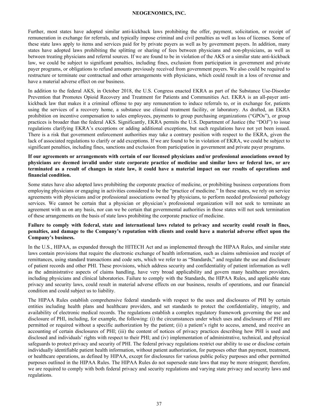 Further, most states have adopted similar anti-kickback laws prohibiting the offer, payment, solicitation, or receipt of remuneration in exchange for referrals, and typically impose criminal and civil penalties as well as loss of licenses. Some of these state laws apply to items and services paid for by private payers as well as by government payers. In addition, many states have adopted laws prohibiting the splitting or sharing of fees between physicians and non-physicians, as well as between treating physicians and referral sources. If we are found to be in violation of the AKS or a similar state anti-kickback law, we could be subject to significant penalties, including fines, exclusion from participation in government and private payer programs, or obligations to refund amounts previously received from government payers. We also could be required to restructure or terminate our contractual and other arrangements with physicians, which could result in a loss of revenue and have a material adverse effect on our business. In addition to the federal AKS, in October 2018, the U.S. Congress enacted EKRA as part of the Substance Use-Disorder Prevention that Promotes Opioid Recovery and Treatment for Patients and Communities Act. EKRA is an all-payer anti- kickback law that makes it a criminal offense to pay any remuneration to induce referrals to, or in exchange for, patients using the services of a recovery home, a substance use clinical treatment facility, or laboratory. As drafted, an EKRA prohibition on incentive compensation to sales employees, payments to group purchasing organizations (“GPOs”), or group practices is broader than the federal AKS. Significantly, EKRA permits the U.S. Department of Justice (the “DOJ”) to issue regulations clarifying EKRA’s exceptions or adding additional exceptions, but such regulations have not yet been issued. There is a risk that government enforcement authorities may take a contrary position with respect to the EKRA, given the lack of associated regulations to clarify or add exceptions. If we are found to be in violation of EKRA, we could be subject to significant penalties, including fines, sanctions and exclusion from participation in government and private payer programs. If our agreements or arrangements with certain of our licensed physicians and/or professional associations owned by physicians are deemed invalid under state corporate practice of medicine and similar laws or federal law, or are terminated as a result of changes in state law, it could have a material impact on our results of operations and financial condition. Some states have also adopted laws prohibiting the corporate practice of medicine, or prohibiting business corporations from employing physicians or engaging in activities considered to be the “practice of medicine.” In these states, we rely on service agreements with physicians and/or professional associations owned by physicians, to perform needed professional pathology services. We cannot be certain that a physician or physician’s professional organization will not seek to terminate an agreement with us on any basis, nor can we be certain that governmental authorities in those states will not seek termination of these arrangements on the basis of state laws prohibiting the corporate practice of medicine. Failure to comply with federal, state and international laws related to privacy and security could result in fines, penalties, and damage to the Company’s reputation with clients and could have a material adverse effect upon the Company’s business. In the U.S., HIPAA, as expanded through the HITECH Act and as implemented through the HIPAA Rules, and similar state laws contain provisions that require the electronic exchange of health information, such as claims submission and receipt of remittances, using standard transactions and code sets, which we refer to as “Standards,” and regulate the use and disclosure of patient records and other PHI. These provisions, which address security and confidentiality of patient information as well as the administrative aspects of claims handling, have very broad applicability and govern many healthcare providers, including physicians and clinical laboratories. Failure to comply with the Standards, the HIPAA Rules, and applicable state privacy and security laws, could result in material adverse effects on our business, results of operations, and our financial condition and could subject us to liability. The HIPAA Rules establish comprehensive federal standards with respect to the uses and disclosures of PHI by certain entities including health plans and healthcare providers, and set standards to protect the confidentiality, integrity, and availability of electronic medical records. The regulations establish a complex regulatory framework governing the use and disclosure of PHI, including, for example, the following: (i) the circumstances under which uses and disclosures of PHI are permitted or required without a specific authorization by the patient; (ii) a patient’s right to access, amend, and receive an accounting of certain disclosures of PHI; (iii) the content of notices of privacy practices describing how PHI is used and disclosed and individuals’ rights with respect to their PHI; and (iv) implementation of administrative, technical, and physical safeguards to protect privacy and security of PHI. The federal privacy regulations restrict our ability to use or disclose certain individually identifiable patient health information, without patient authorization, for purposes other than payment, treatment, or healthcare operations, as defined by HIPAA, except for disclosures for various public policy purposes and other permitted purposes outlined in the HIPAA Rules. The HIPAA Rules do not supersede state laws that may be more stringent; therefore, we are required to comply with both federal privacy and security regulations and varying state privacy and securi