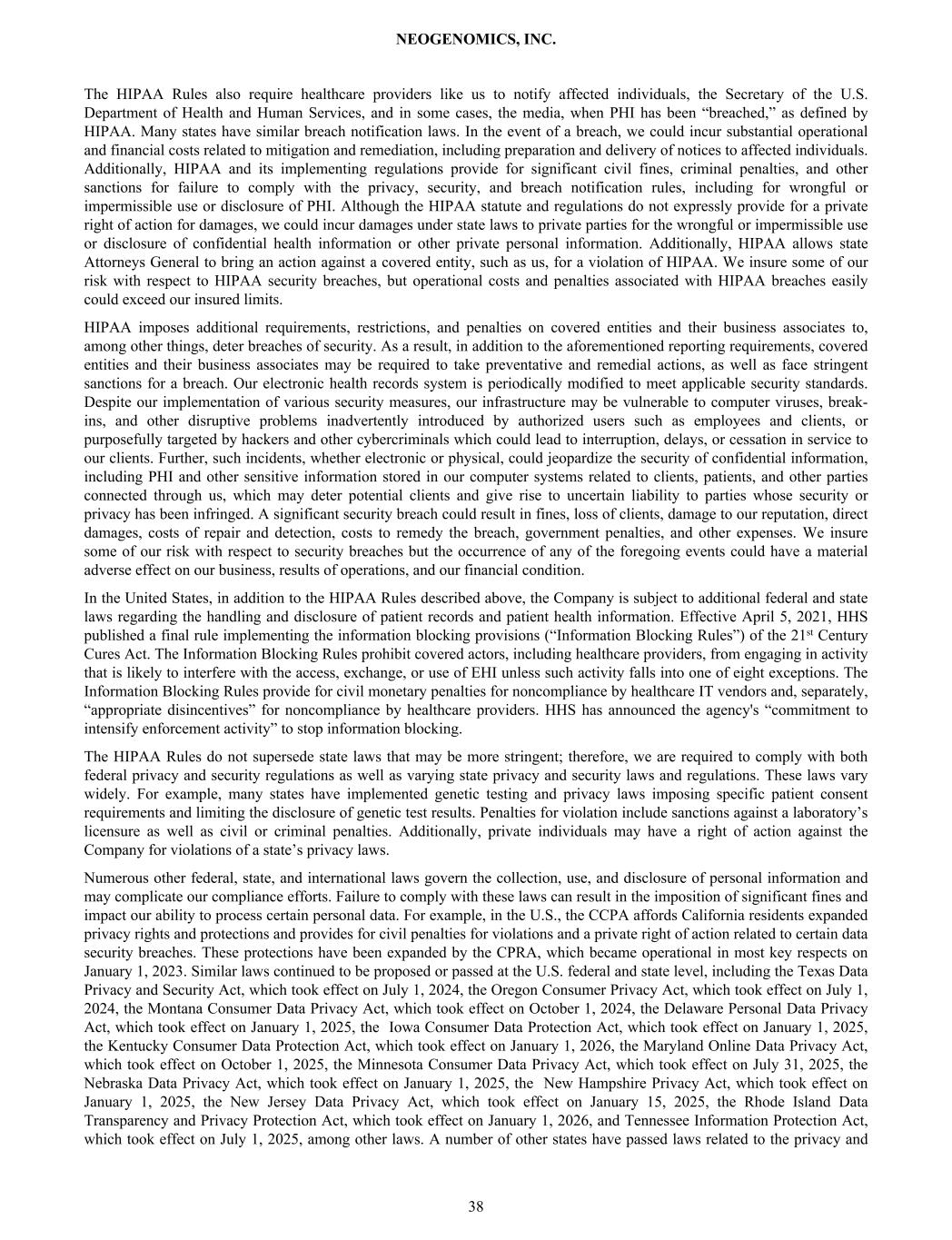 The HIPAA Rules also require healthcare providers like us to notify affected individuals, the Secretary of the U.S. Department of Health and Human Services, and in some cases, the media, when PHI has been “breached,” as defined by HIPAA. Many states have similar breach notification laws. In the event of a breach, we could incur substantial operational and financial costs related to mitigation and remediation, including preparation and delivery of notices to affected individuals. Additionally, HIPAA and its implementing regulations provide for significant civil fines, criminal penalties, and other sanctions for failure to comply with the privacy, security, and breach notification rules, including for wrongful or impermissible use or disclosure of PHI. Although the HIPAA statute and regulations do not expressly provide for a private right of action for damages, we could incur damages under state laws to private parties for the wrongful or impermissible use or disclosure of confidential health information or other private personal information. Additionally, HIPAA allows state Attorneys General to bring an action against a covered entity, such as us, for a violation of HIPAA. We insure some of our risk with respect to HIPAA security breaches, but operational costs and penalties associated with HIPAA breaches easily could exceed our insured limits. HIPAA imposes additional requirements, restrictions, and penalties on covered entities and their business associates to, among other things, deter breaches of security. As a result, in addition to the aforementioned reporting requirements, covered entities and their business associates may be required to take preventative and remedial actions, as well as face stringent sanctions for a breach. Our electronic health records system is periodically modified to meet applicable security standards. Despite our implementation of various security measures, our infrastructure may be vulnerable to computer viruses, break- ins, and other disruptive problems inadvertently introduced by authorized users such as employees and clients, or purposefully targeted by hackers and other cybercriminals which could lead to interruption, delays, or cessation in service to our clients. Further, such incidents, whether electronic or physical, could jeopardize the security of confidential information, including PHI and other sensitive information stored in our computer systems related to clients, patients, and other parties connected through us, which may deter potential clients and give rise to uncertain liability to parties whose security or privacy has been infringed. A significant security breach could result in fines, loss of clients, damage to our reputation, direct damages, costs of repair and detection, costs to remedy the breach, government penalties, and other expenses. We insure some of our risk with respect to security breaches but the occurrence of any of the foregoing events could have a material adverse effect on our business, results of operations, and our financial condition. In the United States, in addition to the HIPAA Rules described above, the Company is subject to additional federal and state laws regarding the handling and disclosure of patient records and patient health information. Effective April 5, 2021, HHS published a final rule implementing the information blocking provisions (“Information Blocking Rules”) of the 21st Century Cures Act. The Information Blocking Rules prohibit covered actors, including healthcare providers, from engaging in activity that is likely to interfere with the access, exchange, or use of EHI unless such activity falls into one of eight exceptions. The Information Blocking Rules provide for civil monetary penalties for noncompliance by healthcare IT vendors and, separately, “appropriate disincentives” for noncompliance by healthcare providers. HHS has announced the agency's “commitment to intensify enforcement activity” to stop information blocking. The HIPAA Rules do not supersede state laws that may be more stringent; therefore, we are required to comply with both federal privacy and security regulations as well as varying state privacy and security laws and regulations. These laws vary widely. For example, many states have implemented genetic testing and privacy laws imposing specific patient consent requirements and limiting the disclosure of genetic test results. Penalties for violation include sanctions against a laboratory’s licensure as well as civil or criminal penalties. Additionally, private individuals may have a right of action against the Company for violations of a state’s privacy laws. Numerous other federal, state, and international laws govern the collection, use, and disclosure of personal information and may complicate our compliance efforts. Failure to comply with these laws can result in the imposition of significant fines and impact our ability to process certain personal data. For example, in the U.S., the CCPA affords California residents expanded privacy rights and protections and provides for civil penalties for violations and a private right of action related to certain data security breaches. These protections have been expanded by the CPRA, which became operational in most key respects on January 1, 2023. Similar laws continued to be proposed or passed at the U.S. federal and state level, including the Texas Data Privacy and Security Act, which took effect on July 1, 2024, the Oregon Consumer Privacy Act, which took effect on July 1, 2024, the Montana Consumer Data Privacy Act, which took effect on October 1, 2024, the Delaware Personal Data Privacy Act, which took effect on January 1, 2025, the Iowa Consumer Data Protection Act, which took effect on January 1, 2025, the Kentucky Consumer Data Protection Act, which took effect on January 1, 2026, the Maryland Online Data Privacy Act, which took effect on October 1, 2025, the Minnesota Consumer Data Privacy Act, which took 