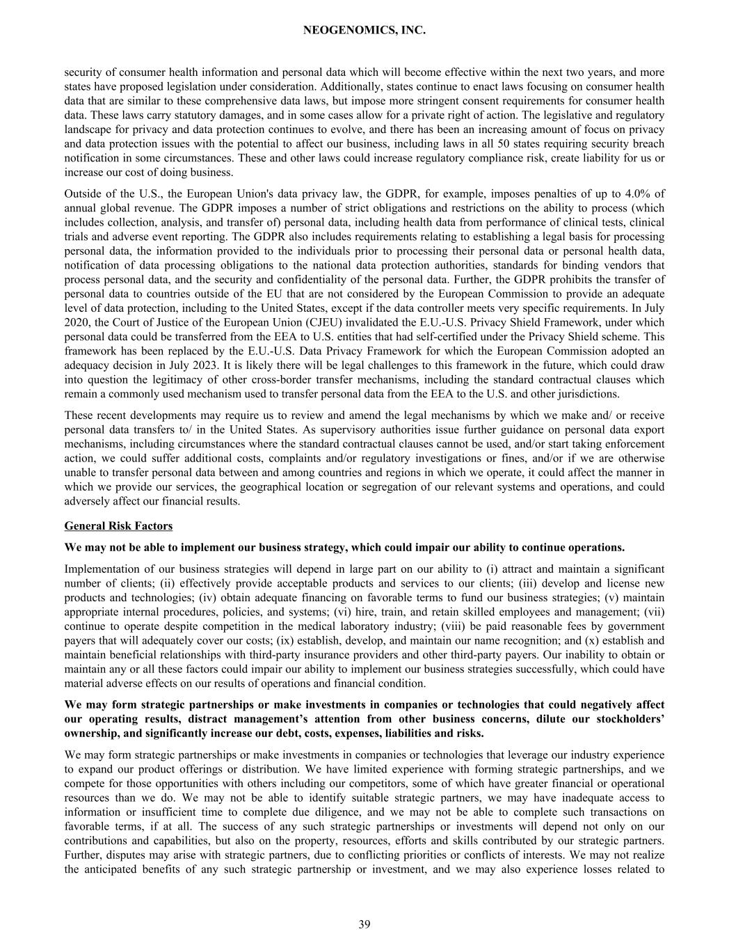 security of consumer health information and personal data which will become effective within the next two years, and more states have proposed legislation under consideration. Additionally, states continue to enact laws focusing on consumer health data that are similar to these comprehensive data laws, but impose more stringent consent requirements for consumer health data. These laws carry statutory damages, and in some cases allow for a private right of action. The legislative and regulatory landscape for privacy and data protection continues to evolve, and there has been an increasing amount of focus on privacy and data protection issues with the potential to affect our business, including laws in all 50 states requiring security breach notification in some circumstances. These and other laws could increase regulatory compliance risk, create liability for us or increase our cost of doing business. Outside of the U.S., the European Union's data privacy law, the GDPR, for example, imposes penalties of up to 4.0% of annual global revenue. The GDPR imposes a number of strict obligations and restrictions on the ability to process (which includes collection, analysis, and transfer of) personal data, including health data from performance of clinical tests, clinical trials and adverse event reporting. The GDPR also includes requirements relating to establishing a legal basis for processing personal data, the information provided to the individuals prior to processing their personal data or personal health data, notification of data processing obligations to the national data protection authorities, standards for binding vendors that process personal data, and the security and confidentiality of the personal data. Further, the GDPR prohibits the transfer of personal data to countries outside of the EU that are not considered by the European Commission to provide an adequate level of data protection, including to the United States, except if the data controller meets very specific requirements. In July 2020, the Court of Justice of the European Union (CJEU) invalidated the E.U.-U.S. Privacy Shield Framework, under which personal data could be transferred from the EEA to U.S. entities that had self-certified under the Privacy Shield scheme. This framework has been replaced by the E.U.-U.S. Data Privacy Framework for which the European Commission adopted an adequacy decision in July 2023. It is likely there will be legal challenges to this framework in the future, which could draw into question the legitimacy of other cross-border transfer mechanisms, including the standard contractual clauses which remain a commonly used mechanism used to transfer personal data from the EEA to the U.S. and other jurisdictions. These recent developments may require us to review and amend the legal mechanisms by which we make and/ or receive personal data transfers to/ in the United States. As supervisory authorities issue further guidance on personal data export mechanisms, including circumstances where the standard contractual clauses cannot be used, and/or start taking enforcement action, we could suffer additional costs, complaints and/or regulatory investigations or fines, and/or if we are otherwise unable to transfer personal data between and among countries and regions in which we operate, it could affect the manner in which we provide our services, the geographical location or segregation of our relevant systems and operations, and could adversely affect our financial results. General Risk Factors We may not be able to implement our business strategy, which could impair our ability to continue operations. Implementation of our business strategies will depend in large part on our ability to (i) attract and maintain a significant number of clients; (ii) effectively provide acceptable products and services to our clients; (iii) develop and license new products and technologies; (iv) obtain adequate financing on favorable terms to fund our business strategies; (v) maintain appropriate internal procedures, policies, and systems; (vi) hire, train, and retain skilled employees and management; (vii) continue to operate despite competition in the medical laboratory industry; (viii) be paid reasonable fees by government payers that will adequately cover our costs; (ix) establish, develop, and maintain our name recognition; and (x) establish and maintain beneficial relationships with third-party insurance providers and other third-party payers. Our inability to obtain or maintain any or all these factors could impair our ability to implement our business strategies successfully, which could have material adverse effects on our results of operations and financial condition. We may form strategic partnerships or make investments in companies or technologies that could negatively affect our operating results, distract management’s attention from other business concerns, dilute our stockholders’ ownership, and significantly increase our debt, costs, expenses, liabilities and risks. We may form strategic partnerships or make investments in companies or technologies that leverage our industry experience to expand our product offerings or distribution. We have limited experience with forming strategic partnerships, and we compete for those opportunities with others including our competitors, some of which have greater financial or operational resources than we do. We may not be able to identify suitable strategic partners, we may have inadequate access to information or insufficient time to complete due diligence, and we may not be able to complete such transactions on favorable terms, if at all. The success of any such strategic partnerships or investments will depend not only on our contributions and capabilities, but also on the property, resources, efforts and skills contributed by our strategic partners. Further, disputes may arise with strategic partners, due to conflicting priorities or conflicts of interests. W