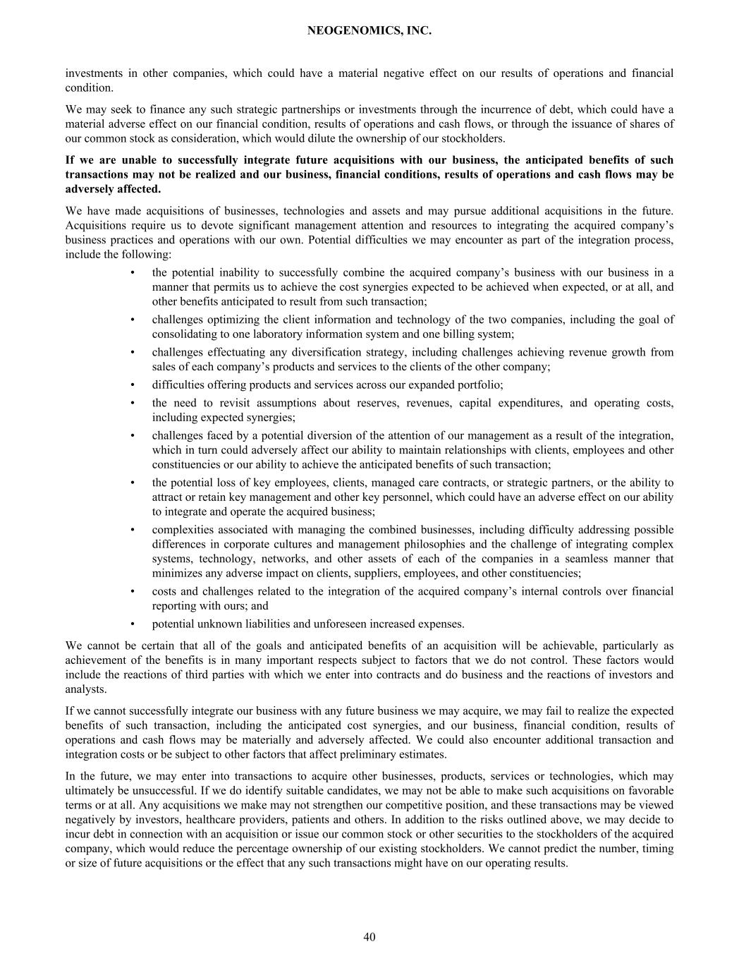 investments in other companies, which could have a material negative effect on our results of operations and financial condition. We may seek to finance any such strategic partnerships or investments through the incurrence of debt, which could have a material adverse effect on our financial condition, results of operations and cash flows, or through the issuance of shares of our common stock as consideration, which would dilute the ownership of our stockholders. If we are unable to successfully integrate future acquisitions with our business, the anticipated benefits of such transactions may not be realized and our business, financial conditions, results of operations and cash flows may be adversely affected. We have made acquisitions of businesses, technologies and assets and may pursue additional acquisitions in the future. Acquisitions require us to devote significant management attention and resources to integrating the acquired company’s business practices and operations with our own. Potential difficulties we may encounter as part of the integration process, include the following: • the potential inability to successfully combine the acquired company’s business with our business in a manner that permits us to achieve the cost synergies expected to be achieved when expected, or at all, and other benefits anticipated to result from such transaction; • challenges optimizing the client information and technology of the two companies, including the goal of consolidating to one laboratory information system and one billing system; • challenges effectuating any diversification strategy, including challenges achieving revenue growth from sales of each company’s products and services to the clients of the other company; • difficulties offering products and services across our expanded portfolio; • the need to revisit assumptions about reserves, revenues, capital expenditures, and operating costs, including expected synergies; • challenges faced by a potential diversion of the attention of our management as a result of the integration, which in turn could adversely affect our ability to maintain relationships with clients, employees and other constituencies or our ability to achieve the anticipated benefits of such transaction; • the potential loss of key employees, clients, managed care contracts, or strategic partners, or the ability to attract or retain key management and other key personnel, which could have an adverse effect on our ability to integrate and operate the acquired business; • complexities associated with managing the combined businesses, including difficulty addressing possible differences in corporate cultures and management philosophies and the challenge of integrating complex systems, technology, networks, and other assets of each of the companies in a seamless manner that minimizes any adverse impact on clients, suppliers, employees, and other constituencies; • costs and challenges related to the integration of the acquired company’s internal controls over financial reporting with ours; and • potential unknown liabilities and unforeseen increased expenses. We cannot be certain that all of the goals and anticipated benefits of an acquisition will be achievable, particularly as achievement of the benefits is in many important respects subject to factors that we do not control. These factors would include the reactions of third parties with which we enter into contracts and do business and the reactions of investors and analysts. If we cannot successfully integrate our business with any future business we may acquire, we may fail to realize the expected benefits of such transaction, including the anticipated cost synergies, and our business, financial condition, results of operations and cash flows may be materially and adversely affected. We could also encounter additional transaction and integration costs or be subject to other factors that affect preliminary estimates. In the future, we may enter into transactions to acquire other businesses, products, services or technologies, which may ultimately be unsuccessful. If we do identify suitable candidates, we may not be able to make such acquisitions on favorable terms or at all. Any acquisitions we make may not strengthen our competitive position, and these transactions may be viewed negatively by investors, healthcare providers, patients and others. In addition to the risks outlined above, we may decide to incur debt in connection with an acquisition or issue our common stock or other securities to the stockholders of the acquired company, which would reduce the percentage ownership of our existing stockholders. We cannot predict the number, timing or size of future acquisitions or the effect that any such transactions might have on our operating results. NEOGENOMICS, INC. 40