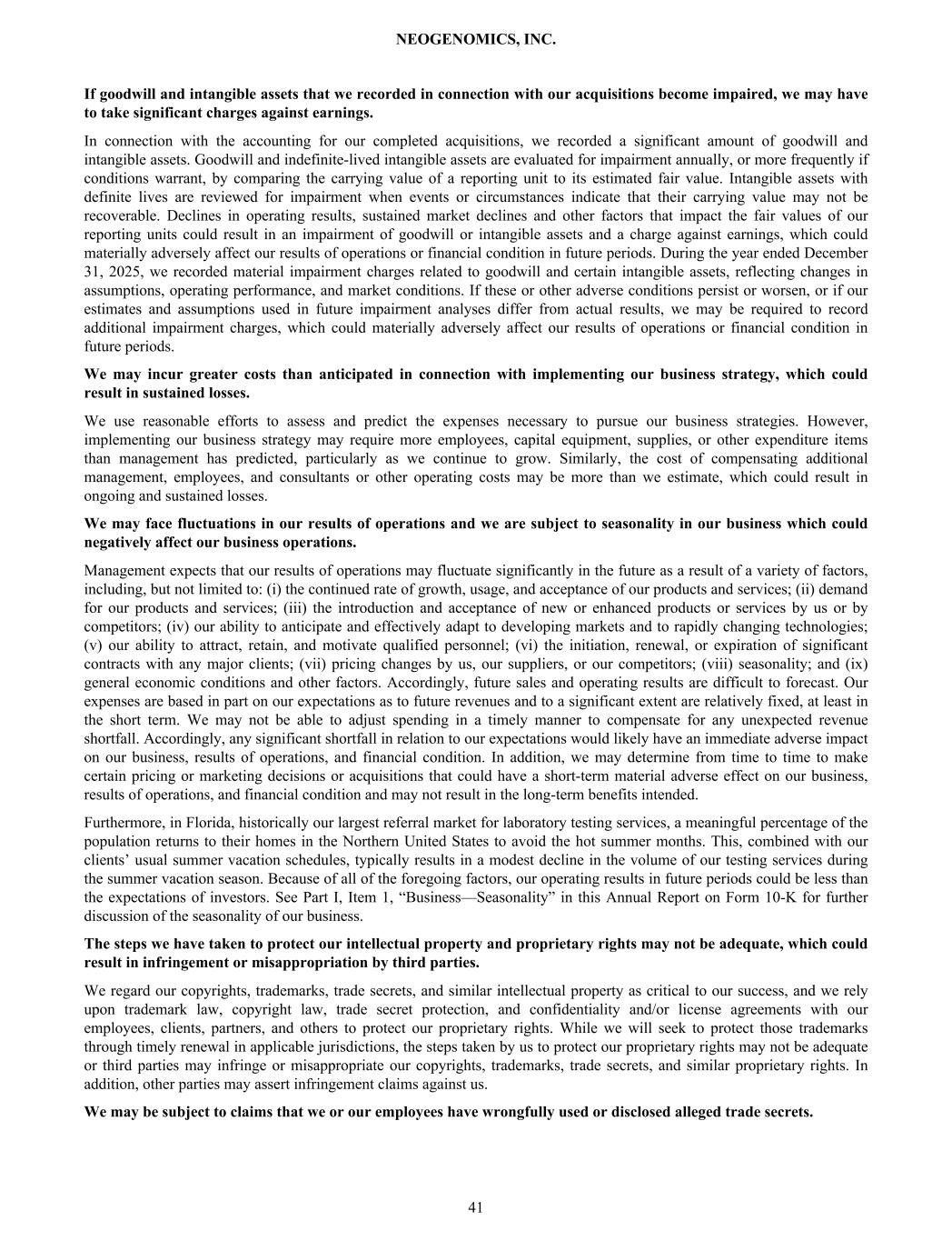 If goodwill and intangible assets that we recorded in connection with our acquisitions become impaired, we may have to take significant charges against earnings. In connection with the accounting for our completed acquisitions, we recorded a significant amount of goodwill and intangible assets. Goodwill and indefinite-lived intangible assets are evaluated for impairment annually, or more frequently if conditions warrant, by comparing the carrying value of a reporting unit to its estimated fair value. Intangible assets with definite lives are reviewed for impairment when events or circumstances indicate that their carrying value may not be recoverable. Declines in operating results, sustained market declines and other factors that impact the fair values of our reporting units could result in an impairment of goodwill or intangible assets and a charge against earnings, which could materially adversely affect our results of operations or financial condition in future periods. During the year ended December 31, 2025, we recorded material impairment charges related to goodwill and certain intangible assets, reflecting changes in assumptions, operating performance, and market conditions. If these or other adverse conditions persist or worsen, or if our estimates and assumptions used in future impairment analyses differ from actual results, we may be required to record additional impairment charges, which could materially adversely affect our results of operations or financial condition in future periods. We may incur greater costs than anticipated in connection with implementing our business strategy, which could result in sustained losses. We use reasonable efforts to assess and predict the expenses necessary to pursue our business strategies. However, implementing our business strategy may require more employees, capital equipment, supplies, or other expenditure items than management has predicted, particularly as we continue to grow. Similarly, the cost of compensating additional management, employees, and consultants or other operating costs may be more than we estimate, which could result in ongoing and sustained losses. We may face fluctuations in our results of operations and we are subject to seasonality in our business which could negatively affect our business operations. Management expects that our results of operations may fluctuate significantly in the future as a result of a variety of factors, including, but not limited to: (i) the continued rate of growth, usage, and acceptance of our products and services; (ii) demand for our products and services; (iii) the introduction and acceptance of new or enhanced products or services by us or by competitors; (iv) our ability to anticipate and effectively adapt to developing markets and to rapidly changing technologies; (v) our ability to attract, retain, and motivate qualified personnel; (vi) the initiation, renewal, or expiration of significant contracts with any major clients; (vii) pricing changes by us, our suppliers, or our competitors; (viii) seasonality; and (ix) general economic conditions and other factors. Accordingly, future sales and operating results are difficult to forecast. Our expenses are based in part on our expectations as to future revenues and to a significant extent are relatively fixed, at least in the short term. We may not be able to adjust spending in a timely manner to compensate for any unexpected revenue shortfall. Accordingly, any significant shortfall in relation to our expectations would likely have an immediate adverse impact on our business, results of operations, and financial condition. In addition, we may determine from time to time to make certain pricing or marketing decisions or acquisitions that could have a short-term material adverse effect on our business, results of operations, and financial condition and may not result in the long-term benefits intended. Furthermore, in Florida, historically our largest referral market for laboratory testing services, a meaningful percentage of the population returns to their homes in the Northern United States to avoid the hot summer months. This, combined with our clients’ usual summer vacation schedules, typically results in a modest decline in the volume of our testing services during the summer vacation season. Because of all of the foregoing factors, our operating results in future periods could be less than the expectations of investors. See Part I, Item 1, “Business—Seasonality” in this Annual Report on Form 10-K for further discussion of the seasonality of our business. The steps we have taken to protect our intellectual property and proprietary rights may not be adequate, which could result in infringement or misappropriation by third parties. We regard our copyrights, trademarks, trade secrets, and similar intellectual property as critical to our success, and we rely upon trademark law, copyright law, trade secret protection, and confidentiality and/or license agreements with our employees, clients, partners, and others to protect our proprietary rights. While we will seek to protect those trademarks through timely renewal in applicable jurisdictions, the steps taken by us to protect our proprietary rights may not be adequate or third parties may infringe or misappropriate our copyrights, trademarks, trade secrets, and similar proprietary rights. In addition, other parties may assert infringement claims against us. We may be subject to claims that we or our employees have wrongfully used or disclosed alleged trade secrets. NEOGENOMICS, INC. 41