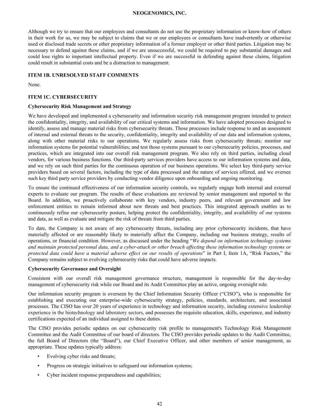 Although we try to ensure that our employees and consultants do not use the proprietary information or know-how of others in their work for us, we may be subject to claims that we or our employees or consultants have inadvertently or otherwise used or disclosed trade secrets or other proprietary information of a former employer or other third parties. Litigation may be necessary to defend against these claims, and if we are unsuccessful, we could be required to pay substantial damages and could lose rights to important intellectual property. Even if we are successful in defending against these claims, litigation could result in substantial costs and be a distraction to management. ITEM 1B. UNRESOLVED STAFF COMMENTS None. ITEM 1C. CYBERSECURITY Cybersecurity Risk Management and Strategy We have developed and implemented a cybersecurity and information security risk management program intended to protect the confidentiality, integrity, and availability of our critical systems and information. We have adopted processes designed to identify, assess and manage material risks from cybersecurity threats. Those processes include response to and an assessment of internal and external threats to the security, confidentiality, integrity and availability of our data and information systems, along with other material risks to our operations. We regularly assess risks from cybersecurity threats; monitor our information systems for potential vulnerabilities; and test those systems pursuant to our cybersecurity policies, processes, and practices, which are integrated into our overall risk management program. We also rely on third parties, including cloud vendors, for various business functions. Our third-party services providers have access to our information systems and data, and we rely on such third parties for the continuous operation of our business operations. We select key third-party service providers based on several factors, including the type of data processed and the nature of services offered, and we oversee such key third party service providers by conducting vendor diligence upon onboarding and ongoing monitoring. To ensure the continued effectiveness of our information security controls, we regularly engage both internal and external experts to evaluate our program. The results of these evaluations are reviewed by senior management and reported to the Board. In addition, we proactively collaborate with key vendors, industry peers, and relevant government and law enforcement entities to remain informed about new threats and best practices. This integrated approach enables us to continuously refine our cybersecurity posture, helping protect the confidentiality, integrity, and availability of our systems and data, as well as evaluate and mitigate the risk of threats from third parties. To date, the Company is not aware of any cybersecurity threats, including any prior cybersecurity incidents, that have materially affected or are reasonably likely to materially affect the Company, including our business strategy, results of operations, or financial condition. However, as discussed under the heading “We depend on information technology systems and maintain protected personal data, and a cyber-attack or other breach affecting these information technology systems or protected data could have a material adverse effect on our results of operations” in Part I, Item 1A, “Risk Factors,” the Company remains subject to evolving cybersecurity risks that could have adverse impacts. Cybersecurity Governance and Oversight Consistent with our overall risk management governance structure, management is responsible for the day-to-day management of cybersecurity risk while our Board and its Audit Committee play an active, ongoing oversight role. Our information security program is overseen by the Chief Information Security Officer (“CISO”), who is responsible for establishing and executing our enterprise-wide cybersecurity strategy, policies, standards, architecture, and associated processes. The CISO has over 20 years of experience in technology and information security, including extensive leadership experience in the biotechnology and laboratory sectors, and possesses the requisite education, skills, experience, and industry certifications expected of an individual assigned to these duties. The CISO provides periodic updates on our cybersecurity risk profile to management's Technology Risk Management Committee and the Audit Committee of our board of directors. The CISO provides periodic updates to the Audit Committee, the full Board of Directors (the “Board”), our Chief Executive Officer, and other members of senior management, as appropriate. These updates typically address: • Evolving cyber risks and threats; • Progress on strategic initiatives to safeguard our information systems; • Cyber incident response preparedness and capabilities; NEOGENOMICS, INC. 42