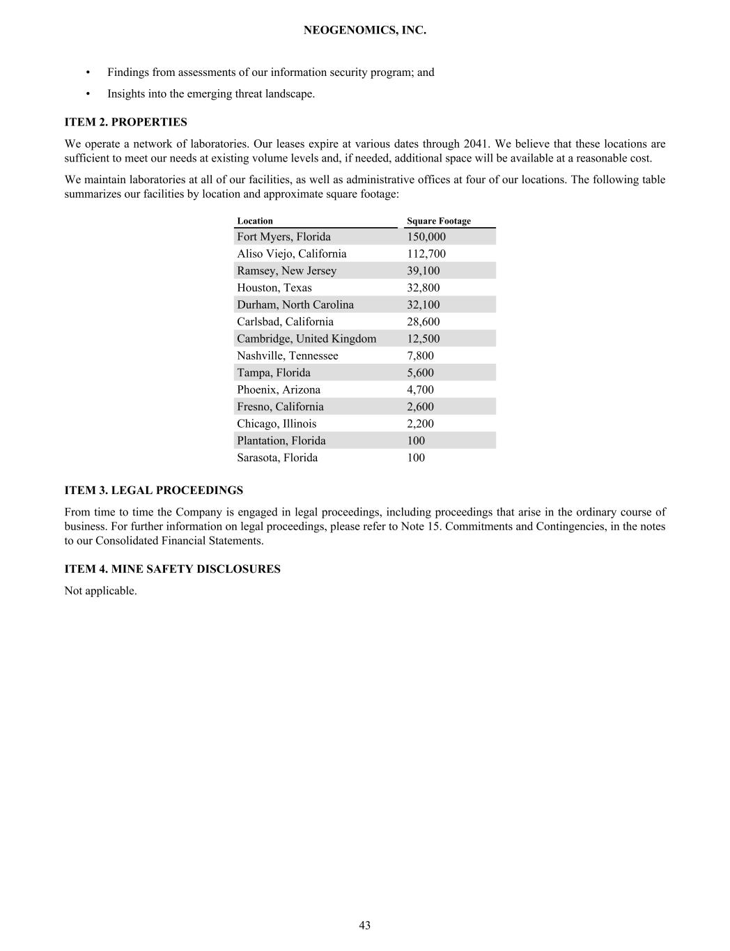 • Findings from assessments of our information security program; and • Insights into the emerging threat landscape. ITEM 2. PROPERTIES We operate a network of laboratories. Our leases expire at various dates through 2041. We believe that these locations are sufficient to meet our needs at existing volume levels and, if needed, additional space will be available at a reasonable cost. We maintain laboratories at all of our facilities, as well as administrative offices at four of our locations. The following table summarizes our facilities by location and approximate square footage: Location Square Footage Fort Myers, Florida 150,000 Aliso Viejo, California 112,700 Ramsey, New Jersey 39,100 Houston, Texas 32,800 Durham, North Carolina 32,100 Carlsbad, California 28,600 Cambridge, United Kingdom 12,500 Nashville, Tennessee 7,800 Tampa, Florida 5,600 Phoenix, Arizona 4,700 Fresno, California 2,600 Chicago, Illinois 2,200 Plantation, Florida 100 Sarasota, Florida 100 ITEM 3. LEGAL PROCEEDINGS From time to time the Company is engaged in legal proceedings, including proceedings that arise in the ordinary course of business. For further information on legal proceedings, please refer to Note 15. Commitments and Contingencies, in the notes to our Consolidated Financial Statements. ITEM 4. MINE SAFETY DISCLOSURES Not applicable. NEOGENOMICS, INC. 43