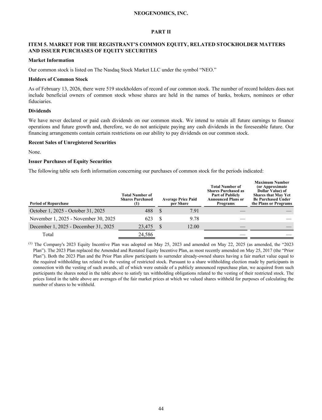 PART II ITEM 5. MARKET FOR THE REGISTRANT’S COMMON EQUITY, RELATED STOCKHOLDER MATTERS AND ISSUER PURCHASES OF EQUITY SECURITIES Market Information Our common stock is listed on The Nasdaq Stock Market LLC under the symbol “NEO.” Holders of Common Stock As of February 13, 2026, there were 519 stockholders of record of our common stock. The number of record holders does not include beneficial owners of common stock whose shares are held in the names of banks, brokers, nominees or other fiduciaries. Dividends We have never declared or paid cash dividends on our common stock. We intend to retain all future earnings to finance operations and future growth and, therefore, we do not anticipate paying any cash dividends in the foreseeable future. Our financing arrangements contain certain restrictions on our ability to pay dividends on our common stock. Recent Sales of Unregistered Securities None. Issuer Purchases of Equity Securities The following table sets forth information concerning our purchases of common stock for the periods indicated: Period of Repurchase Total Number of Shares Purchased (1) Average Price Paid per Share Total Number of Shares Purchased as Part of Publicly Announced Plans or Programs Maximum Number (or Approximate Dollar Value) of Shares that May Yet Be Purchased Under the Plans or Programs October 1, 2025 - October 31, 2025 488 $ 7.91 — — November 1, 2025 - November 30, 2025 623 $ 9.78 — — December 1, 2025 - December 31, 2025 23,475 $ 12.00 — — Total 24,586 — — (1) The Company's 2023 Equity Incentive Plan was adopted on May 25, 2023 and amended on May 22, 2025 (as amended, the “2023 Plan”). The 2023 Plan replaced the Amended and Restated Equity Incentive Plan, as most recently amended on May 25, 2017 (the “Prior Plan”). Both the 2023 Plan and the Prior Plan allow participants to surrender already-owned shares having a fair market value equal to the required withholding tax related to the vesting of restricted stock. Pursuant to a share withholding election made by participants in connection with the vesting of such awards, all of which were outside of a publicly announced repurchase plan, we acquired from such participants the shares noted in the table above to satisfy tax withholding obligations related to the vesting of their restricted stock. The prices listed in the table above are averages of the fair market prices at which we valued shares withheld for purposes of calculating the number of shares to be withheld. NEOGENOMICS, INC. 44