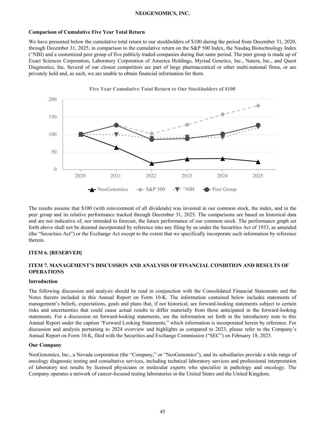 Comparison of Cumulative Five Year Total Return We have presented below the cumulative total return to our stockholders of $100 during the period from December 31, 2020, through December 31, 2025, in comparison to the cumulative return on the S&P 500 Index, the Nasdaq Biotechnology Index (^NBI) and a customized peer group of five publicly traded companies during that same period. The peer group is made up of Exact Sciences Corporation, Laboratory Corporation of America Holdings, Myriad Genetics, Inc., Natera, Inc., and Quest Diagnostics, Inc. Several of our closest competitors are part of large pharmaceutical or other multi-national firms, or are privately held and, as such, we are unable to obtain financial information for them. Five Year Cumulative Total Return to Our Stockholders of $100 NeoGenomics S&P 500 ^NBI Peer Group 2020 2021 2022 2023 2024 2025 0 50 100 150 200 The results assume that $100 (with reinvestment of all dividends) was invested in our common stock, the index, and in the peer group and its relative performance tracked through December 31, 2025. The comparisons are based on historical data and are not indicative of, nor intended to forecast, the future performance of our common stock. The performance graph set forth above shall not be deemed incorporated by reference into any filing by us under the Securities Act of 1933, as amended (the “Securities Act”) or the Exchange Act except to the extent that we specifically incorporate such information by reference therein. ITEM 6. [RESERVED] ITEM 7. MANAGEMENT’S DISCUSSION AND ANALYSIS OF FINANCIAL CONDITION AND RESULTS OF OPERATIONS Introduction The following discussion and analysis should be read in conjunction with the Consolidated Financial Statements and the Notes thereto included in this Annual Report on Form 10-K. The information contained below includes statements of management’s beliefs, expectations, goals and plans that, if not historical, are forward-looking statements subject to certain risks and uncertainties that could cause actual results to differ materially from those anticipated in the forward-looking statements. For a discussion on forward-looking statements, see the information set forth in the introductory note to this Annual Report under the caption “Forward Looking Statements,” which information is incorporated herein by reference. For discussion and analysis pertaining to 2024 overview and highlights as compared to 2023, please refer to the Company’s Annual Report on Form 10-K, filed with the Securities and Exchange Commission (“SEC”) on February 18, 2025. Our Company NeoGenomics, Inc., a Nevada corporation (the “Company,” or “NeoGenomics”), and its subsidiaries provide a wide range of oncology diagnostic testing and consultative services, including technical laboratory services and professional interpretation of laboratory test results by licensed physicians or molecular experts who specialize in pathology and oncology. The Company operates a network of cancer-focused testing laboratories in the United States and the United Kingdom. NEOGENOMICS, INC. 45