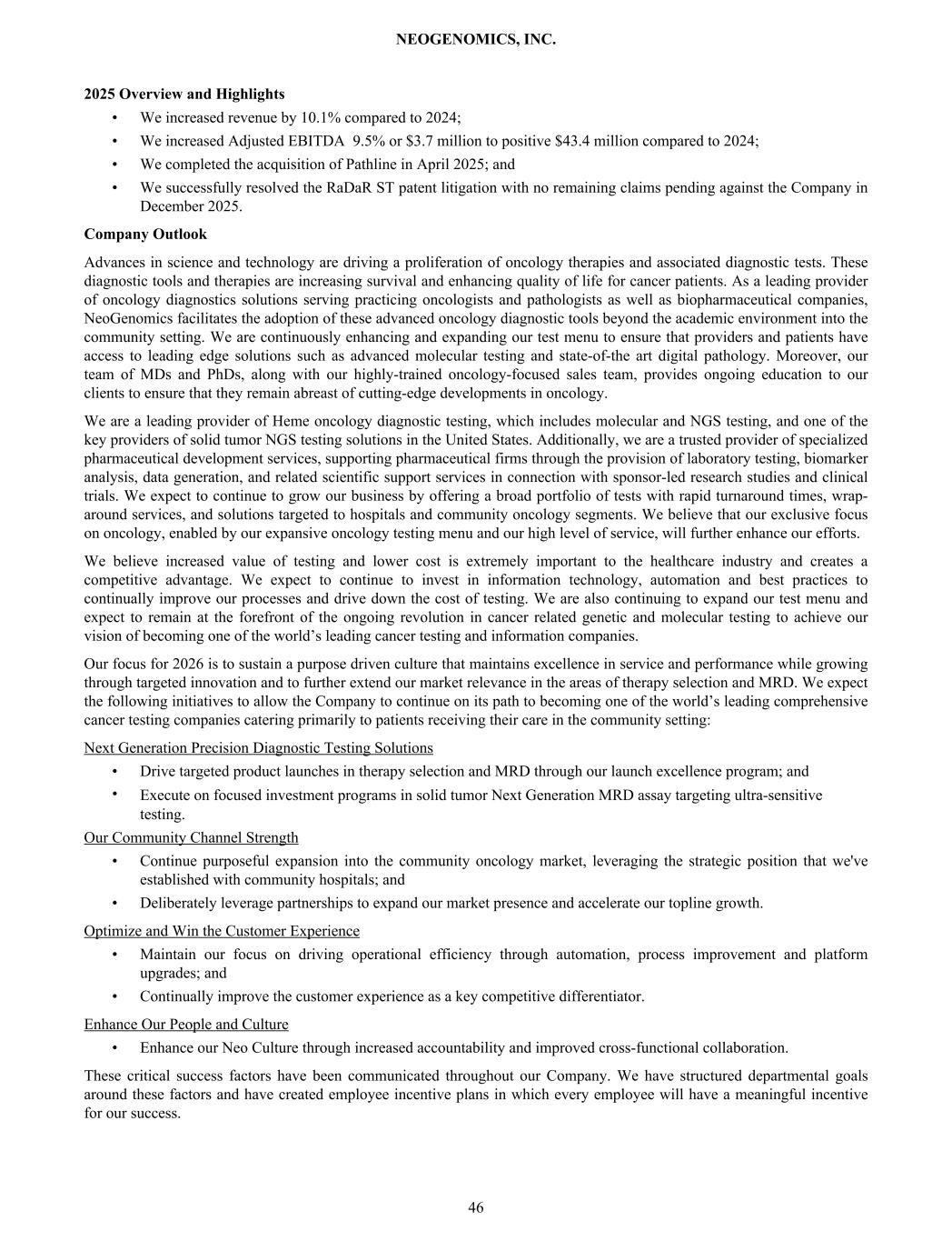 2025 Overview and Highlights • We increased revenue by 10.1% compared to 2024; • We increased Adjusted EBITDA 9.5% or $3.7 million to positive $43.4 million compared to 2024; • We completed the acquisition of Pathline in April 2025; and • We successfully resolved the RaDaR ST patent litigation with no remaining claims pending against the Company in December 2025. Company Outlook Advances in science and technology are driving a proliferation of oncology therapies and associated diagnostic tests. These diagnostic tools and therapies are increasing survival and enhancing quality of life for cancer patients. As a leading provider of oncology diagnostics solutions serving practicing oncologists and pathologists as well as biopharmaceutical companies, NeoGenomics facilitates the adoption of these advanced oncology diagnostic tools beyond the academic environment into the community setting. We are continuously enhancing and expanding our test menu to ensure that providers and patients have access to leading edge solutions such as advanced molecular testing and state-of-the art digital pathology. Moreover, our team of MDs and PhDs, along with our highly-trained oncology-focused sales team, provides ongoing education to our clients to ensure that they remain abreast of cutting-edge developments in oncology. We are a leading provider of Heme oncology diagnostic testing, which includes molecular and NGS testing, and one of the key providers of solid tumor NGS testing solutions in the United States. Additionally, we are a trusted provider of specialized pharmaceutical development services, supporting pharmaceutical firms through the provision of laboratory testing, biomarker analysis, data generation, and related scientific support services in connection with sponsor-led research studies and clinical trials. We expect to continue to grow our business by offering a broad portfolio of tests with rapid turnaround times, wrap- around services, and solutions targeted to hospitals and community oncology segments. We believe that our exclusive focus on oncology, enabled by our expansive oncology testing menu and our high level of service, will further enhance our efforts. We believe increased value of testing and lower cost is extremely important to the healthcare industry and creates a competitive advantage. We expect to continue to invest in information technology, automation and best practices to continually improve our processes and drive down the cost of testing. We are also continuing to expand our test menu and expect to remain at the forefront of the ongoing revolution in cancer related genetic and molecular testing to achieve our vision of becoming one of the world’s leading cancer testing and information companies. Our focus for 2026 is to sustain a purpose driven culture that maintains excellence in service and performance while growing through targeted innovation and to further extend our market relevance in the areas of therapy selection and MRD. We expect the following initiatives to allow the Company to continue on its path to becoming one of the world’s leading comprehensive cancer testing companies catering primarily to patients receiving their care in the community setting: Next Generation Precision Diagnostic Testing Solutions • Drive targeted product launches in therapy selection and MRD through our launch excellence program; and Execute on focused investment programs in solid tumor Next Generation MRD assay targeting ultra-sensitive testing. Our Community Channel Strength • Continue purposeful expansion into the community oncology market, leveraging the strategic position that we've established with community hospitals; and • Deliberately leverage partnerships to expand our market presence and accelerate our topline growth. Optimize and Win the Customer Experience • Maintain our focus on driving operational efficiency through automation, process improvement and platform upgrades; and • Continually improve the customer experience as a key competitive differentiator. Enhance Our People and Culture • Enhance our Neo Culture through increased accountability and improved cross-functional collaboration. These critical success factors have been communicated throughout our Company. We have structured departmental goals around these factors and have created employee incentive plans in which every employee will have a meaningful incentive for our success. NEOGENOMICS, INC. 46 •