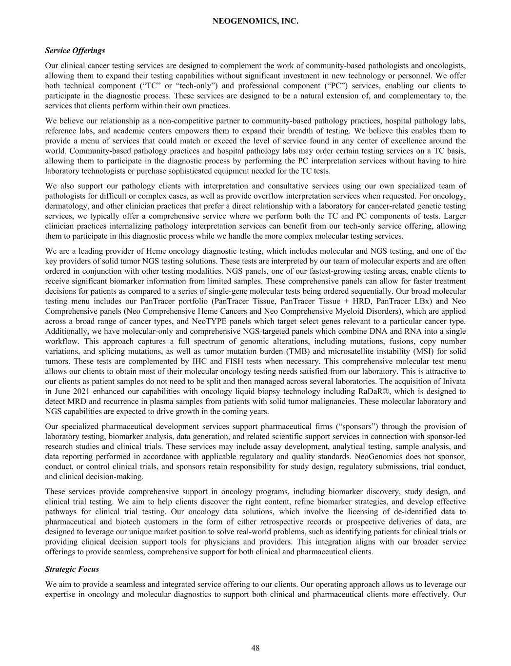 Service Offerings Our clinical cancer testing services are designed to complement the work of community-based pathologists and oncologists, allowing them to expand their testing capabilities without significant investment in new technology or personnel. We offer both technical component (“TC” or “tech-only”) and professional component (“PC”) services, enabling our clients to participate in the diagnostic process. These services are designed to be a natural extension of, and complementary to, the services that clients perform within their own practices. We believe our relationship as a non-competitive partner to community-based pathology practices, hospital pathology labs, reference labs, and academic centers empowers them to expand their breadth of testing. We believe this enables them to provide a menu of services that could match or exceed the level of service found in any center of excellence around the world. Community-based pathology practices and hospital pathology labs may order certain testing services on a TC basis, allowing them to participate in the diagnostic process by performing the PC interpretation services without having to hire laboratory technologists or purchase sophisticated equipment needed for the TC tests. We also support our pathology clients with interpretation and consultative services using our own specialized team of pathologists for difficult or complex cases, as well as provide overflow interpretation services when requested. For oncology, dermatology, and other clinician practices that prefer a direct relationship with a laboratory for cancer-related genetic testing services, we typically offer a comprehensive service where we perform both the TC and PC components of tests. Larger clinician practices internalizing pathology interpretation services can benefit from our tech-only service offering, allowing them to participate in this diagnostic process while we handle the more complex molecular testing services. We are a leading provider of Heme oncology diagnostic testing, which includes molecular and NGS testing, and one of the key providers of solid tumor NGS testing solutions. These tests are interpreted by our team of molecular experts and are often ordered in conjunction with other testing modalities. NGS panels, one of our fastest-growing testing areas, enable clients to receive significant biomarker information from limited samples. These comprehensive panels can allow for faster treatment decisions for patients as compared to a series of single-gene molecular tests being ordered sequentially. Our broad molecular testing menu includes our PanTracer portfolio (PanTracer Tissue, PanTracer Tissue + HRD, PanTracer LBx) and Neo Comprehensive panels (Neo Comprehensive Heme Cancers and Neo Comprehensive Myeloid Disorders), which are applied across a broad range of cancer types, and NeoTYPE panels which target select genes relevant to a particular cancer type. Additionally, we have molecular-only and comprehensive NGS-targeted panels which combine DNA and RNA into a single workflow. This approach captures a full spectrum of genomic alterations, including mutations, fusions, copy number variations, and splicing mutations, as well as tumor mutation burden (TMB) and microsatellite instability (MSI) for solid tumors. These tests are complemented by IHC and FISH tests when necessary. This comprehensive molecular test menu allows our clients to obtain most of their molecular oncology testing needs satisfied from our laboratory. This is attractive to our clients as patient samples do not need to be split and then managed across several laboratories. The acquisition of Inivata in June 2021 enhanced our capabilities with oncology liquid biopsy technology including RaDaR®, which is designed to detect MRD and recurrence in plasma samples from patients with solid tumor malignancies. These molecular laboratory and NGS capabilities are expected to drive growth in the coming years. Our specialized pharmaceutical development services support pharmaceutical firms (“sponsors”) through the provision of laboratory testing, biomarker analysis, data generation, and related scientific support services in connection with sponsor-led research studies and clinical trials. These services may include assay development, analytical testing, sample analysis, and data reporting performed in accordance with applicable regulatory and quality standards. NeoGenomics does not sponsor, conduct, or control clinical trials, and sponsors retain responsibility for study design, regulatory submissions, trial conduct, and clinical decision-making. These services provide comprehensive support in oncology programs, including biomarker discovery, study design, and clinical trial testing. We aim to help clients discover the right content, refine biomarker strategies, and develop effective pathways for clinical trial testing. Our oncology data solutions, which involve the licensing of de-identified data to pharmaceutical and biotech customers in the form of either retrospective records or prospective deliveries of data, are designed to leverage our unique market position to solve real-world problems, such as identifying patients for clinical trials or providing clinical decision support tools for physicians and providers. This integration aligns with our broader service offerings to provide seamless, comprehensive support for both clinical and pharmaceutical clients. Strategic Focus We aim to provide a seamless and integrated service offering to our clients. Our operating approach allows us to leverage our expertise in oncology and molecular diagnostics to support both clinical and pharmaceutical clients more effectively. Our NEOGENOMICS, INC. 48
